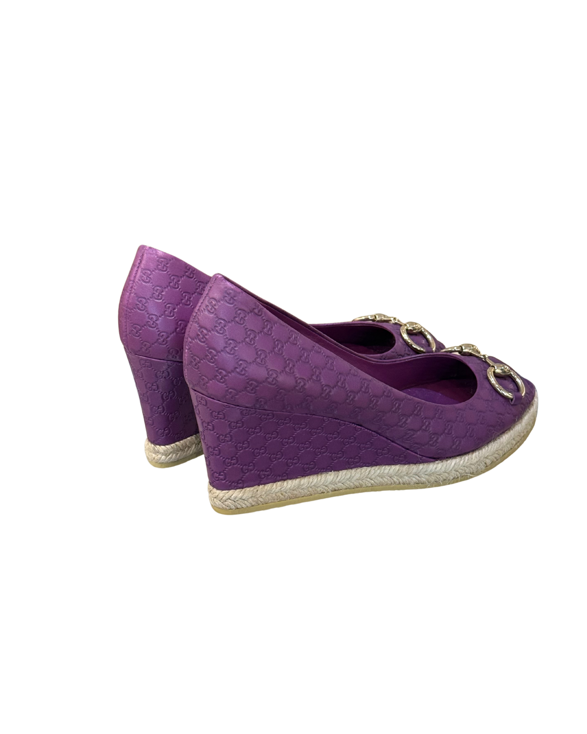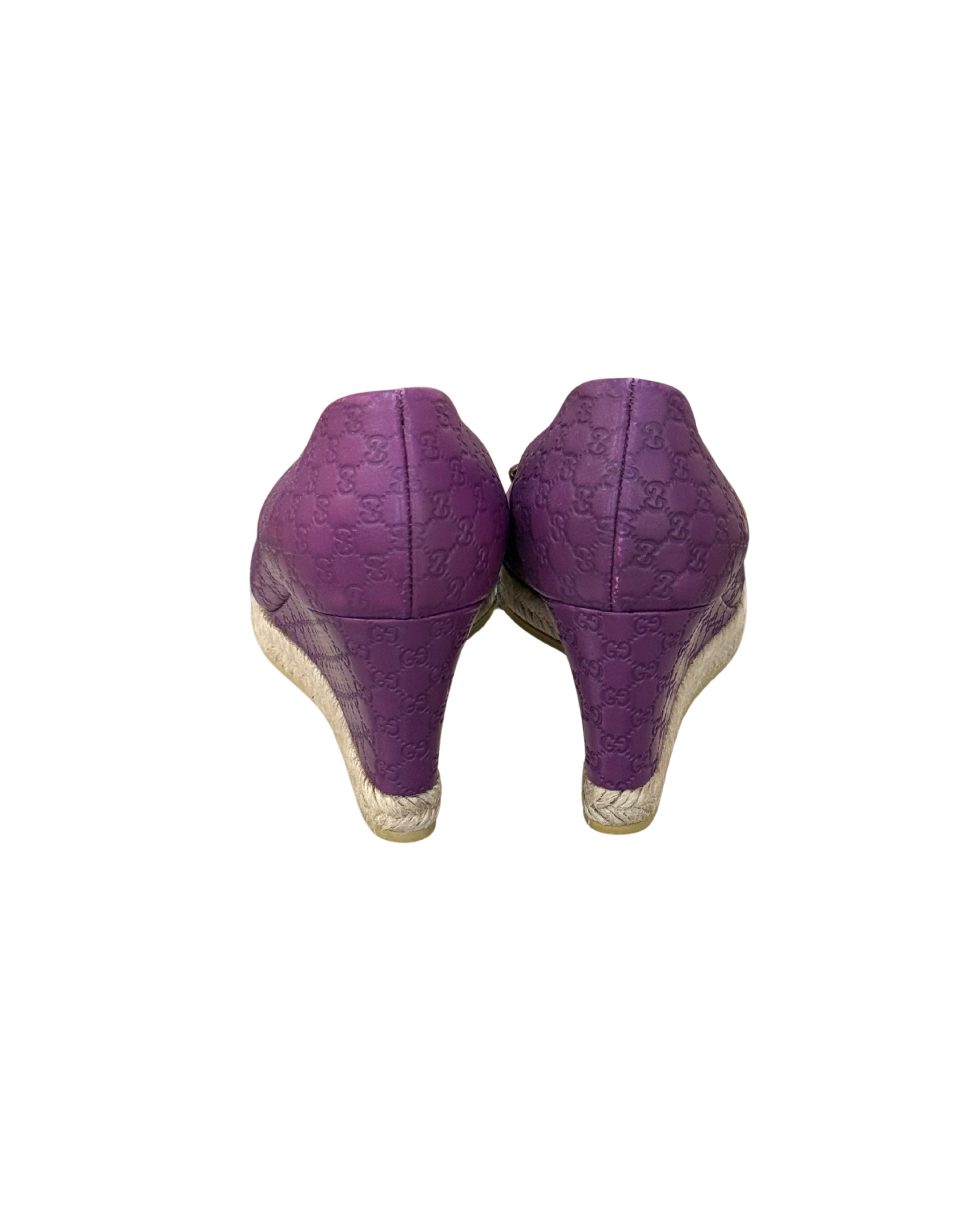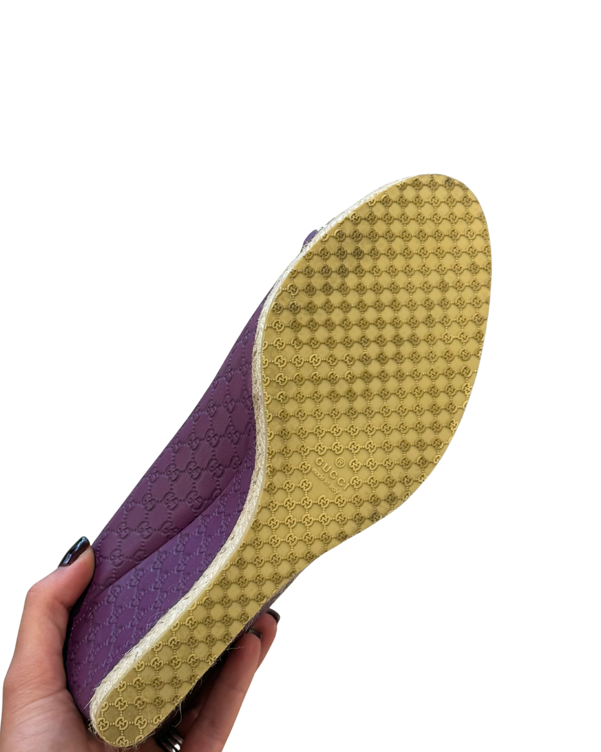Un tocco di colore e carattere firmato Gucci: queste espadrillas con zeppa sono realizzate in pelle viola goffrata GG e impreziosite dal classico morsetto in metallo argentato. La zeppa in corda naturale e la suola in gomma con logo inciso aggiungono comfort e stile. Modello open toe. Tacco circa 7,5cm