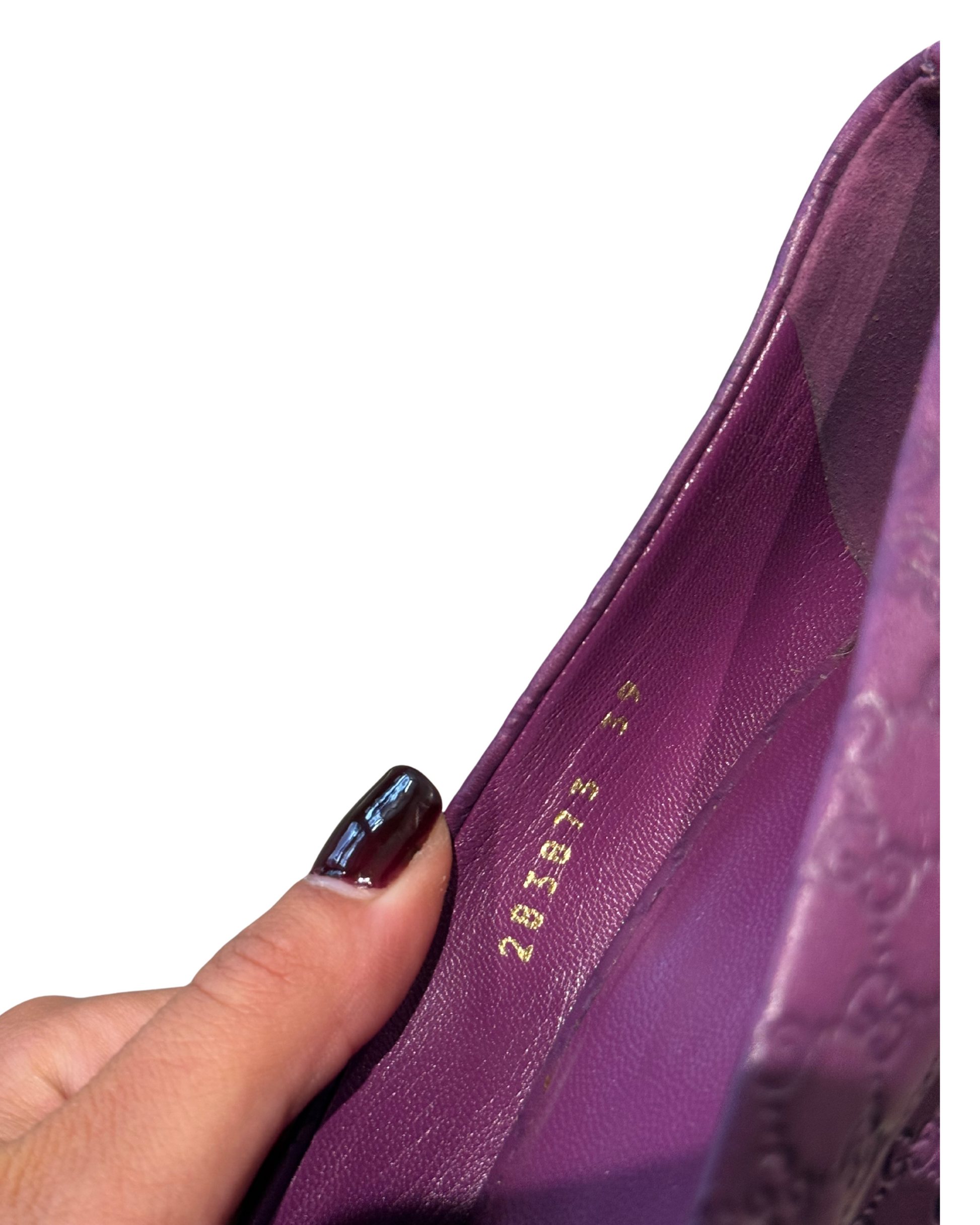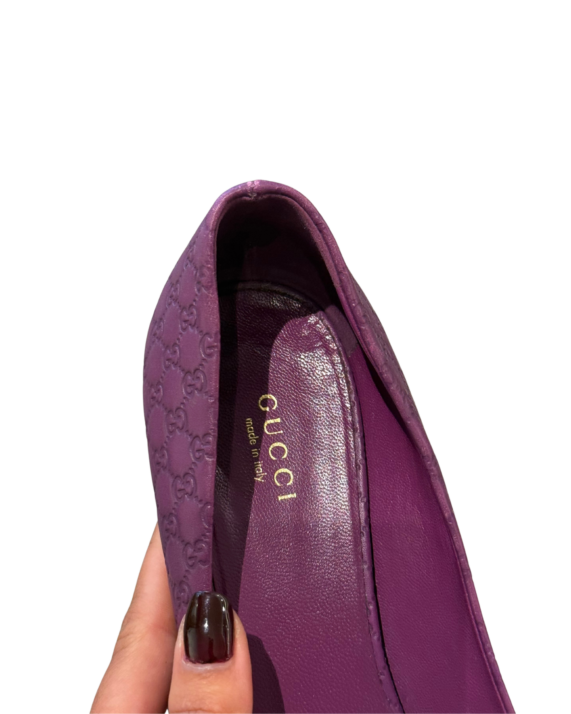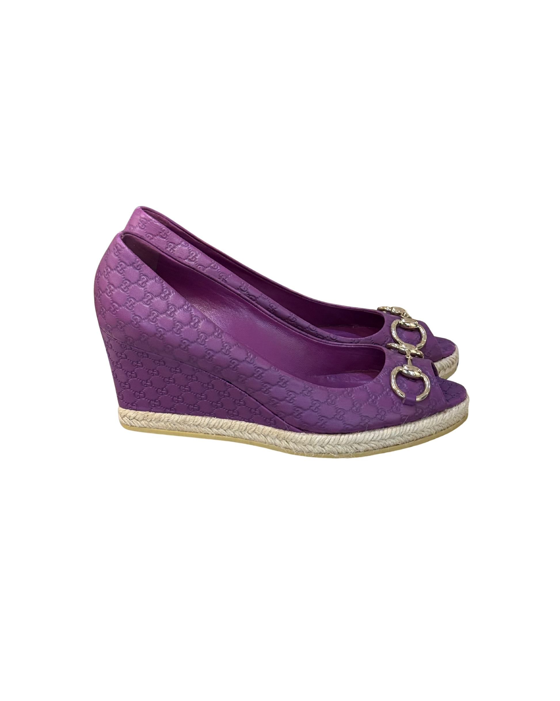 Un tocco di colore e carattere firmato Gucci: queste espadrillas con zeppa sono realizzate in pelle viola goffrata GG e impreziosite dal classico morsetto in metallo argentato. La zeppa in corda naturale e la suola in gomma con logo inciso aggiungono comfort e stile. Modello open toe. Tacco circa 7,5cm