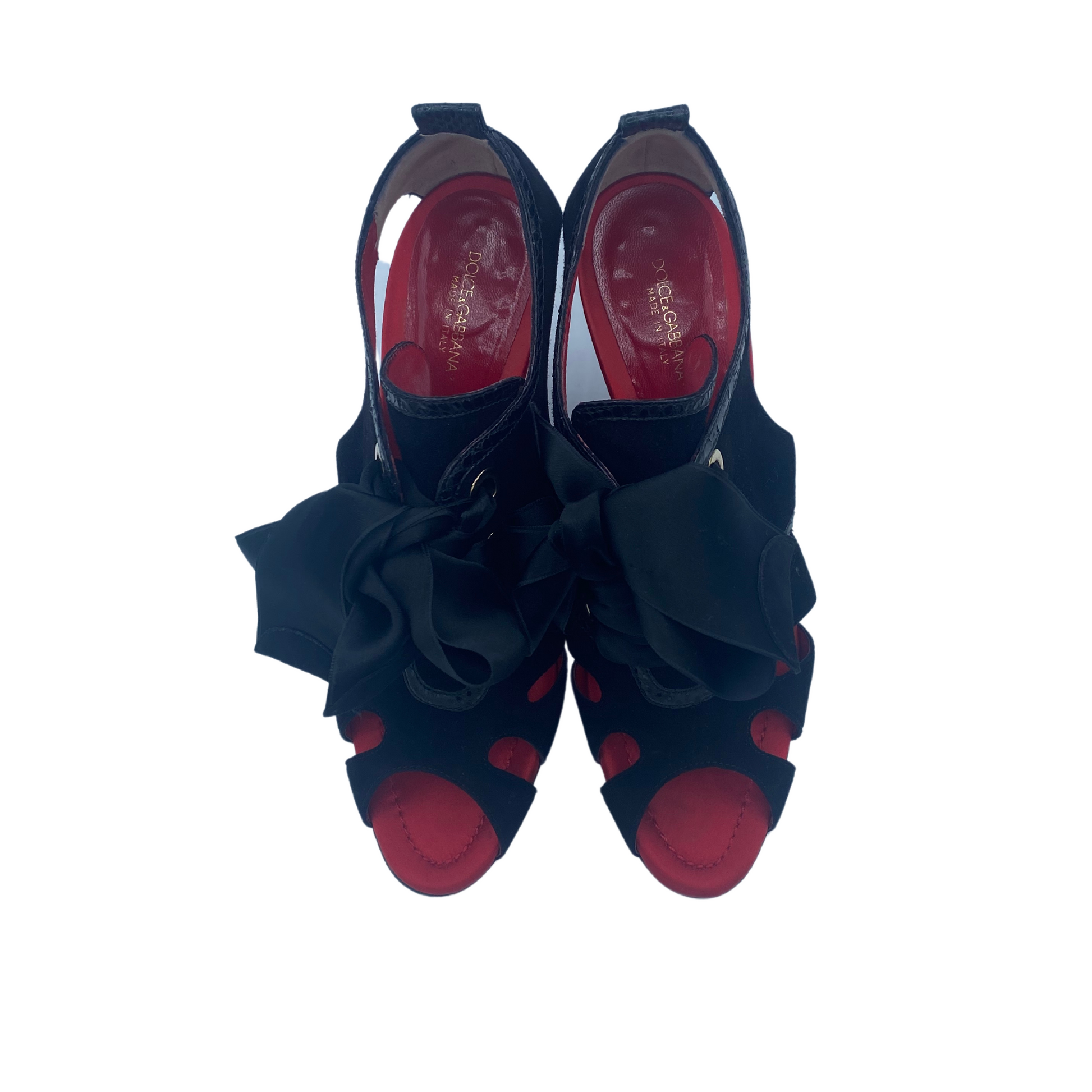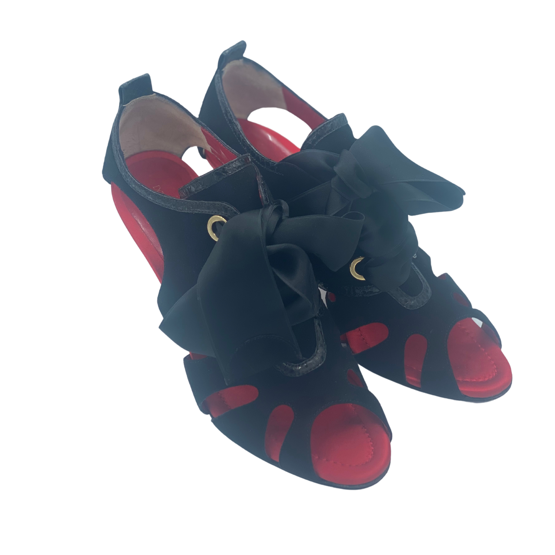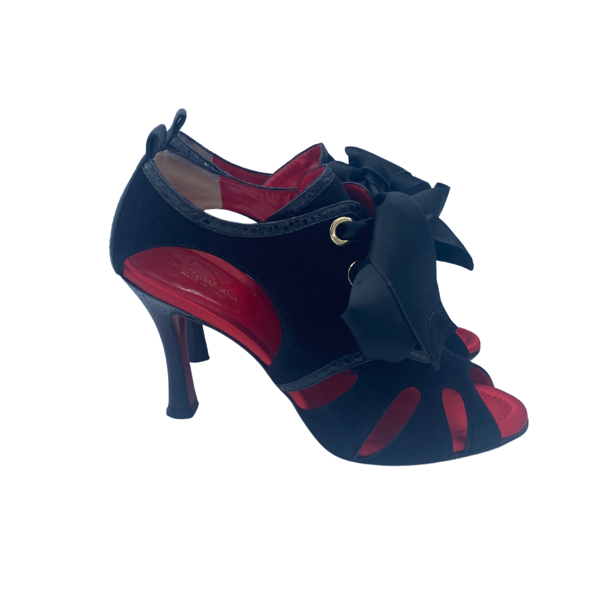 Sandali Dolce&Gabbana neri in camoscio con rifiniture in stampa cocco. Punta open tre, impreziositi da fiocco in raso sulla parte frontale. Interno in pelle rosso. Tacco in pelle cocco 9,5cm. Suola in cuoio rosso.