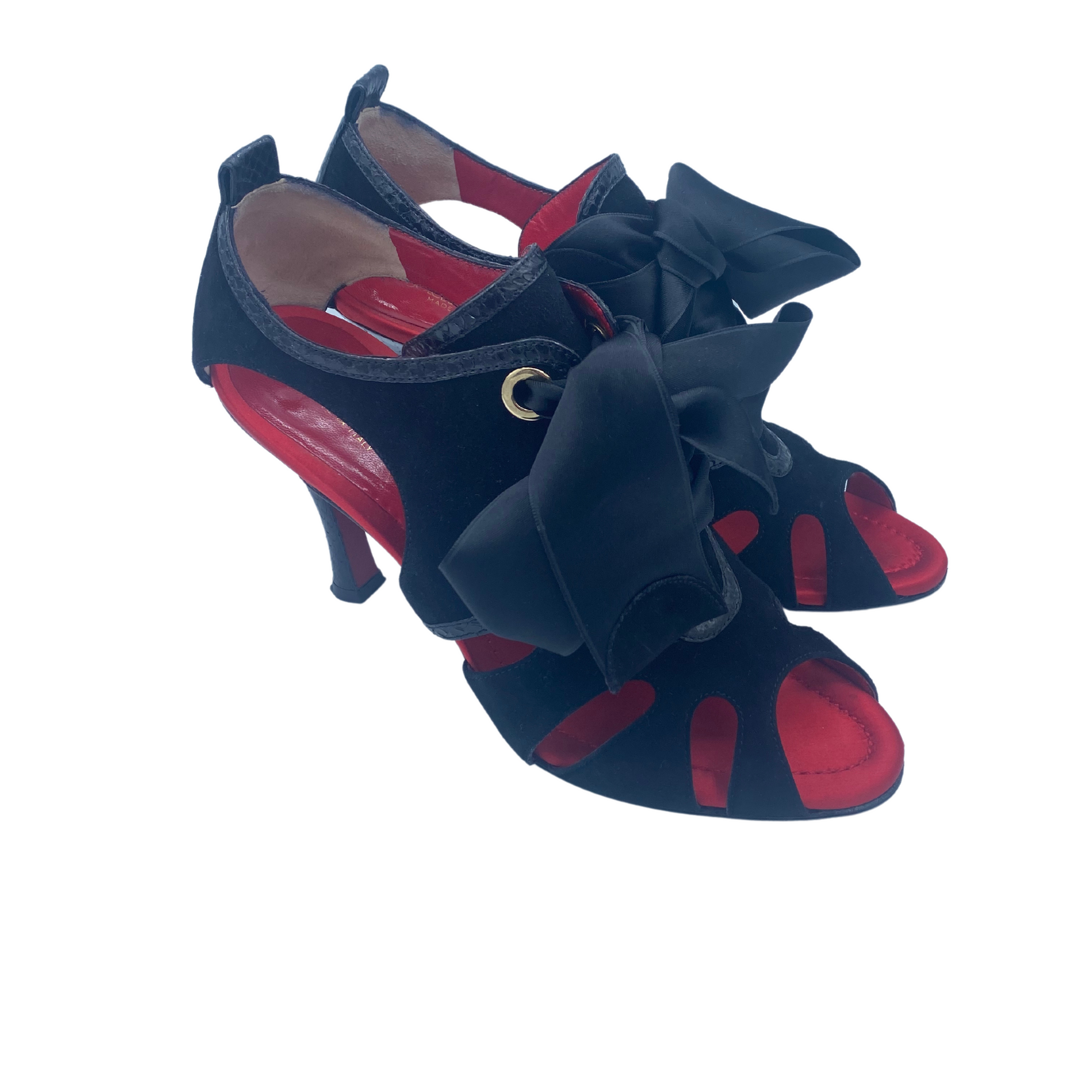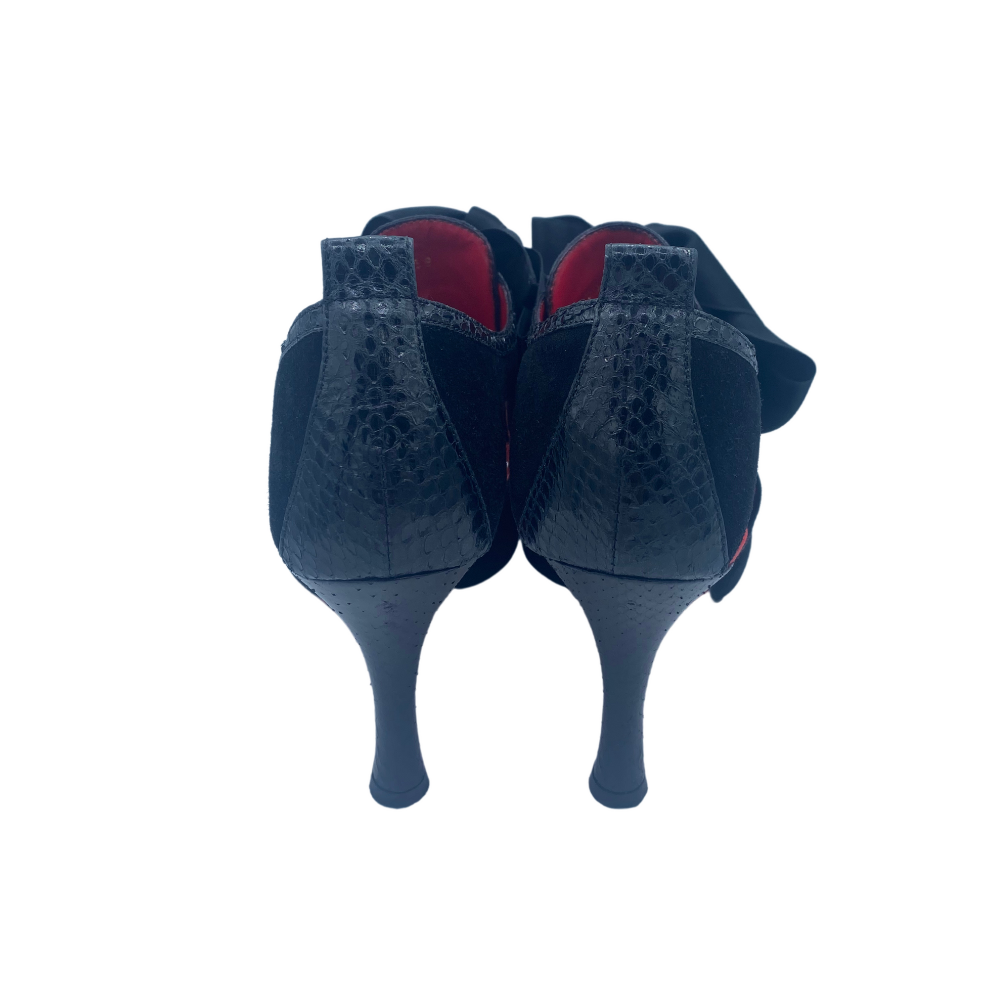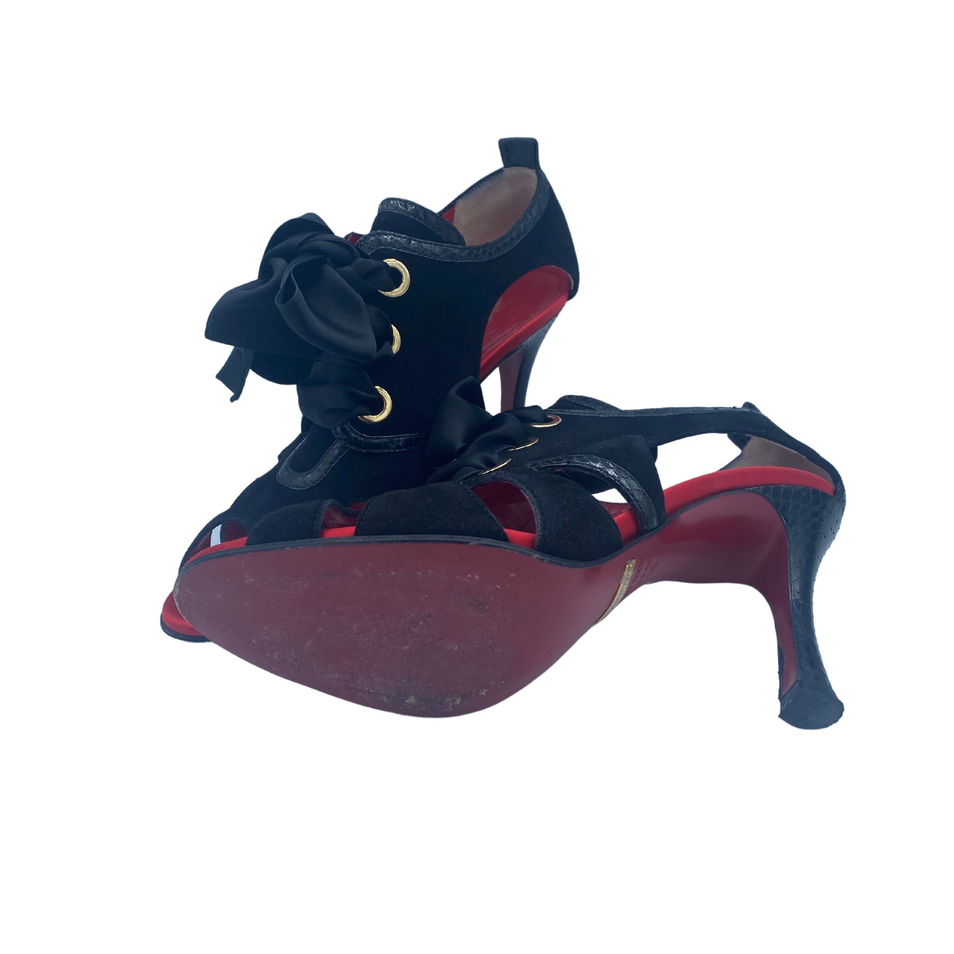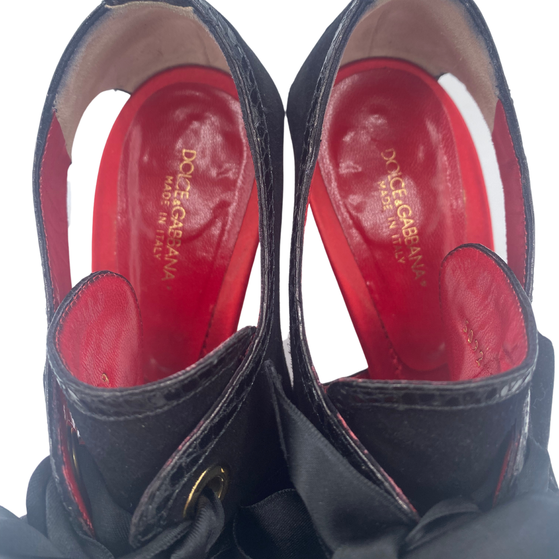 Sandali Dolce&Gabbana neri in camoscio con rifiniture in stampa cocco. Punta open tre, impreziositi da fiocco in raso sulla parte frontale. Interno in pelle rosso. Tacco in pelle cocco 9,5cm. Suola in cuoio rosso.