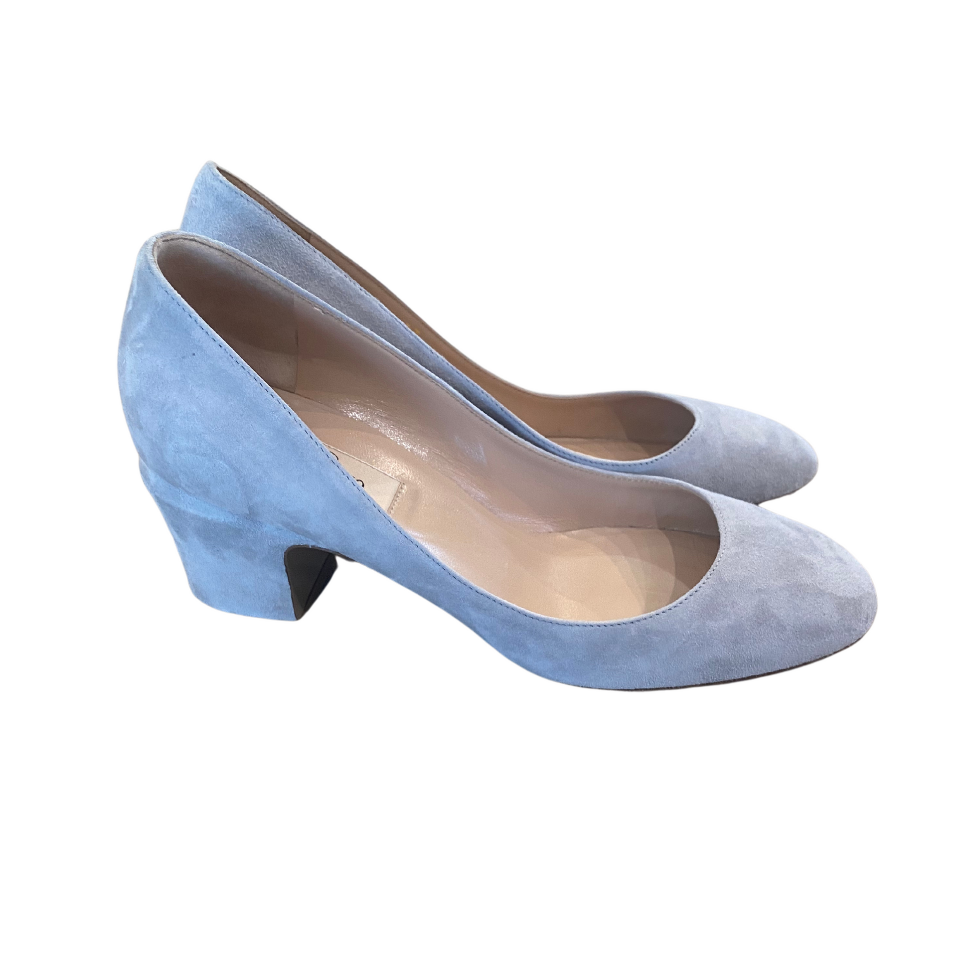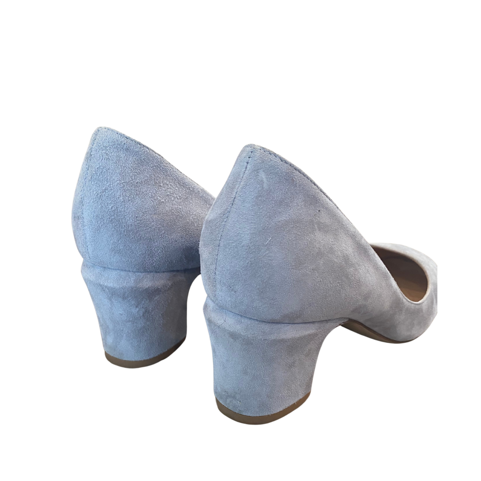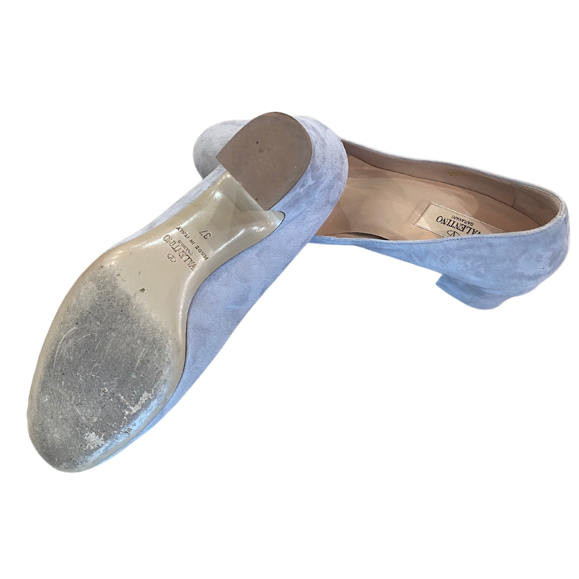 Scarpe Valentino scamosciate grigie pastello. Punta arrotondata e tacco grosso di 6cm che la rende una scarpa elegante e al contempo comoda da indossare tutti i giorni. Interno in pelle beige, suola in cuoio.