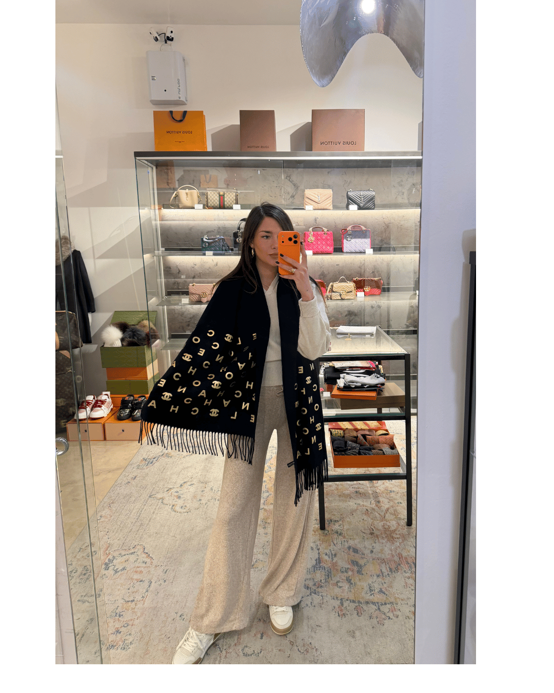 Questa sciarpa Chanel è caratterizzata da una raffinata base blu navy impreziosita da una stampa dorata con lettering e simboli iconici della Maison. Il motivo grafico alterna le scritte CHANEL, COCO e il celebre logo CC, creando un effetto moderno, riconoscibile e di grande impatto visivo. Il contrasto tra il blu profondo e l’oro luminoso dona alla sciarpa un’eleganza decisa ma estremamente versatile, perfetta per valorizzare sia look quotidiani che outfit più sofisticati. Le frange lungo i bordi aggiungono movimento e un tocco classico, mentre il tessuto morbido e avvolgente garantisce comfort e vestibilità impeccabile. 70% lana, 30% cashmere.