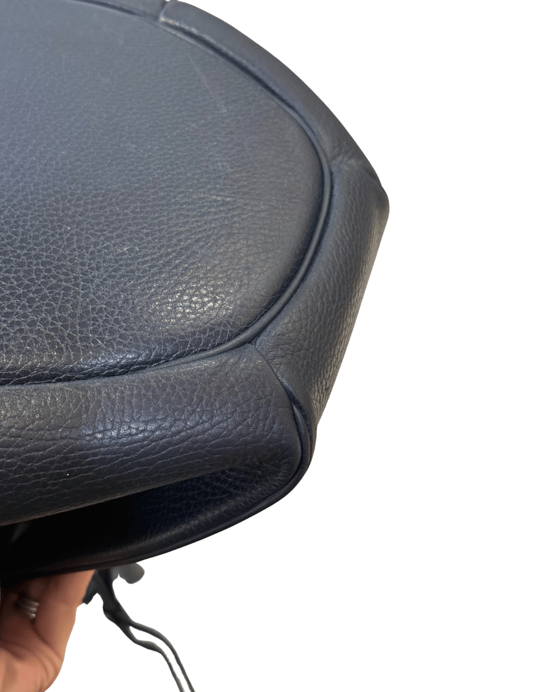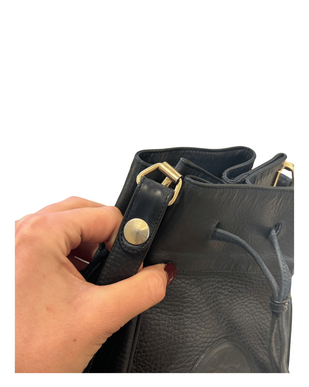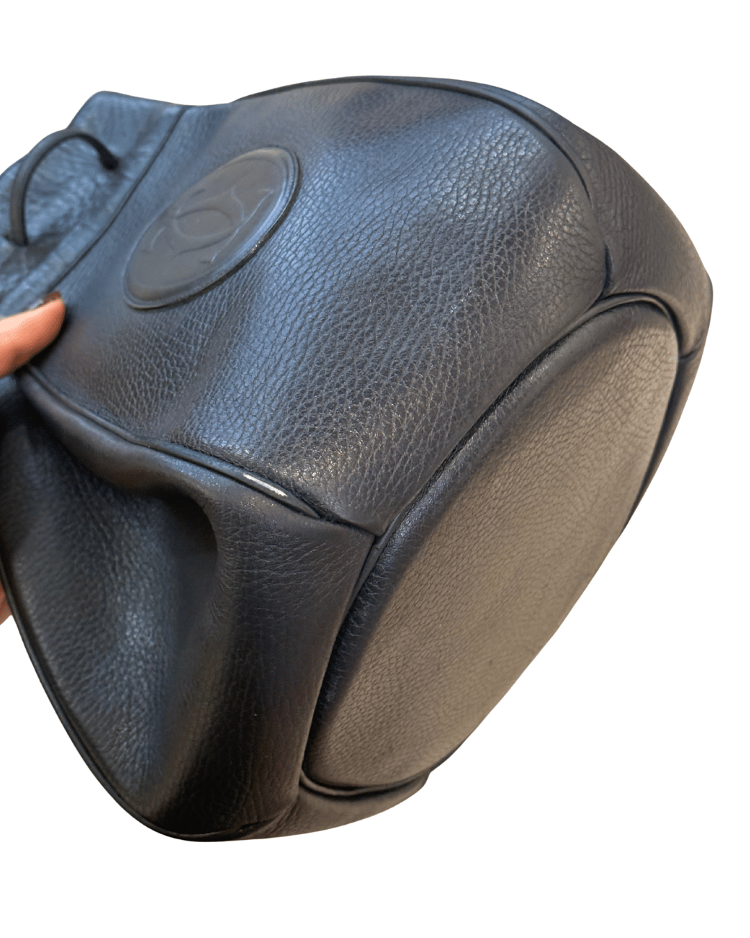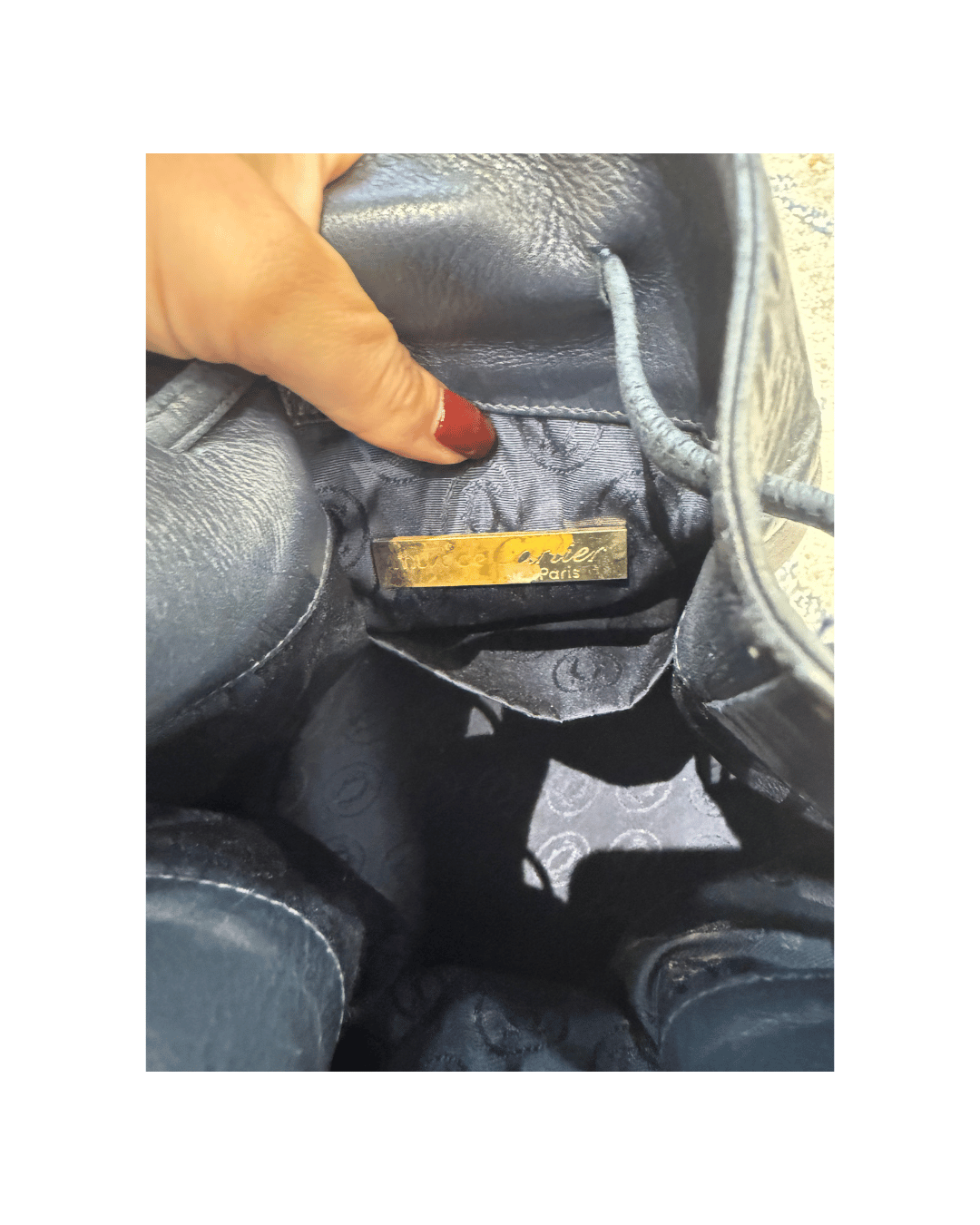 Secchiello vintage di Cartier realizzato in pelle martellata blu notte. Logo frontale. Apertura con coulisse. Interno in tessuto blu logato. Tracolla regolabile.