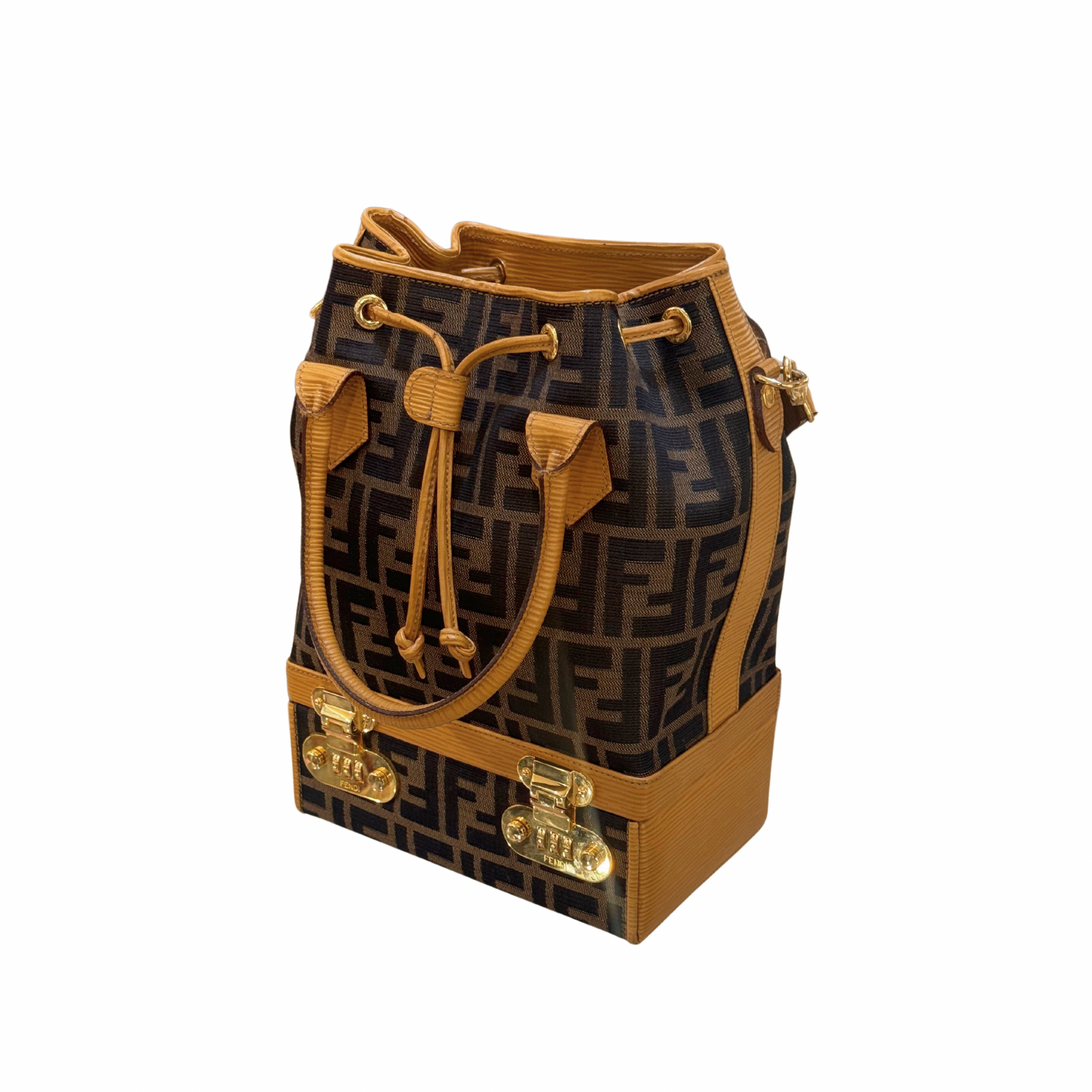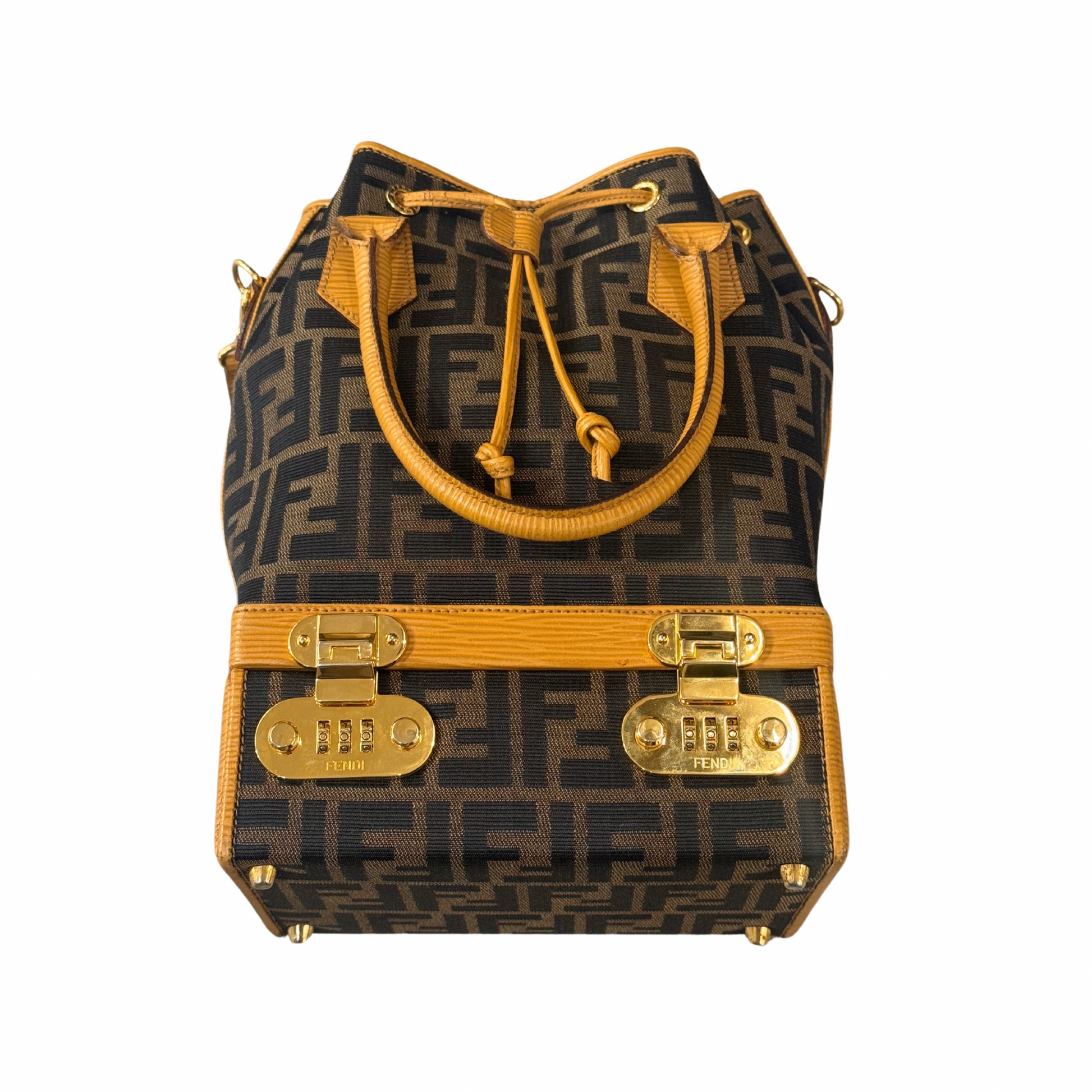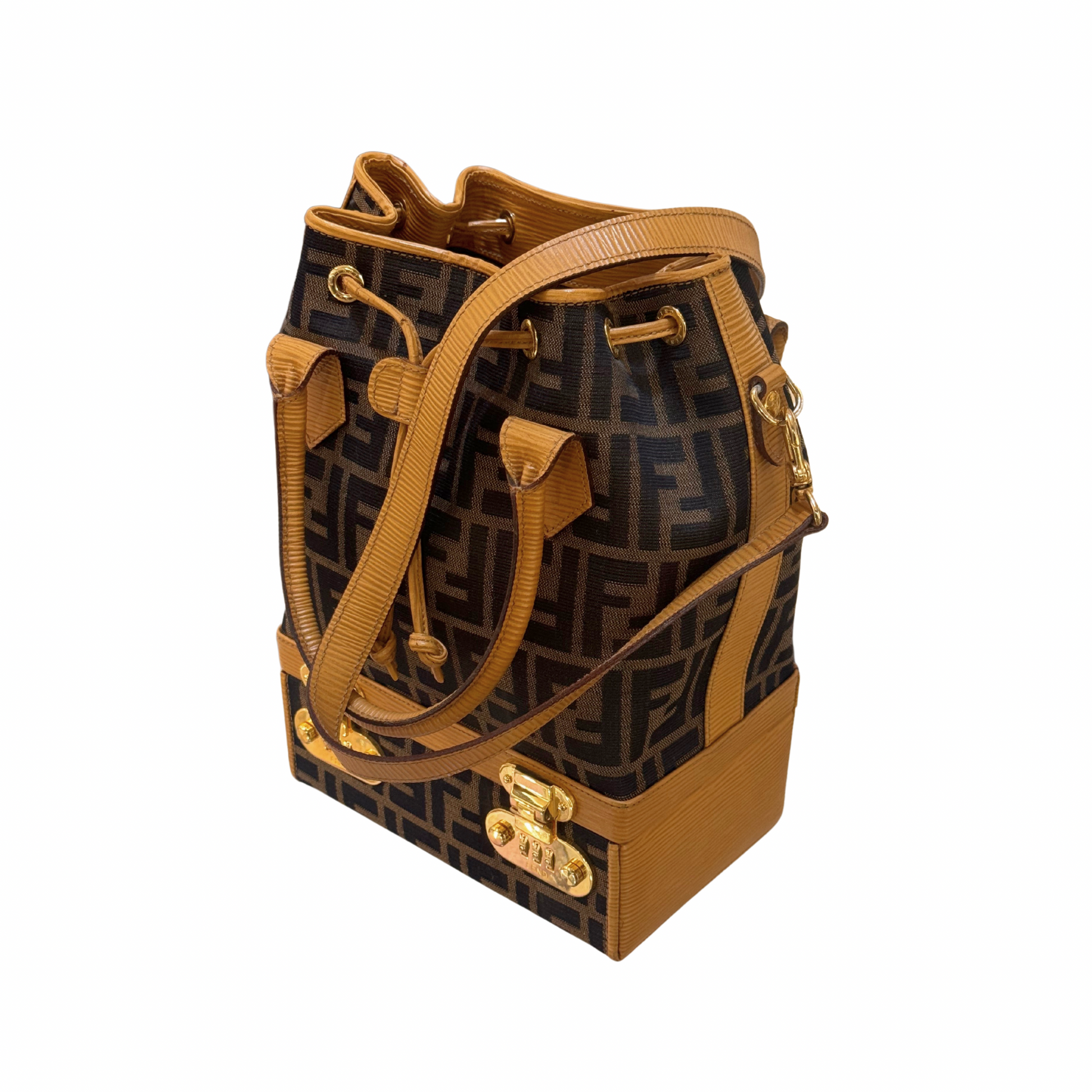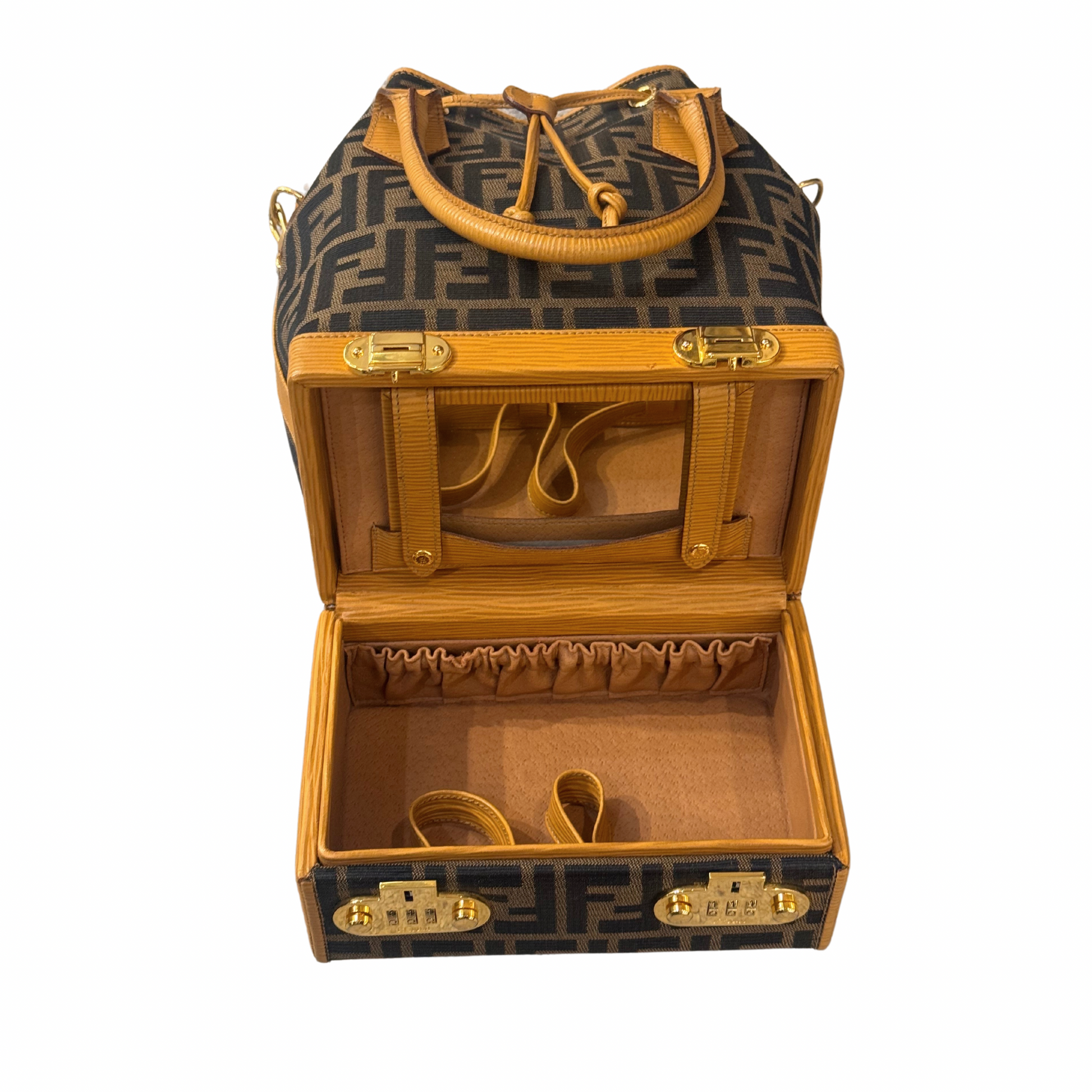 Super Limited Edition Secchiello di Fendi realizzato in tela fendi zucca e rifiniture in pelle color ocra.Doppi manici superiore e tracolla amovibile e regolabile. Suddiviso in due scomparti: la base è rigida , cofanetto. Apertura a scatto in metallo dorato con combinazione numerica. All'interno è presente anche uno specchio. La parte superiore in tessuto, tasca con cerniera. Viene venduto assieme al portafoglio coordinato.