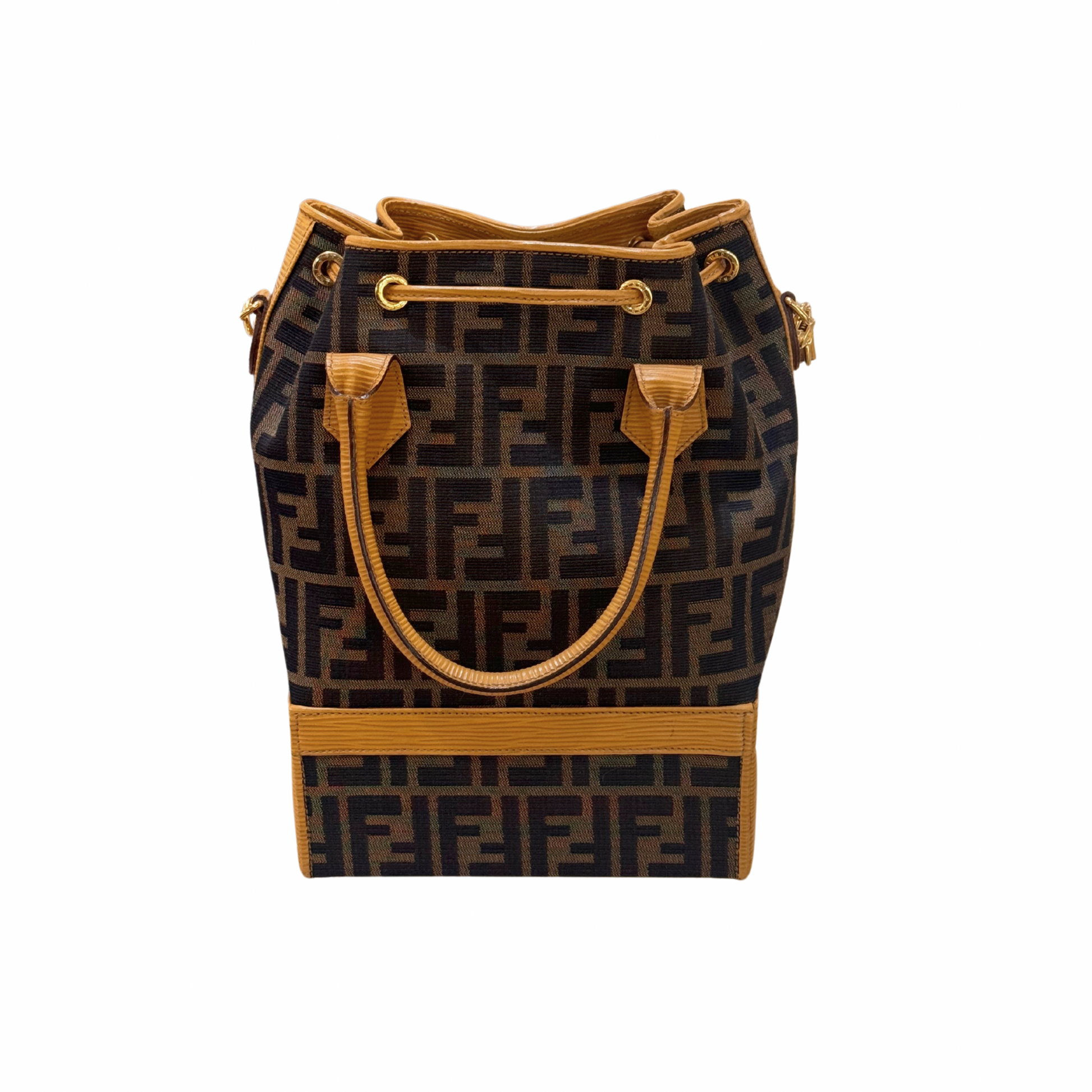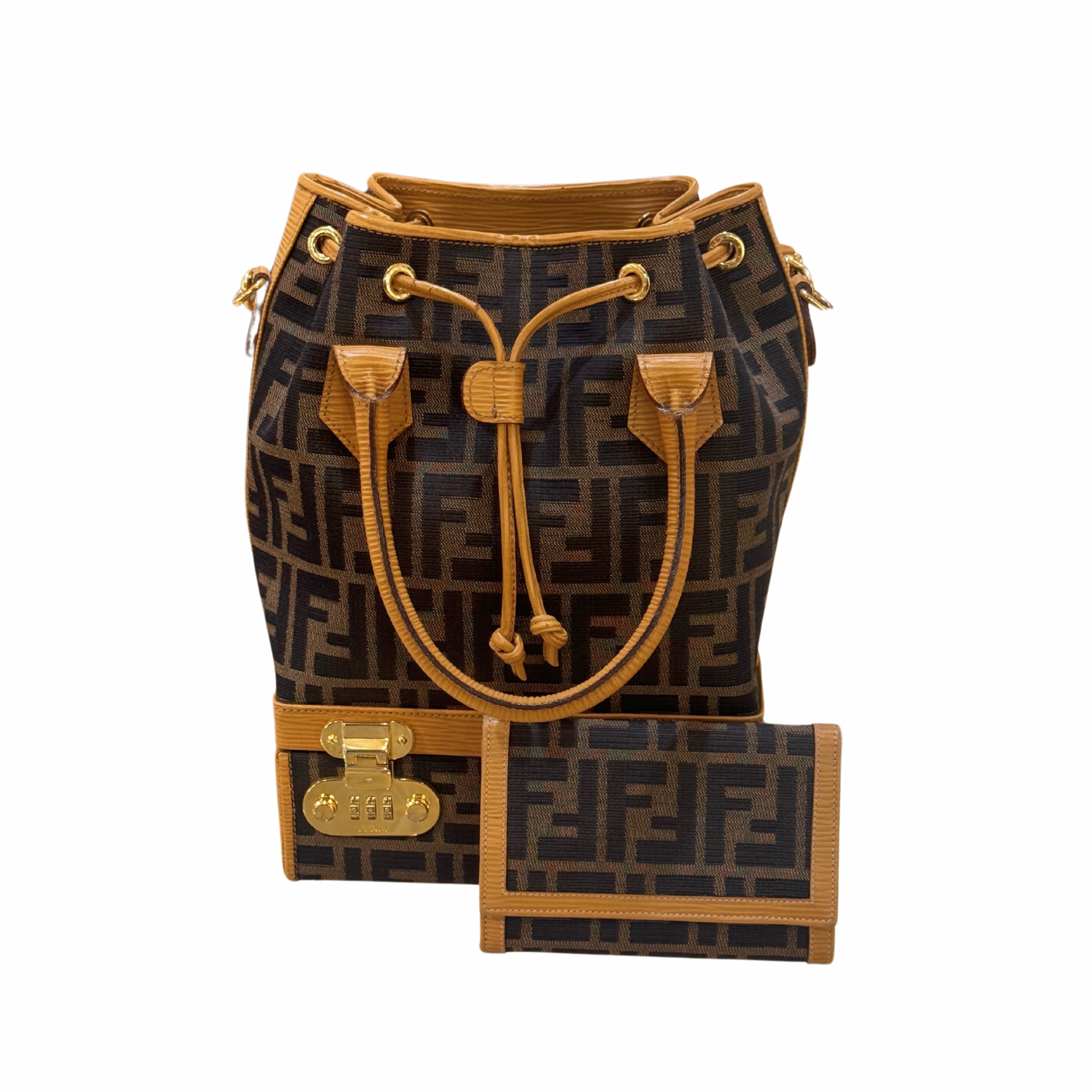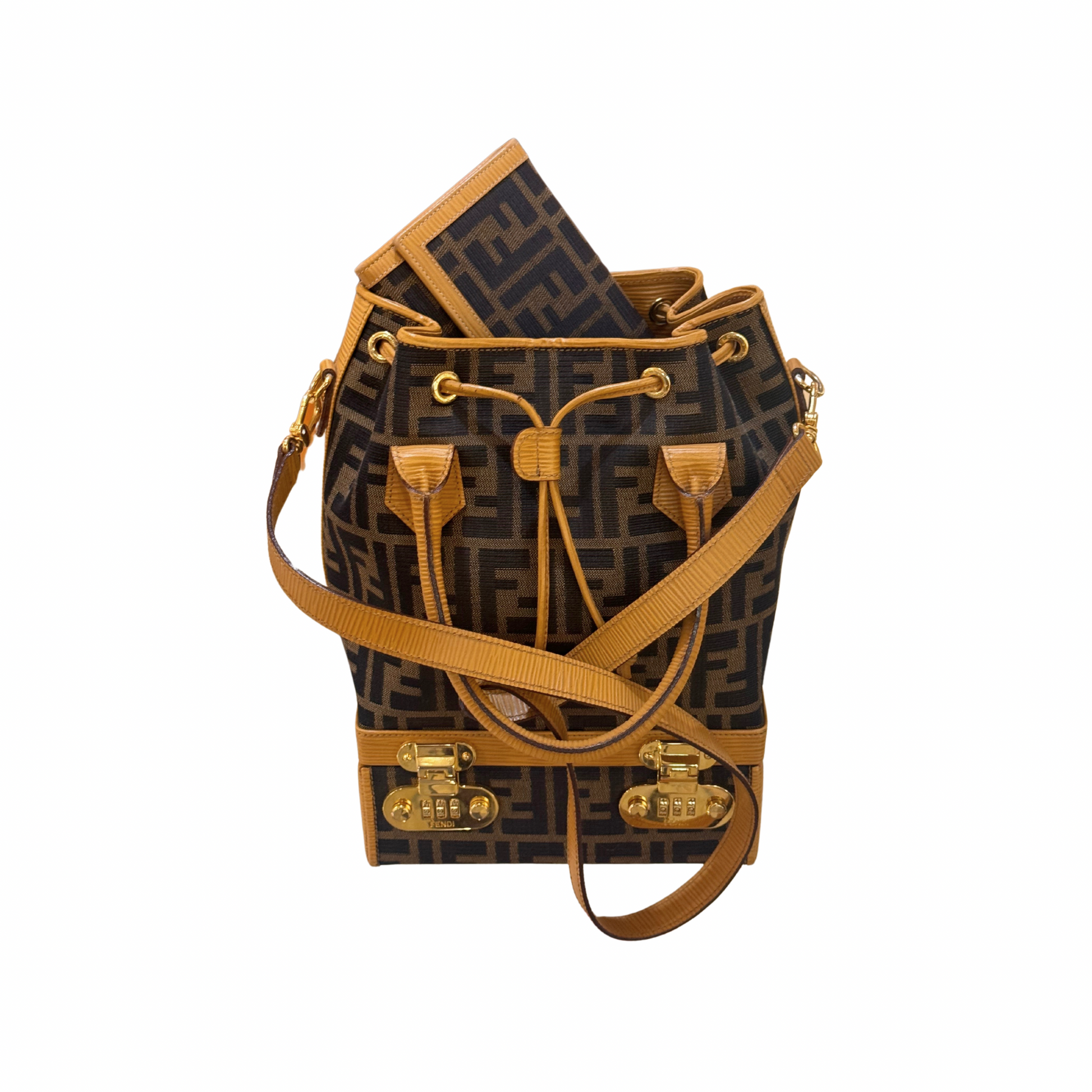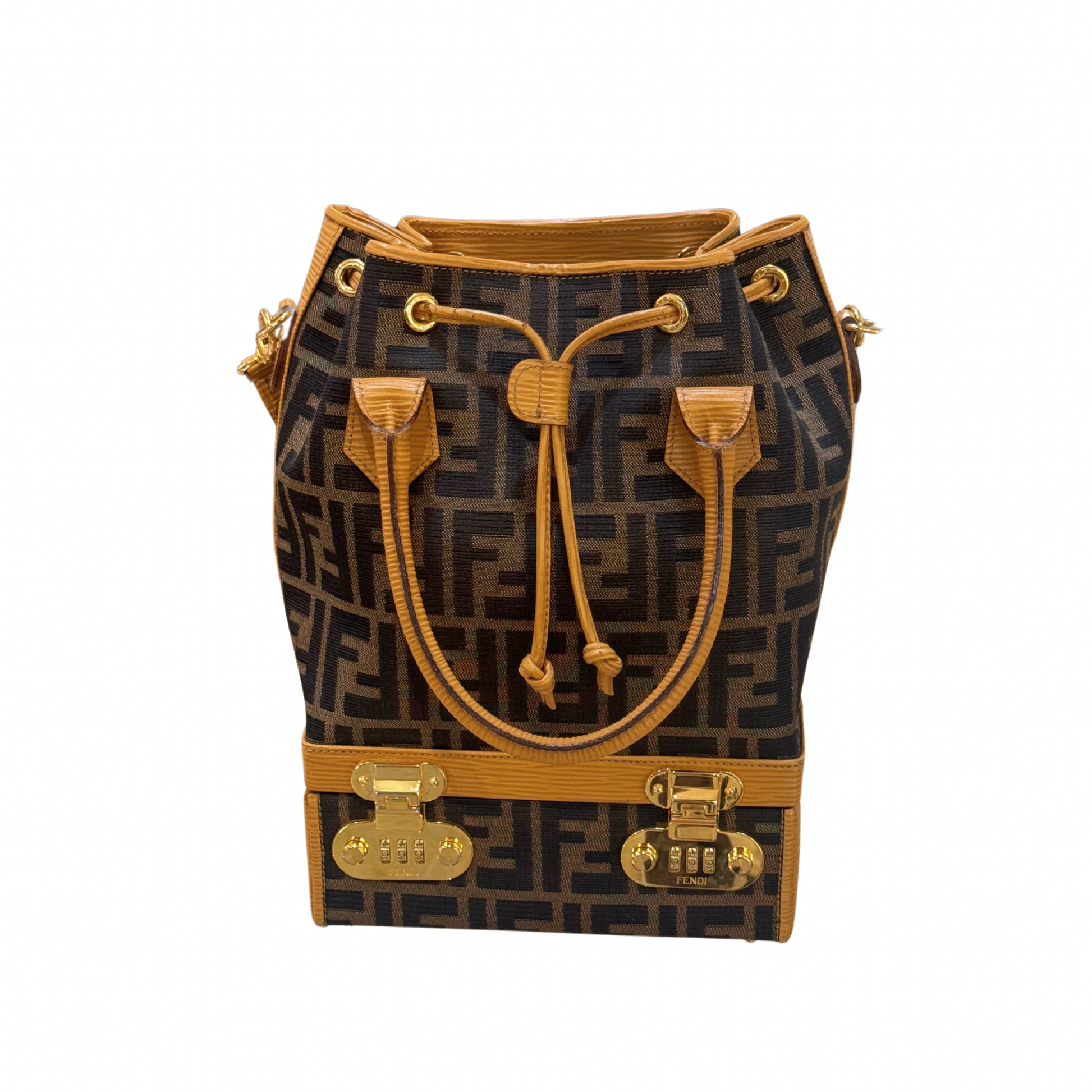 Super Limited Edition Secchiello di Fendi realizzato in tela fendi zucca e rifiniture in pelle color ocra.Doppi manici superiore e tracolla amovibile e regolabile. Suddiviso in due scomparti: la base è rigida , cofanetto. Apertura a scatto in metallo dorato con combinazione numerica. All'interno è presente anche uno specchio. La parte superiore in tessuto, tasca con cerniera. Viene venduto assieme al portafoglio coordinato.