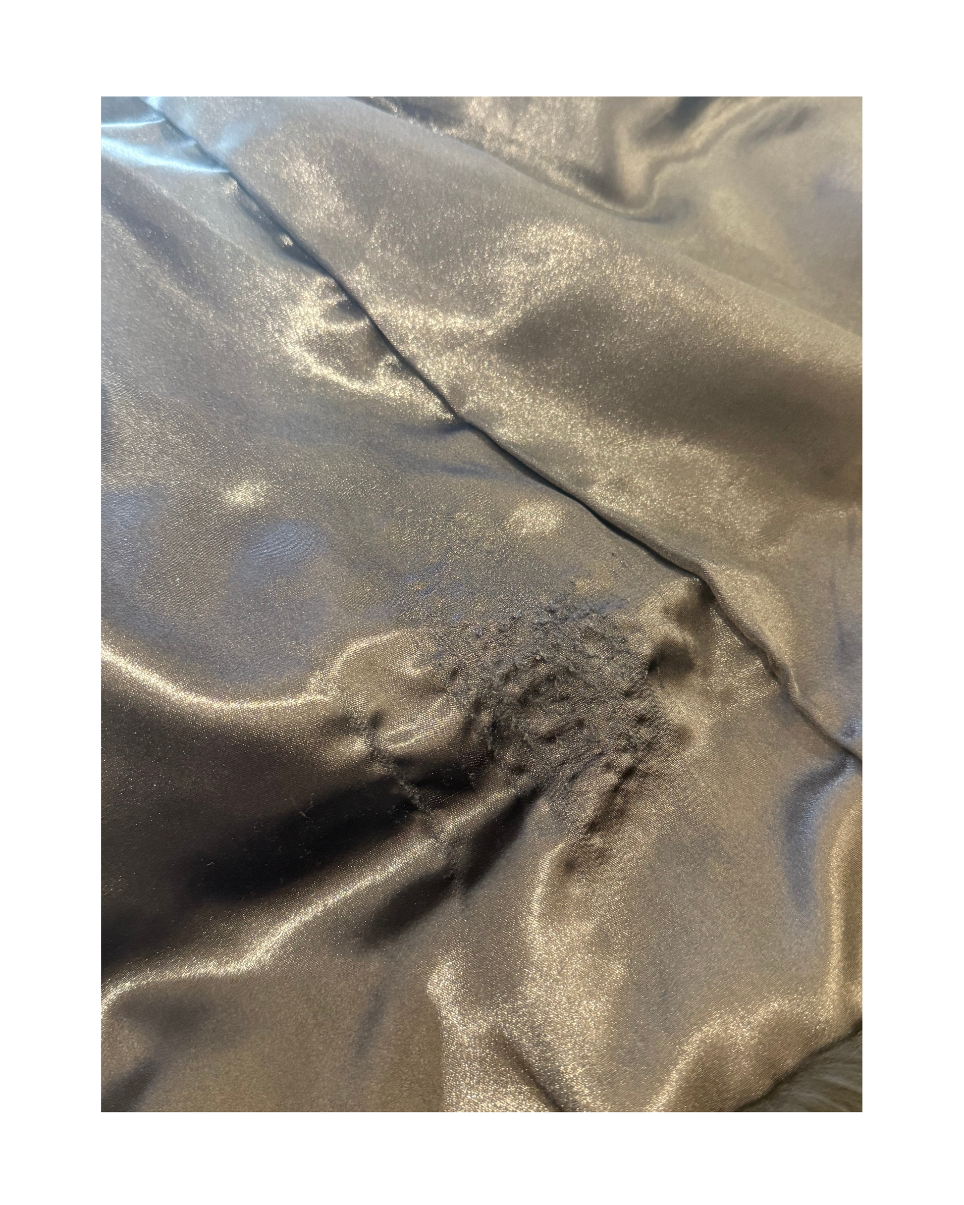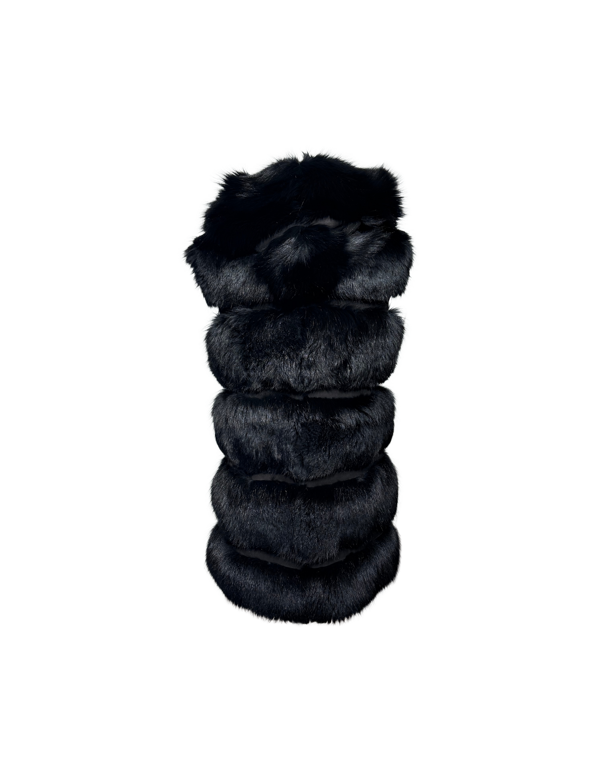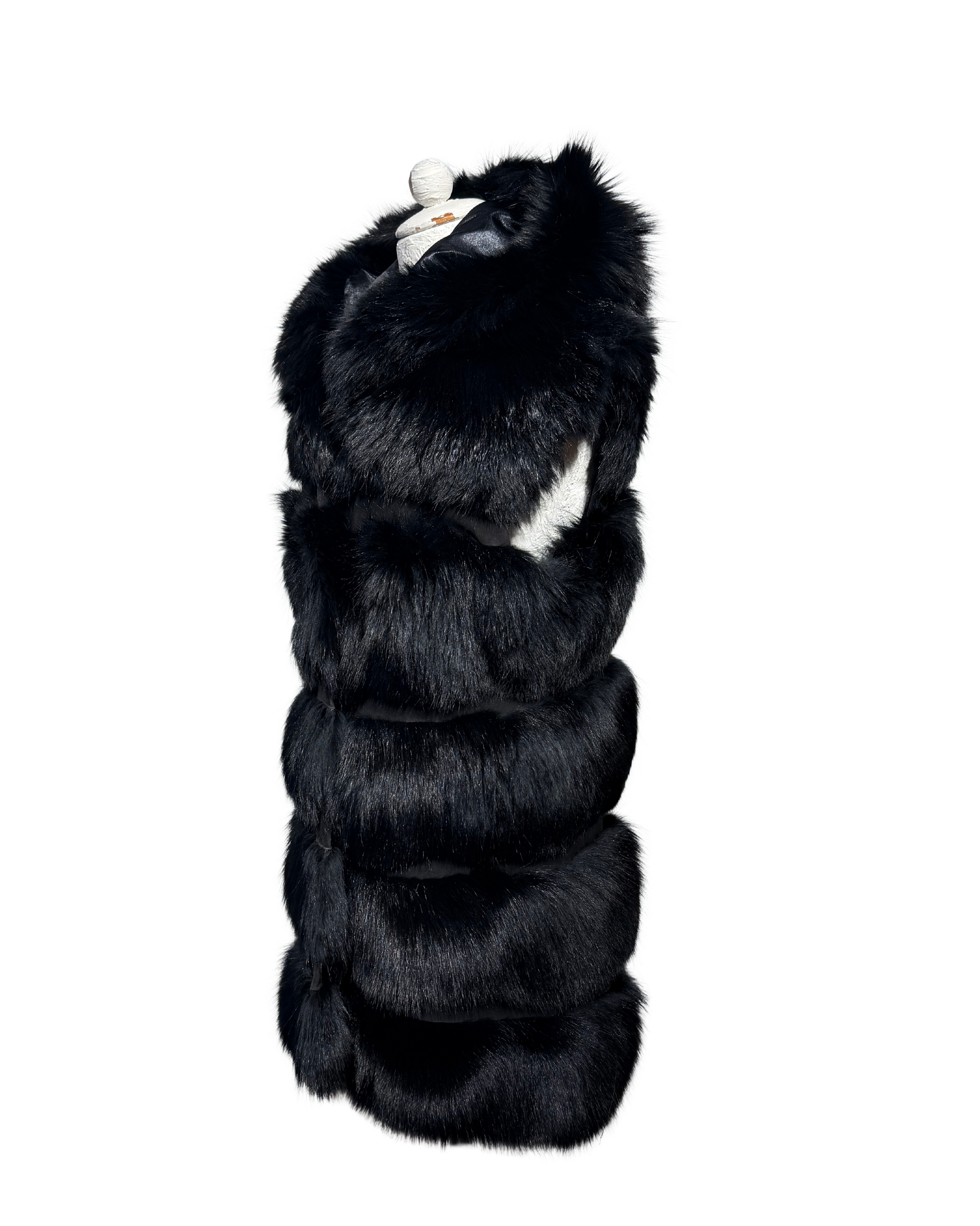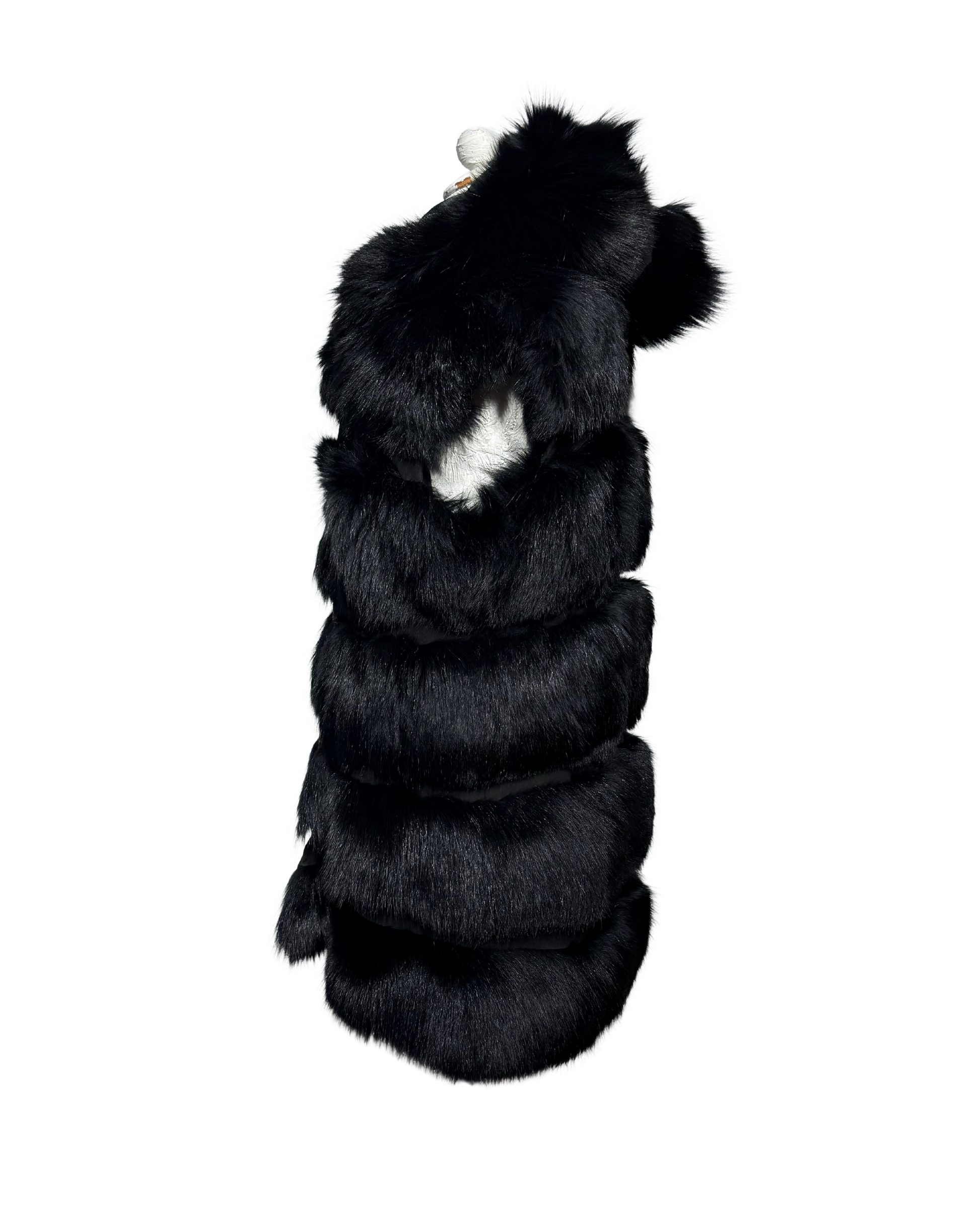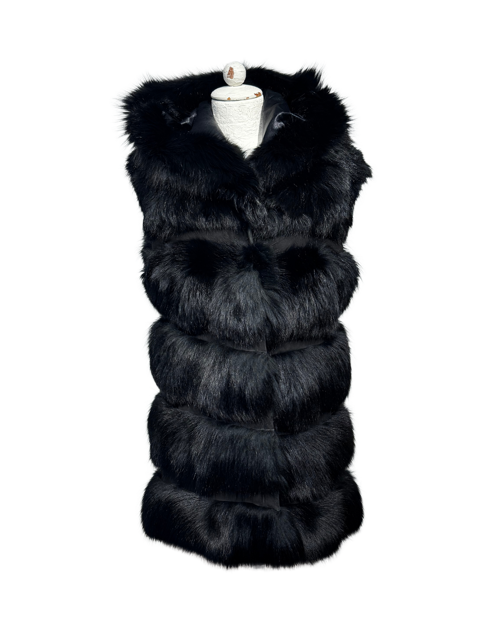 Smanicato in pelo di volpe nero, con cappuccio. Apertura con gancetti.