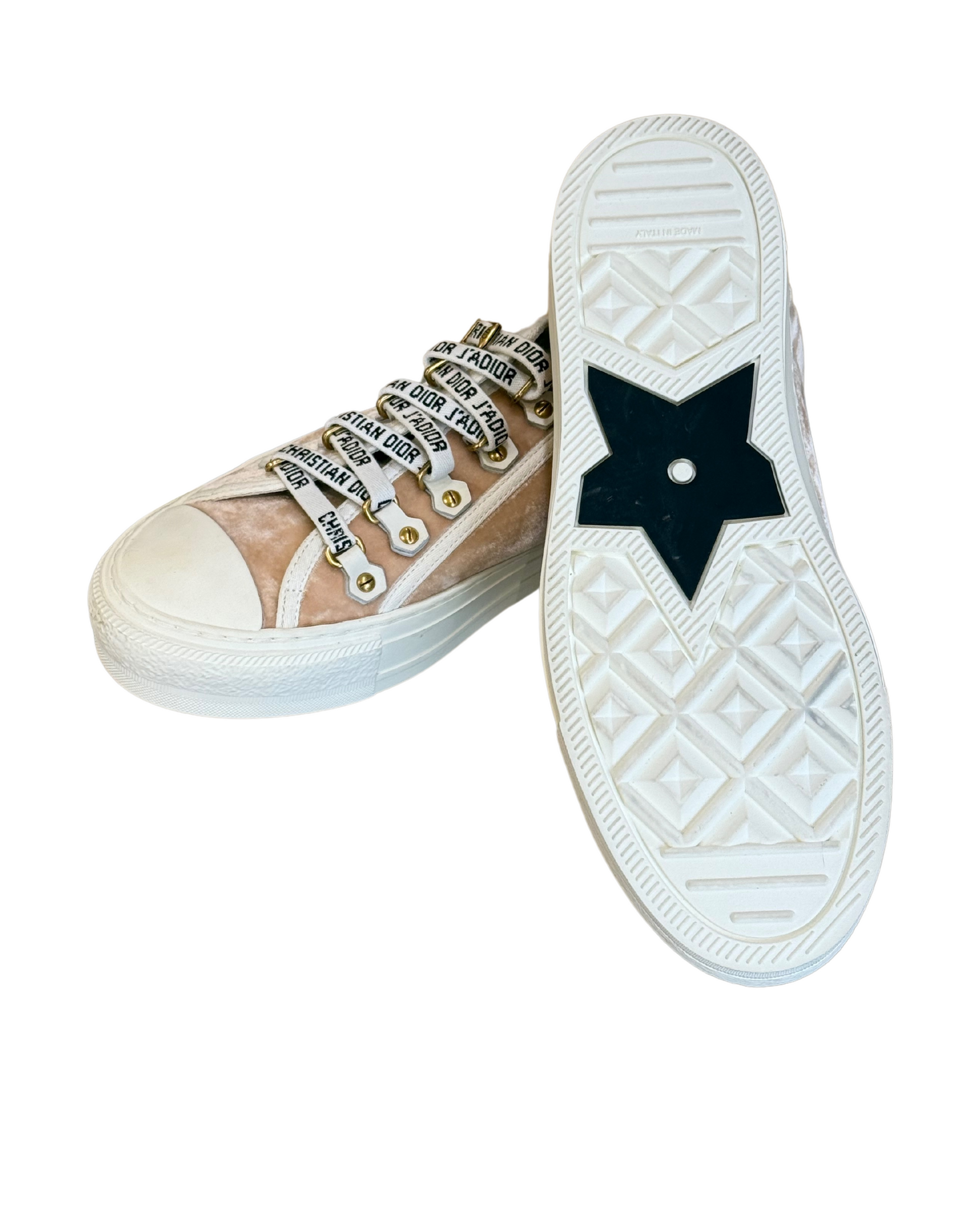 Sneakers di Dior realizzate in ciniglia rosa antico, lacci bianchi con logo nero. Suola in gomma antiscivolo.