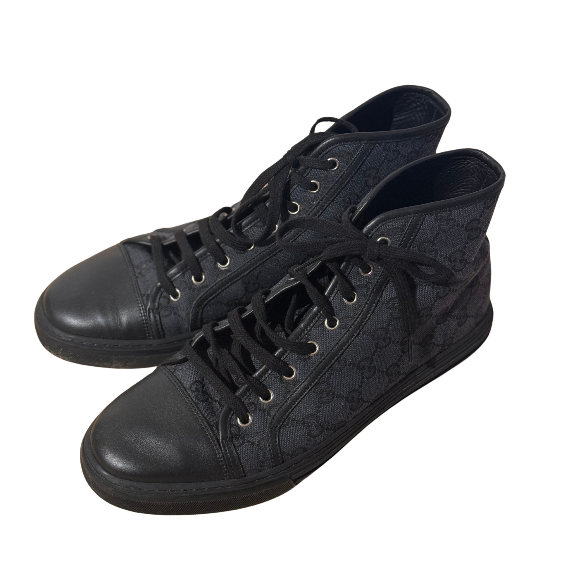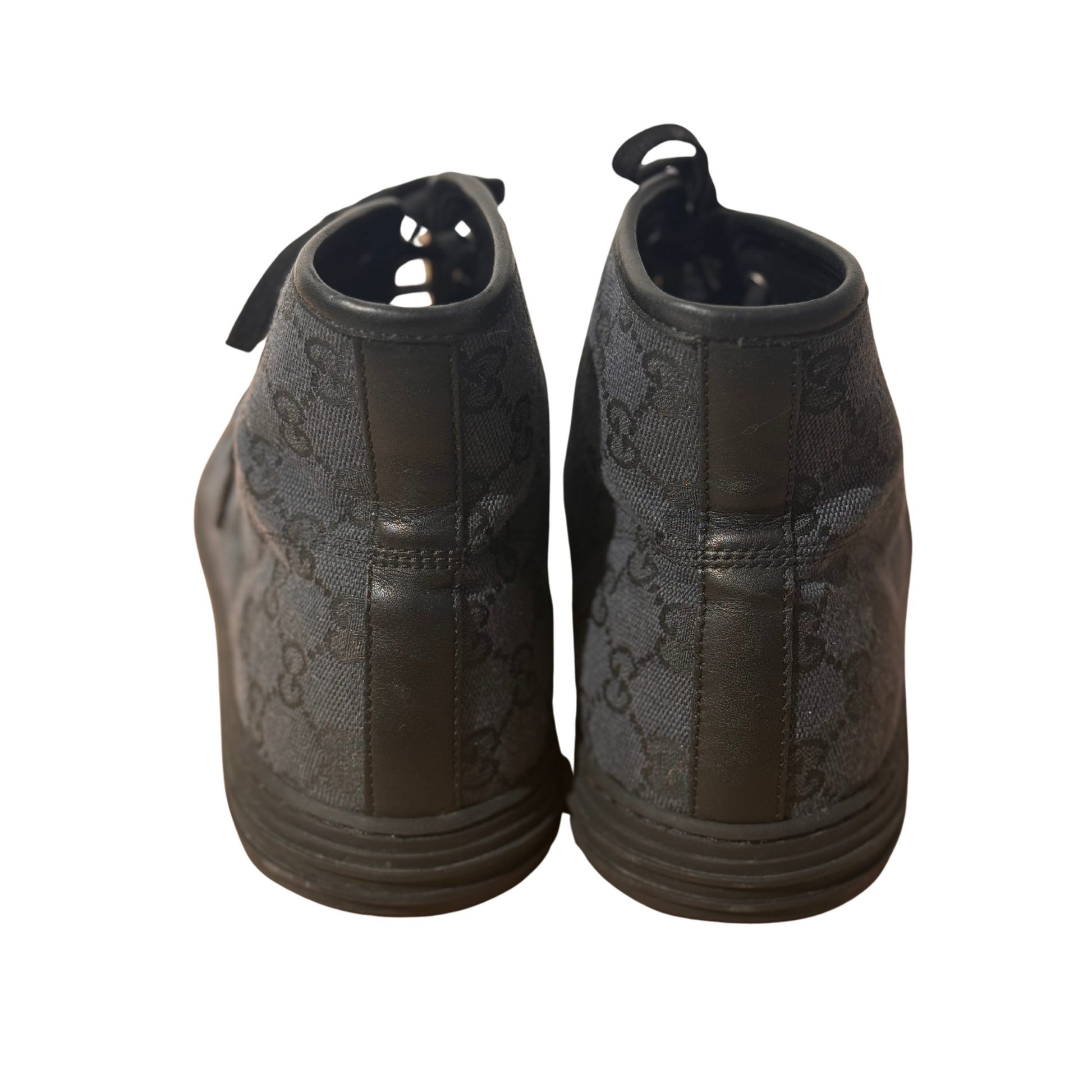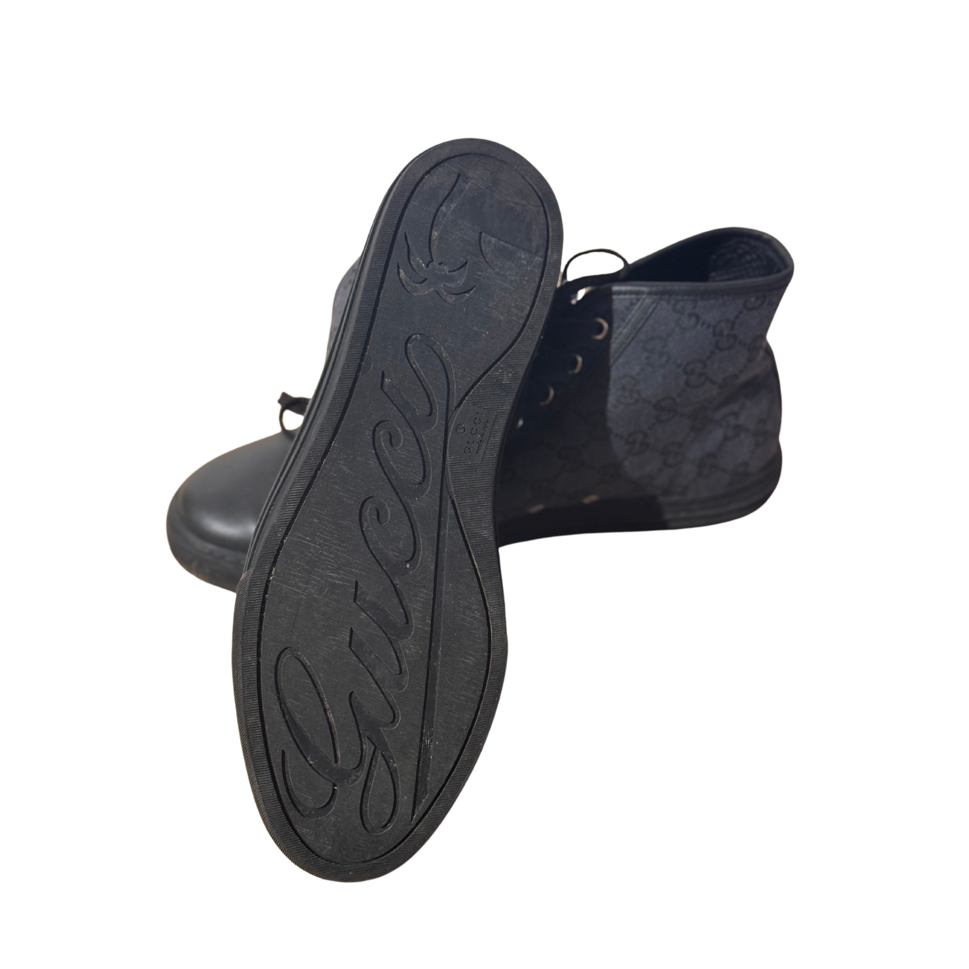 Sneakers di Gucci , corpo in tela monogram GG supreme tono su tono. Rifiniture in pelle di vitello liscia nera. Lacci neri. Suola in gomma antiscivolo nera, interno in pelle.