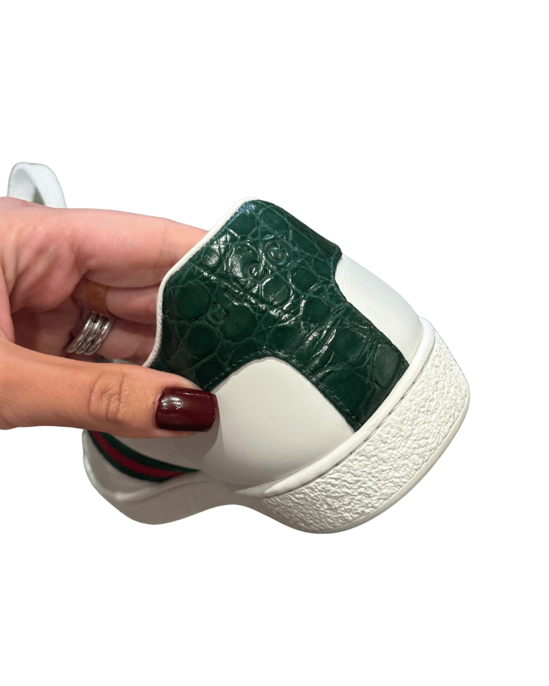Un’icona dello stile casual firmata Gucci, le Ace Sneakers sono tra i modelli più amati della maison. Realizzate in morbida pelle bianca, sono decorate con il classico nastro Web verde e rosso sui lati, simbolo inconfondibile del brand. Il tallone è rifinito in pelle verde effetto coccodrillo con logo “Gucci” impresso, un dettaglio che dona carattere e unicità al modello. La suola in gomma bianca con pattern inciso garantisce comfort e resistenza, rendendole perfette per un uso quotidiano ma sempre ricercato.Un paio di sneakers versatili, che abbinate a jeans, abiti o look più sportivi aggiungono sempre un tocco di lusso e riconoscibilità.