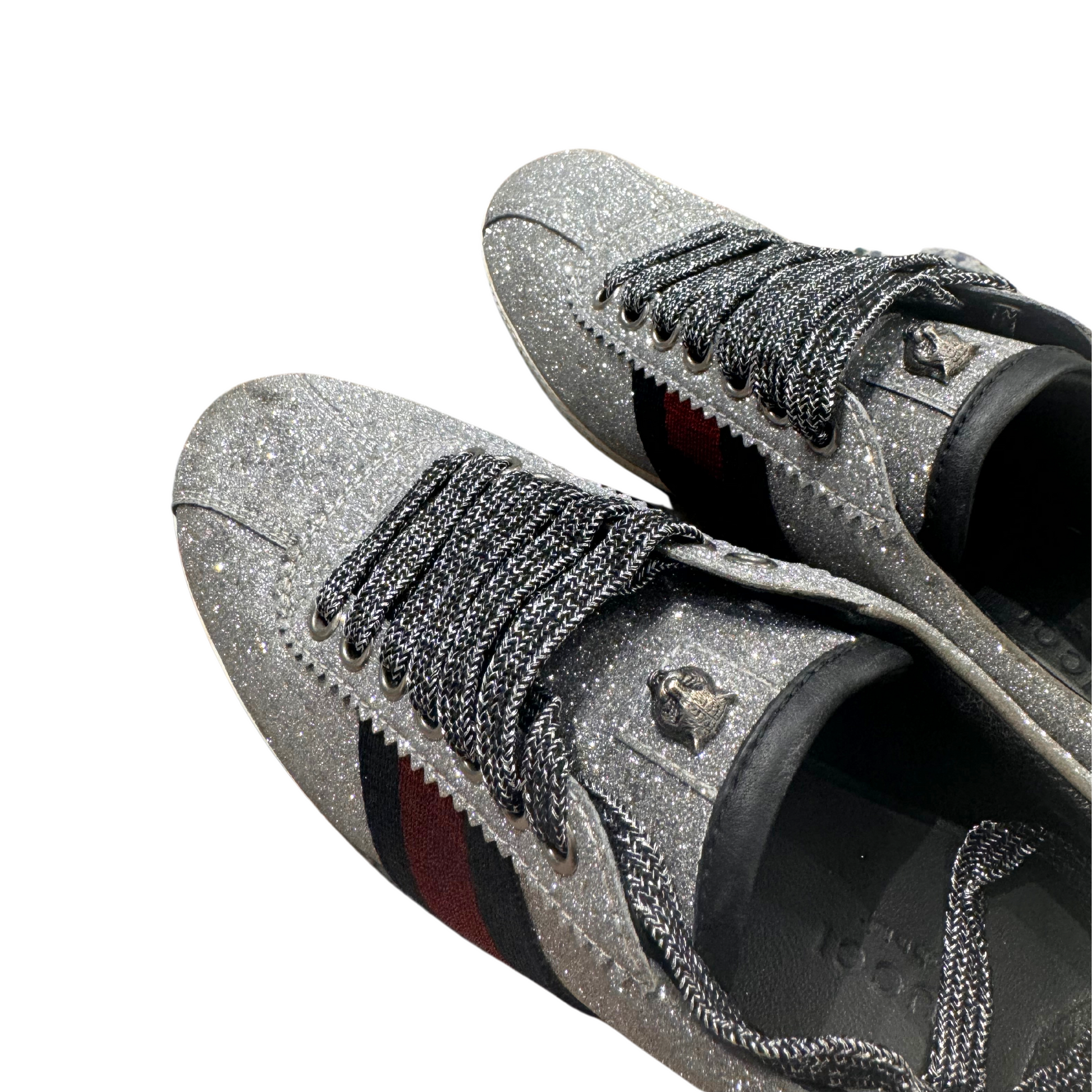 Sneakers di Gucci brillantinate argento. Fascia web laterale blu e rossa. Lacci argento e bocchette nella parte posteriore in corrispondenza del tallone. Suola in gomma bianca, interno in pelle.