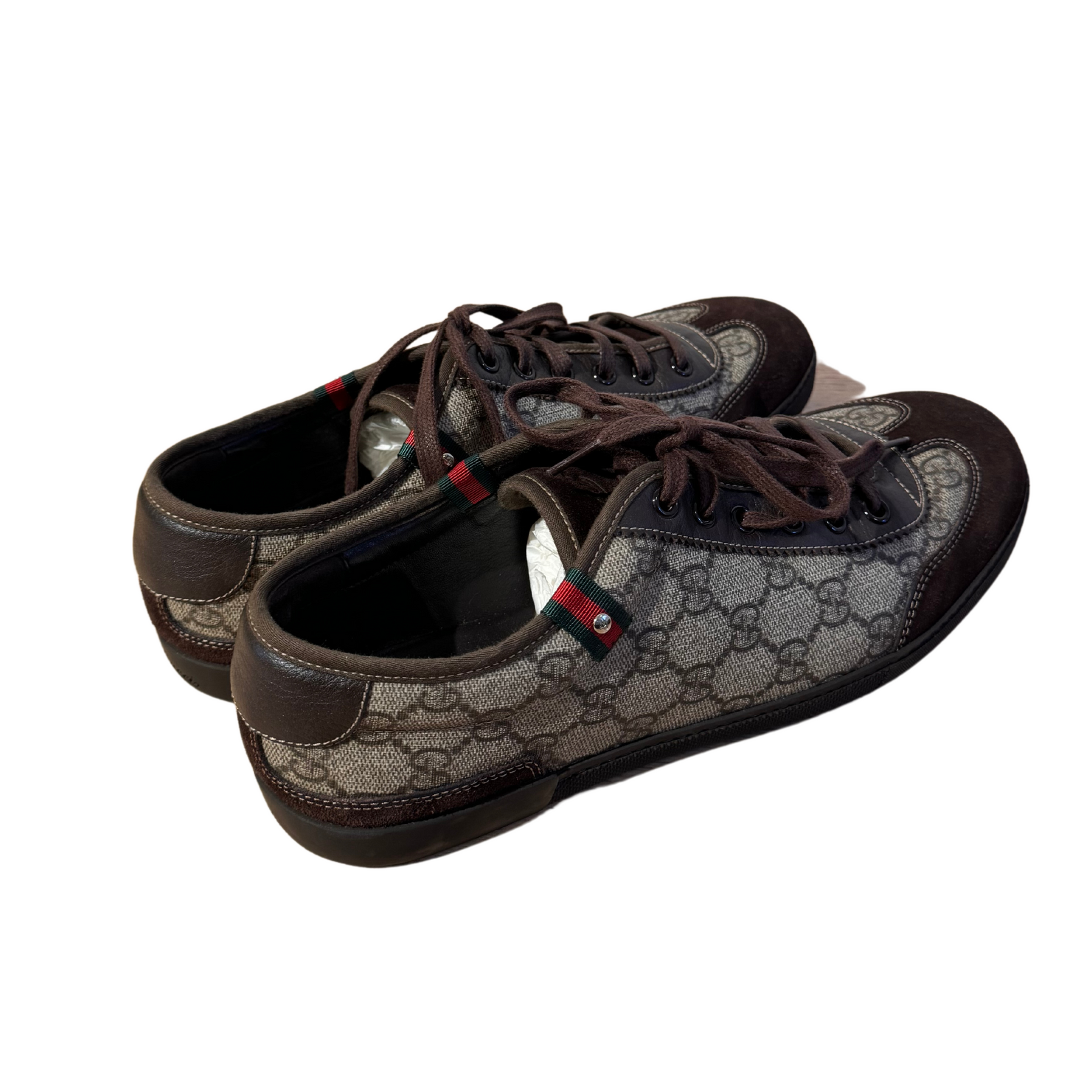 Sneakers di Gucci da uomo , corpo in tela monogram e rifiniture in pelle scamosciata marrone. Lacci frontali marroni, inserti a fascia web laterali. Suola in gomma marrone. Interno in pelle.