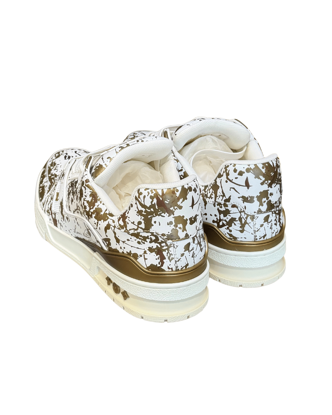 Questo modello nasce come reinterpretazione luxury delle sneaker da basket anni ’80, silhouette a cui Abloh si è ispirato fin dal debutto della linea uomo. La tomaia è realizzata in pelle liscia bianca con stampa camouflage effetto paint nei toni del beige/bronzo, una lavorazione grafica ricorrente nelle collezioni di Abloh, che fonde streetwear, arte e moda di lusso. Sulla punta è presente il dettaglio grafico illustrato, mentre la linguetta è impreziosita dal logo LV applicato, firma distintiva del modello Trainer. La suola in gomma è decorata con la scritta Louis Vuitton in rilievo e dettagli ispirati al mondo dello skate e del basket, elementi chiave dell’estetica del designer.