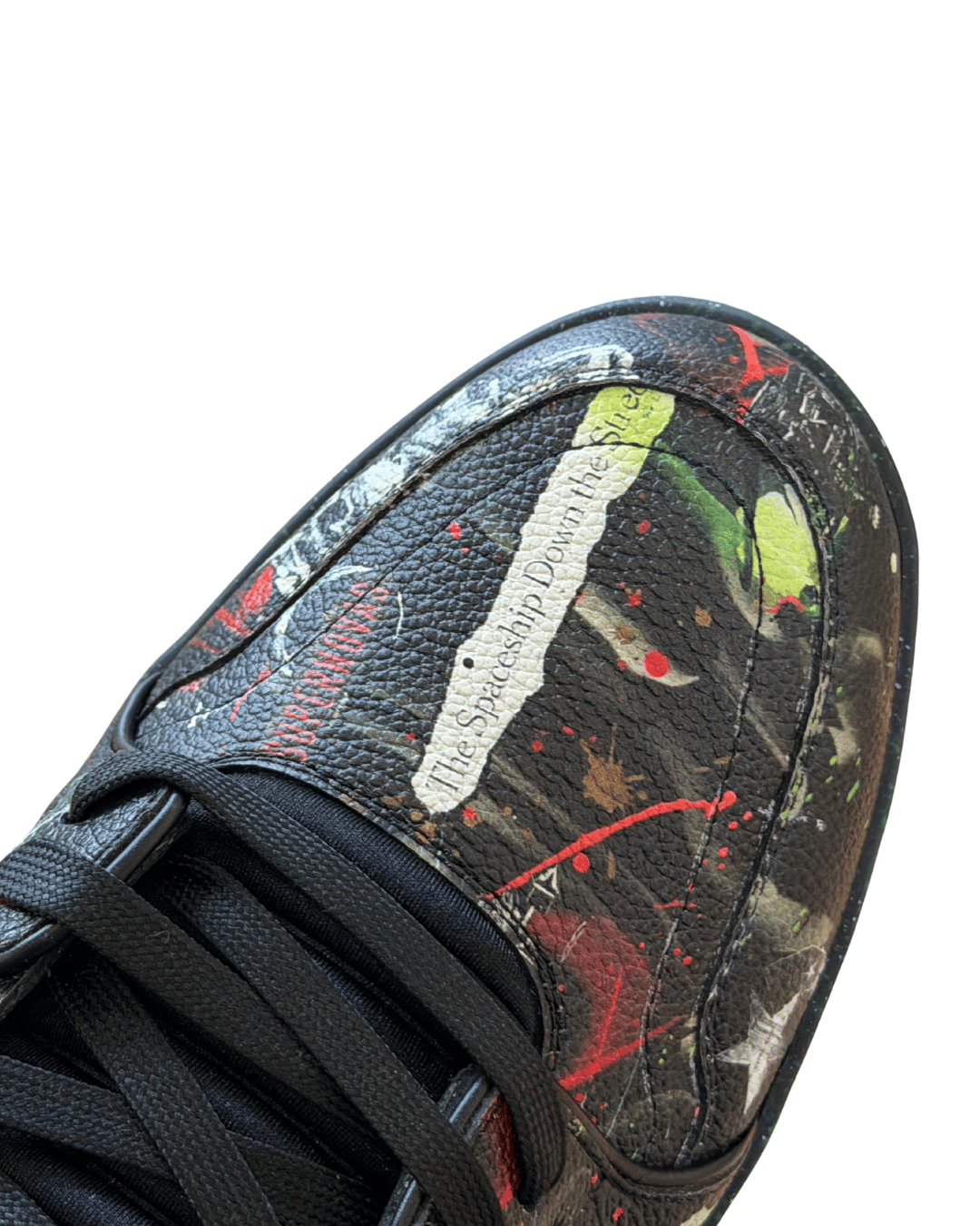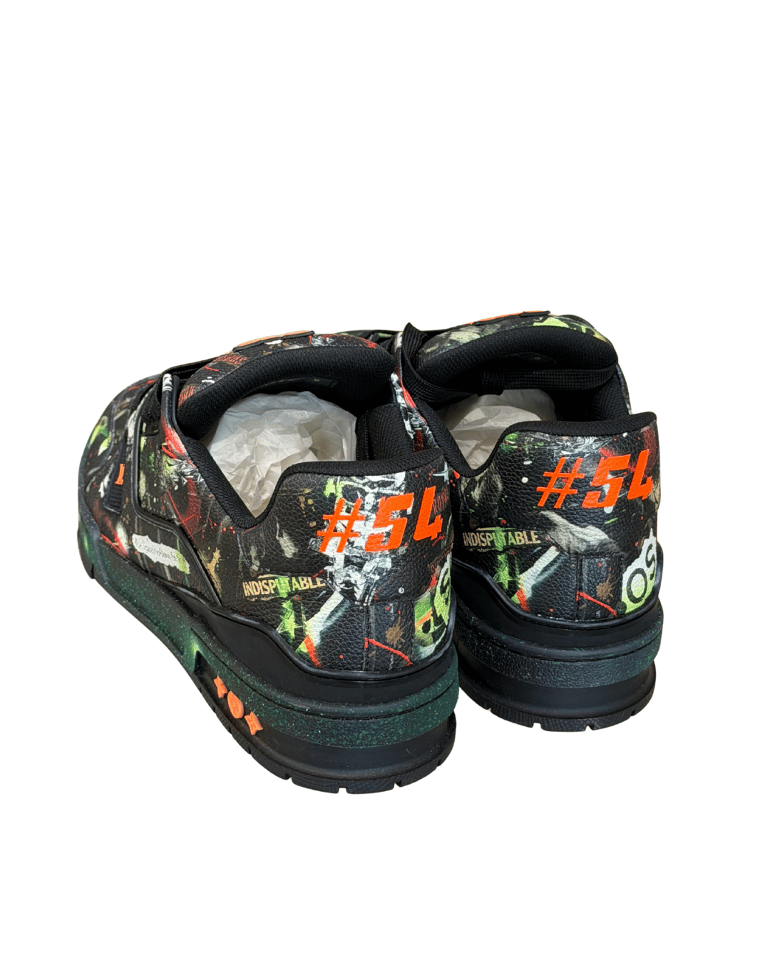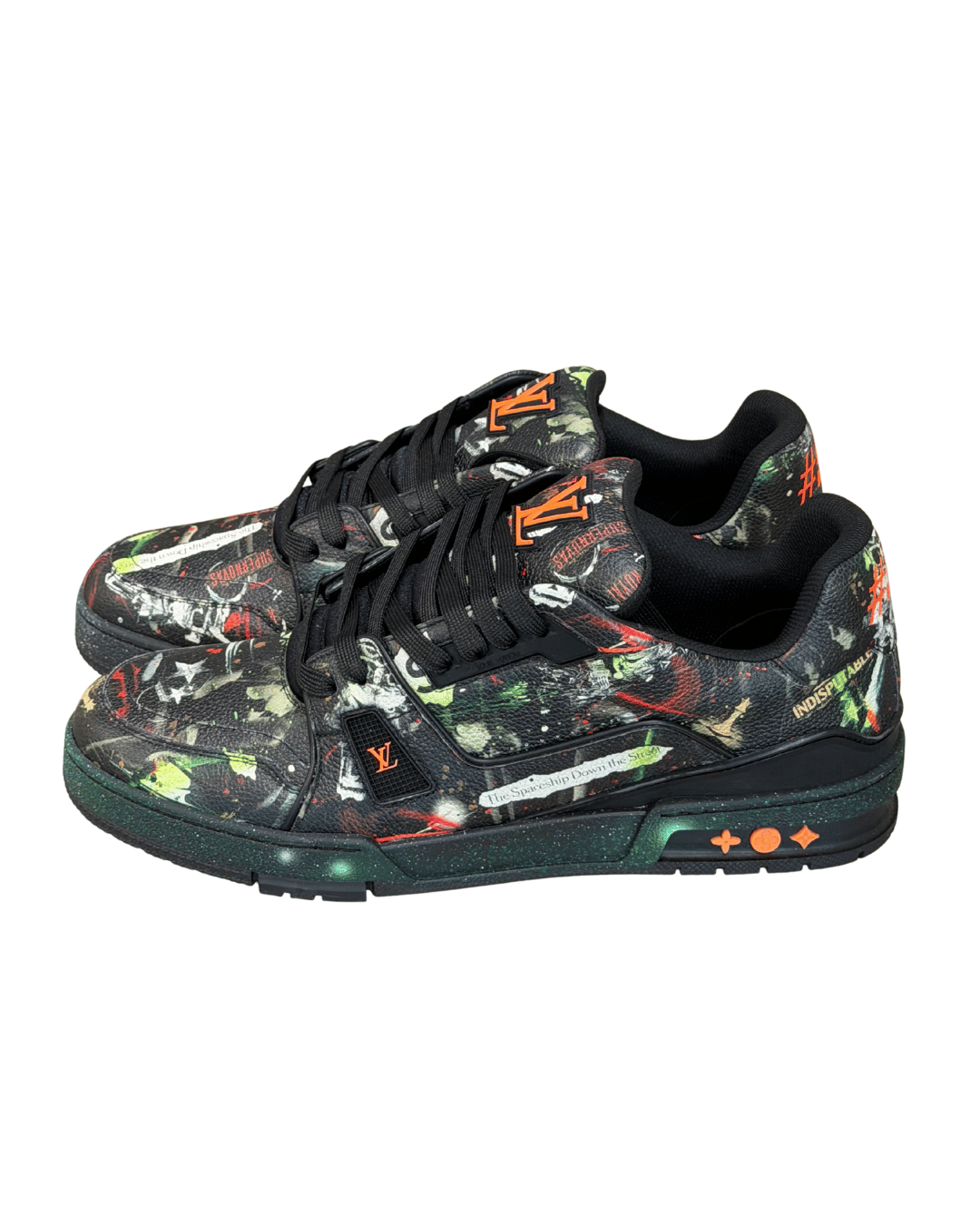 Questa versione si distingue per la stampa all-over effetto graffiti e paint splash, ispirata all’estetica street e all’arte contemporanea, cifra stilistica centrale del lavoro di Abloh per Louis Vuitton. La tomaia è realizzata in pelle di vitello martellata, decorata con scritte, simboli e dettagli grafici iconici, tra cui la frase “The Spaceship Down the Street”, il numero #54 sul tallone e la scritta “Indispensable”, elementi che rendono il modello immediatamente riconoscibile e altamente collezionabile.