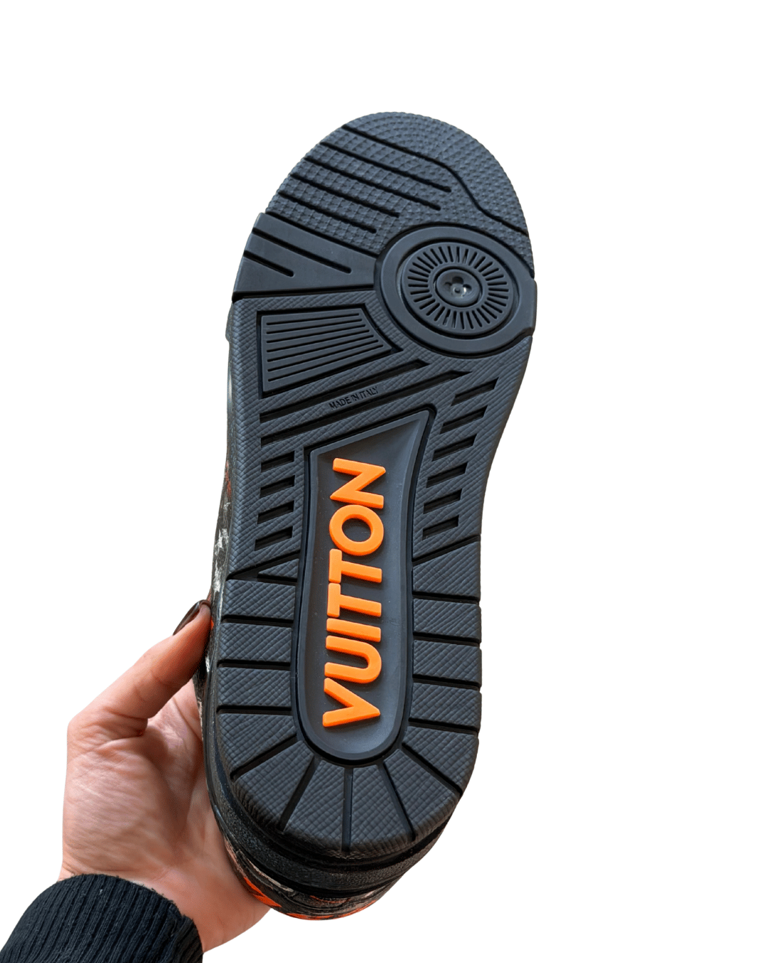 Il logo LV in contrasto arancione compare sulla linguetta e sui lati, mentre la suola in gomma tecnica, impreziosita dal branding Louis Vuitton e da inserti Monogram, garantisce comfort e stabilità. Questo modello appartiene a una edizione stagionale oggi fuori produzione, non più disponibile nelle boutique Louis Vuitton, ed è tra le varianti più ricercate della linea LV Trainer #54 grazie al suo forte impatto visivo e al legame diretto con l’eredità creativa di Virgil Abloh.