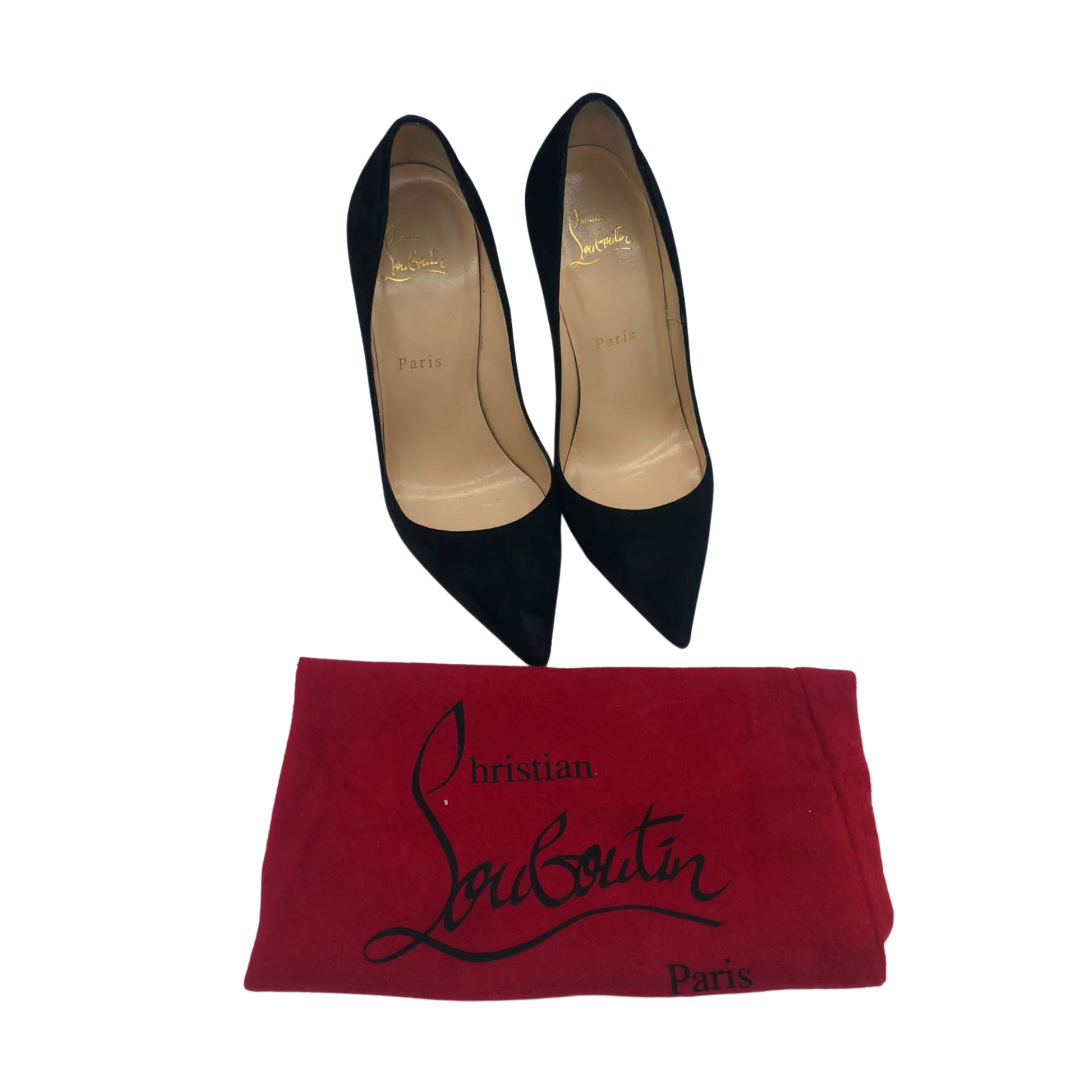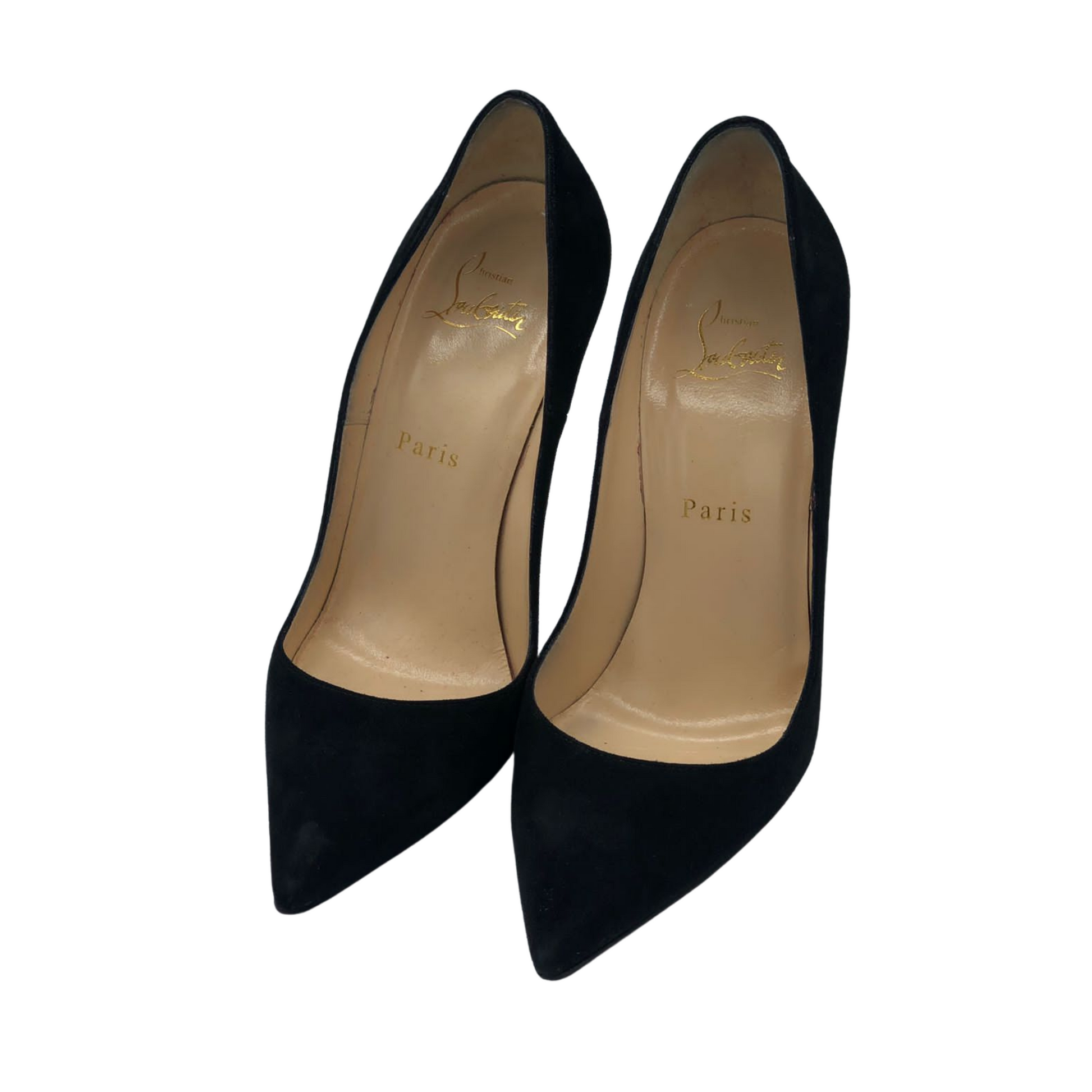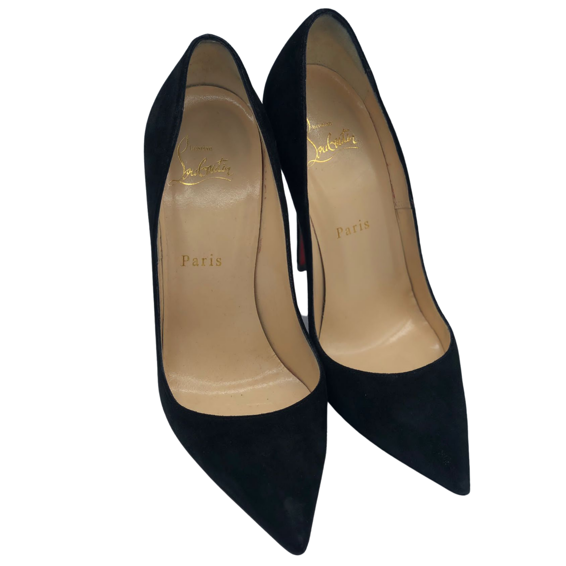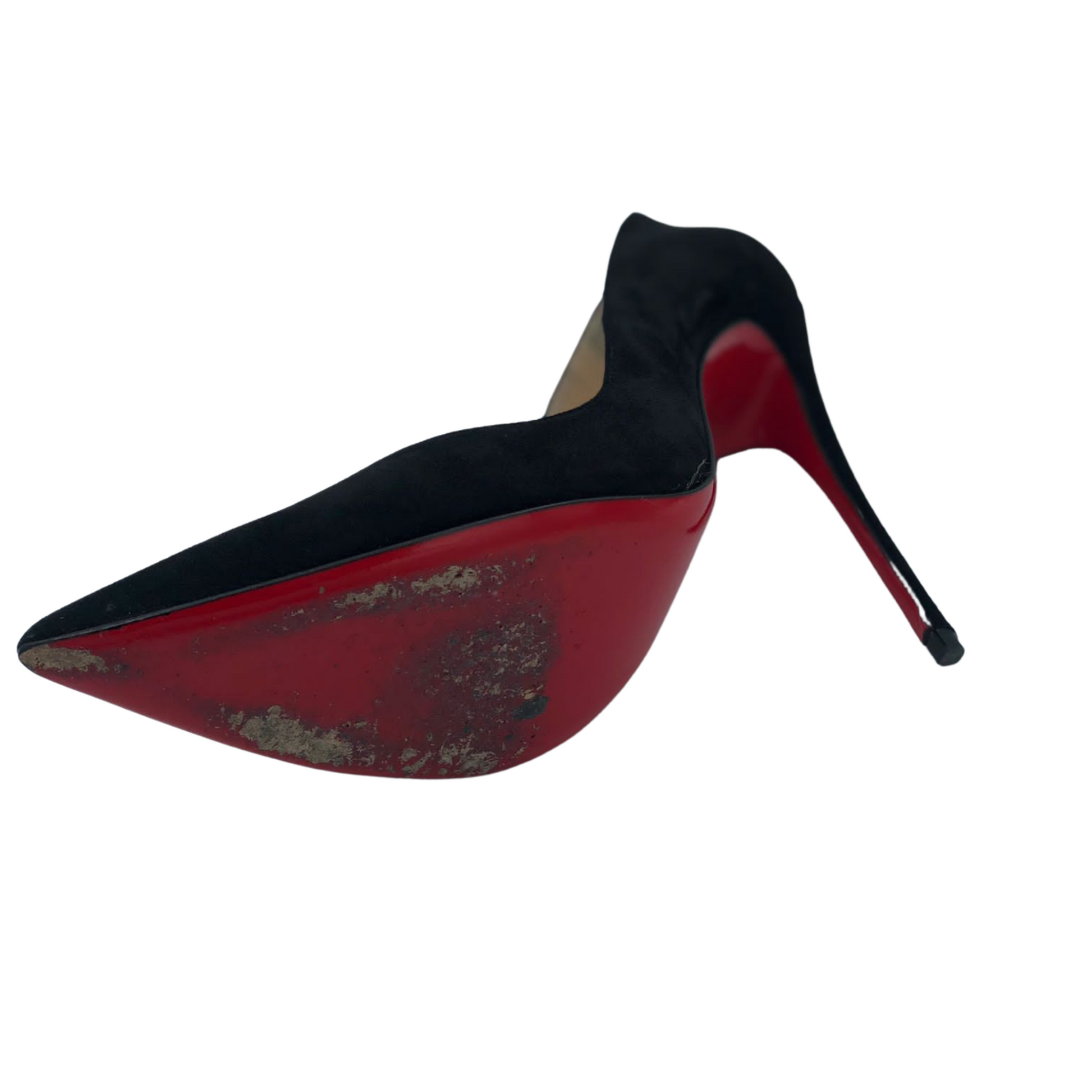 Decollete in pelle scamosciata nera di vitello. Punta snella. Tacco sottile 12cm. Suola in cuoio iconica laccata di rosso.