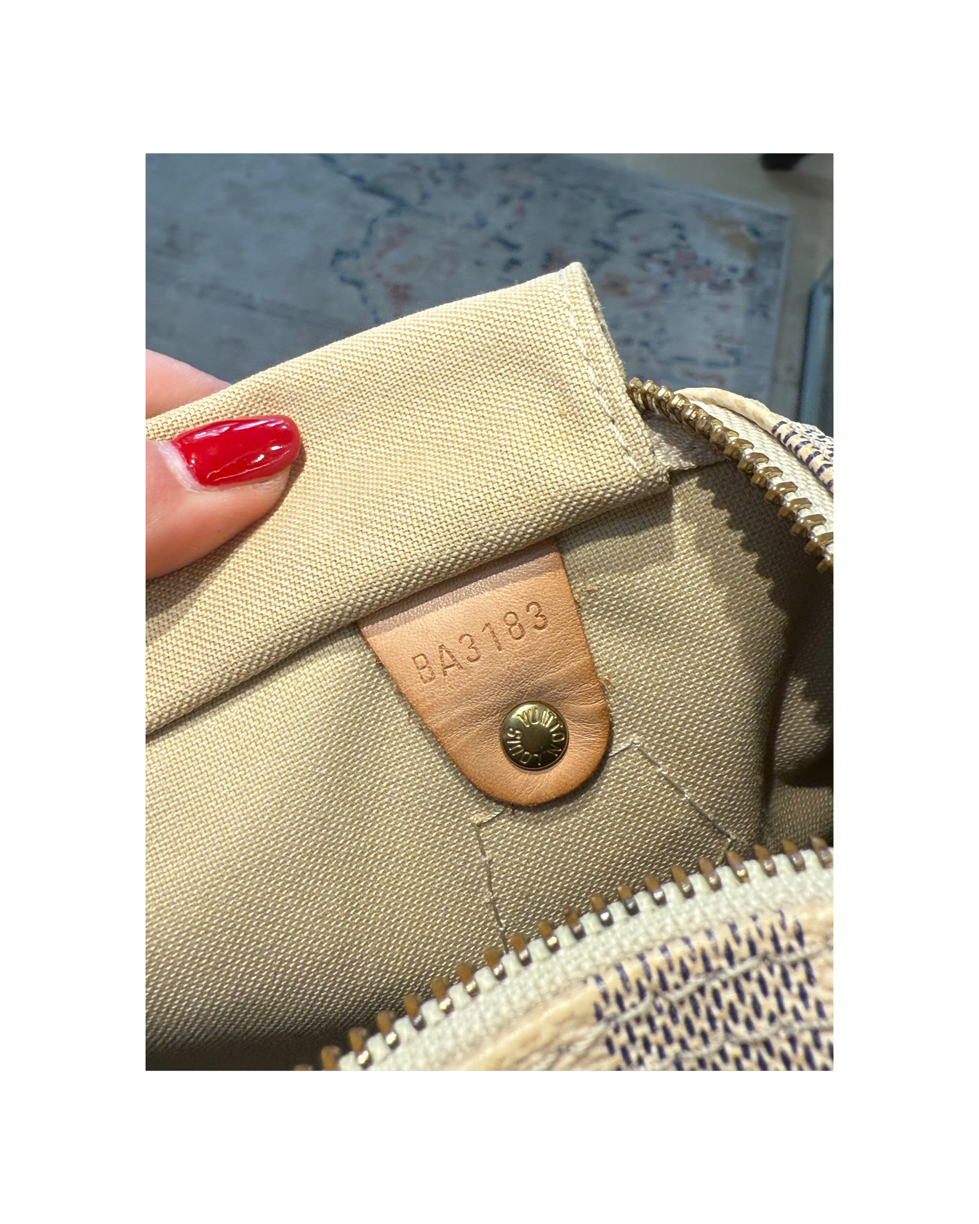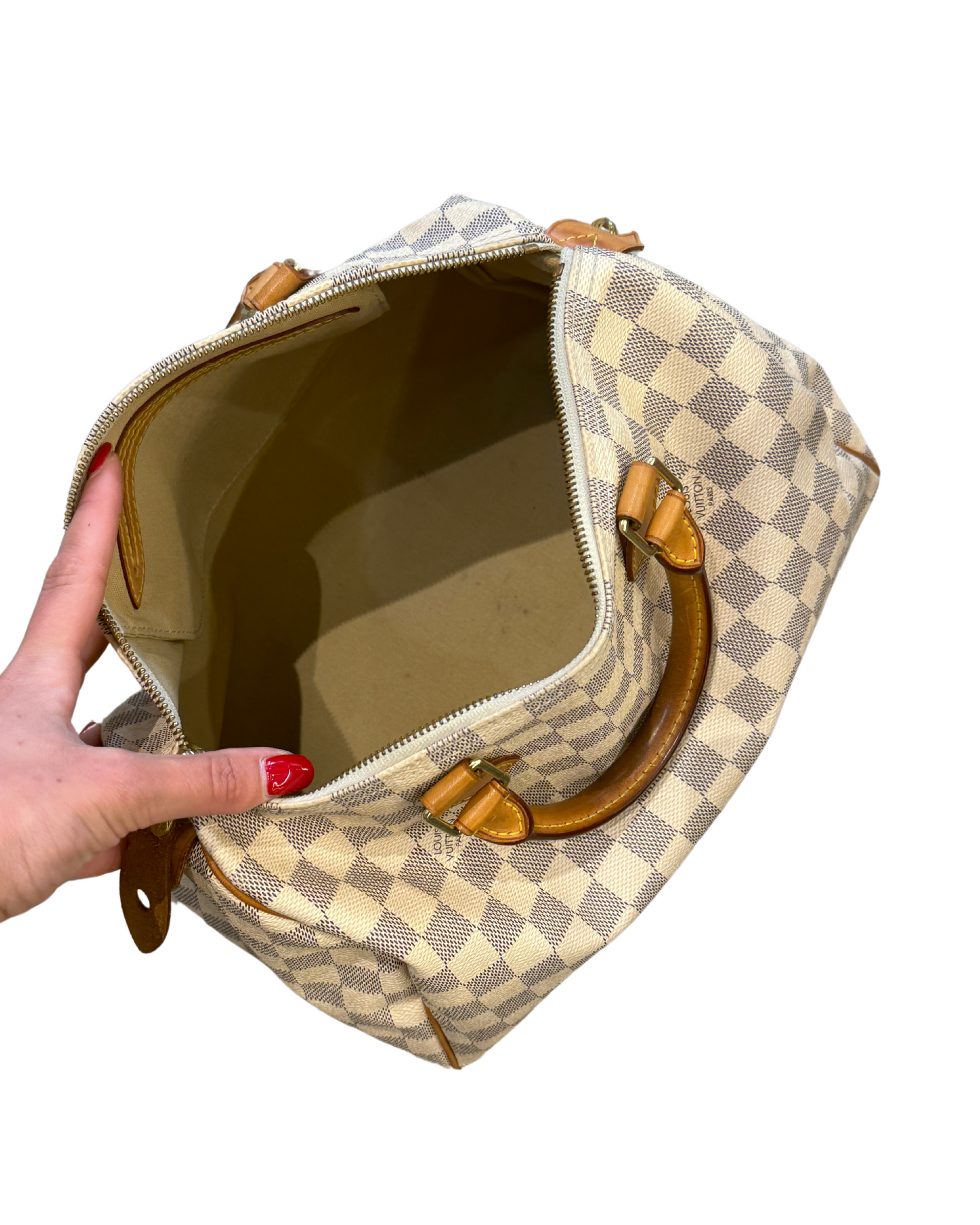 Speedy 30 , corpo in tela monogram Azur . Rifiniture in vacchetta naturale. Doppi manici superiori in pelle. Apertura superiore con cerniera , metalleria dorata. Interno in tessuto beige con tasca piatta. ( codice: BA3183)