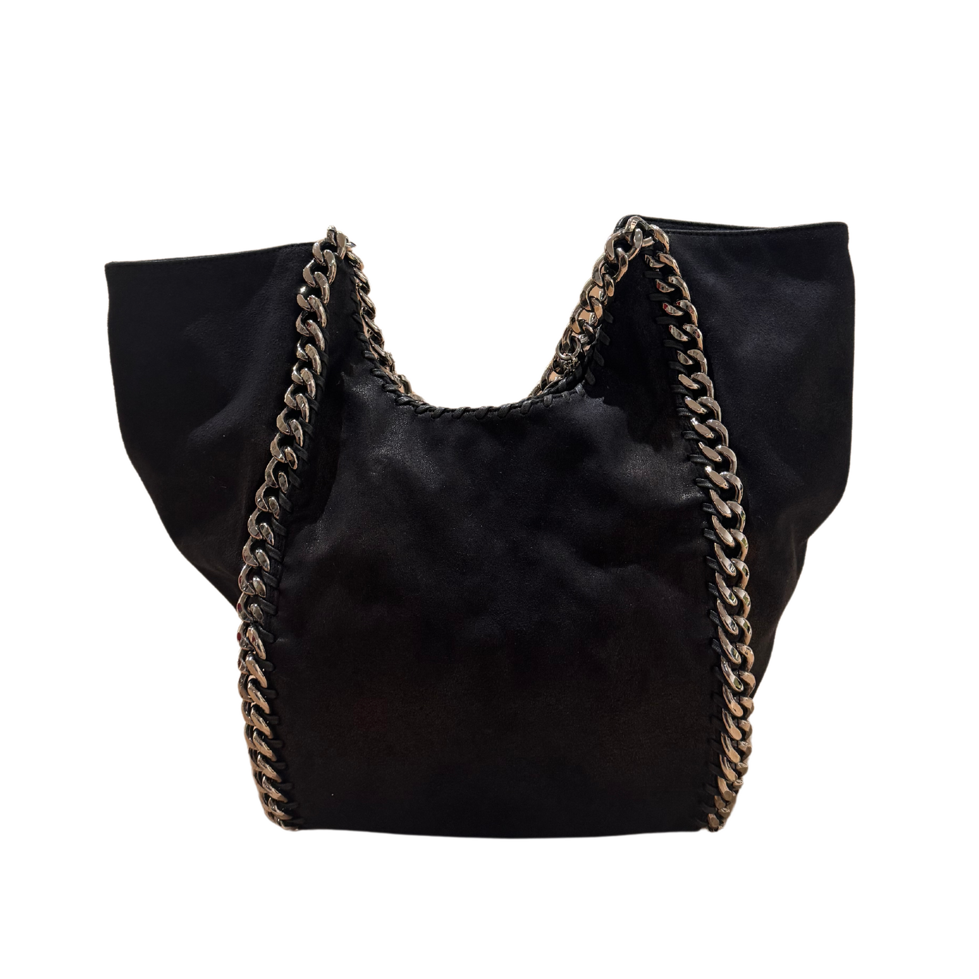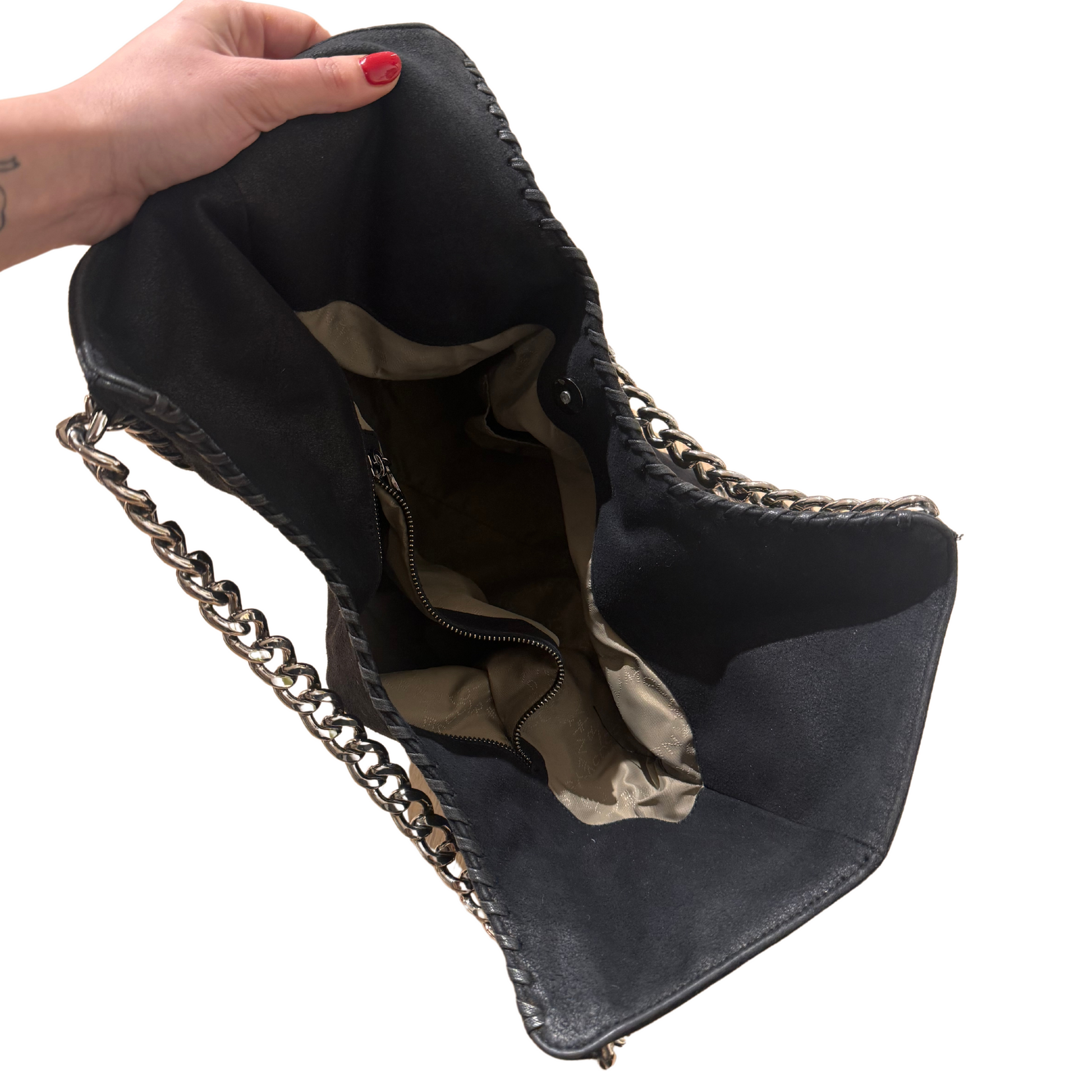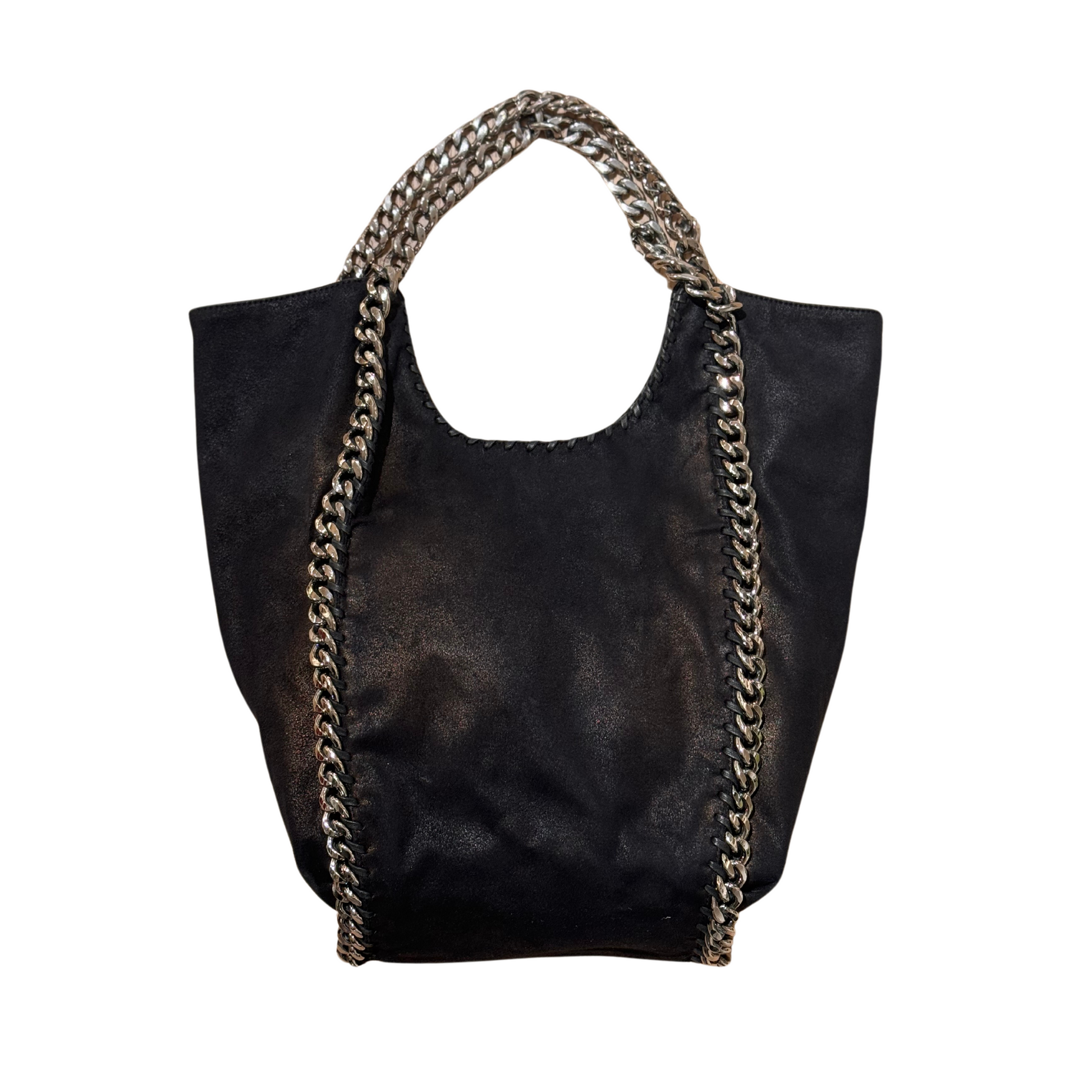 Borsa di Stella Mccartney modello non più in produzione in pelle vegana nera. Impreziosita da iconiche catene grosse argentate. Ciondolino riportante il nome della maison. Apertura magnetica. Interno in tessuto logato color tortora, tasca con cerniera.