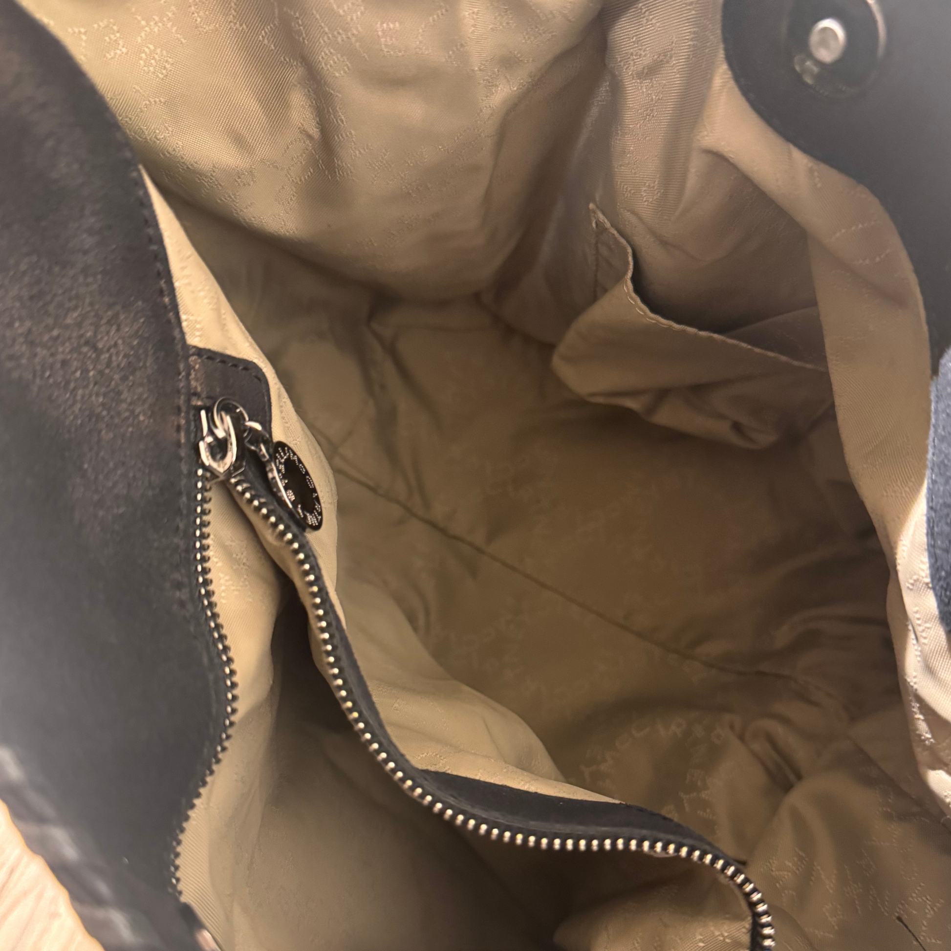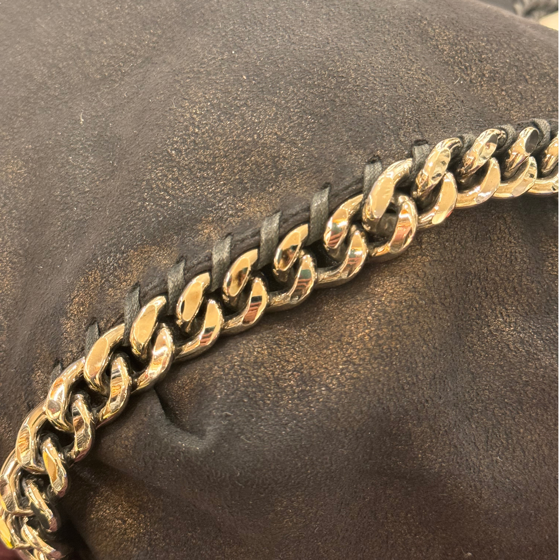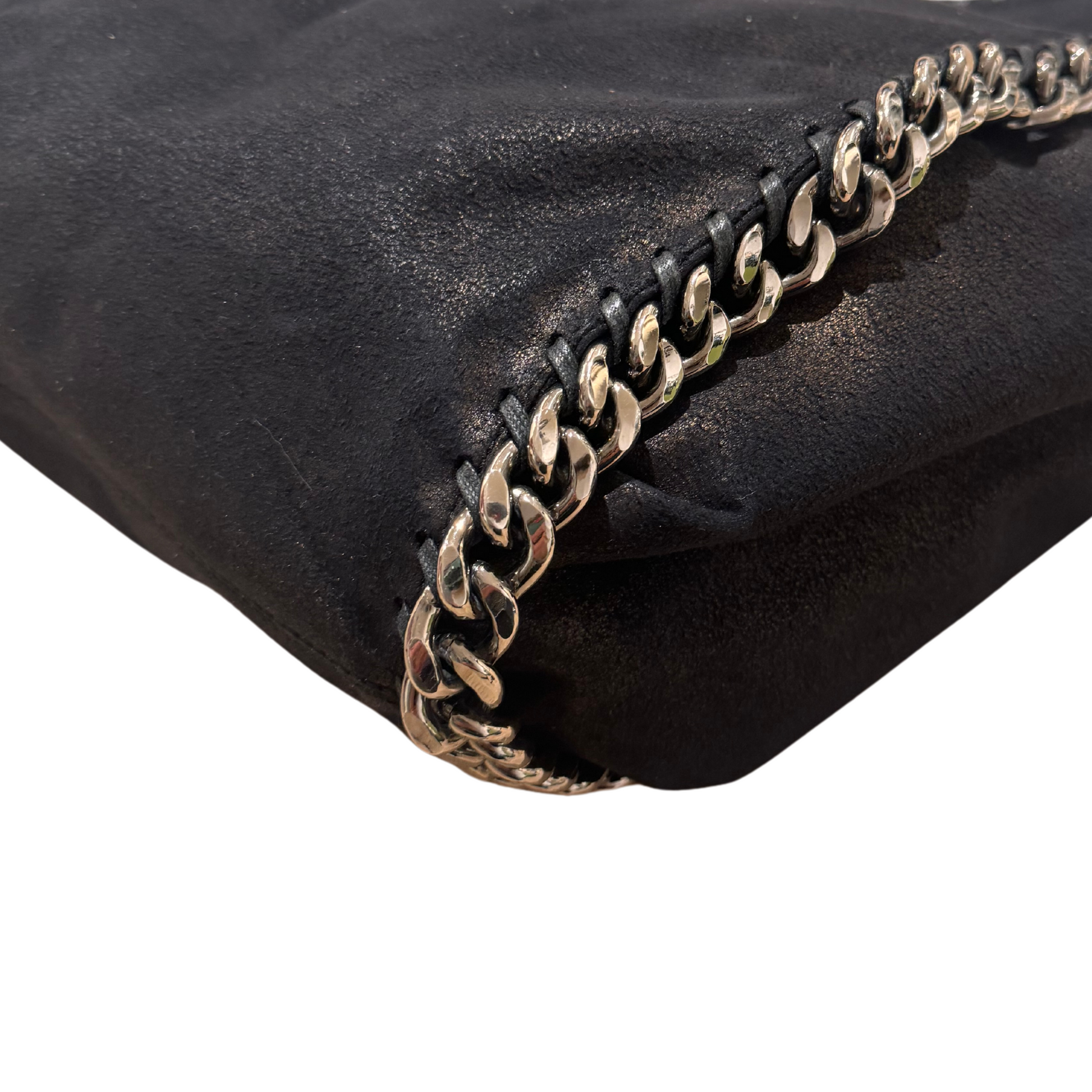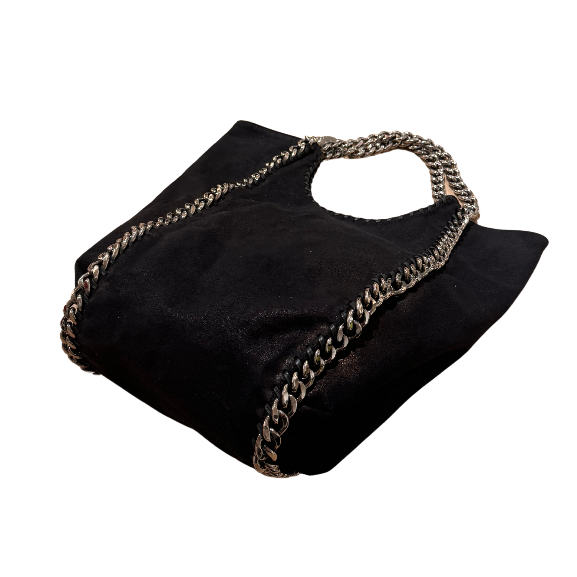 Borsa di Stella Mccartney modello non più in produzione in pelle vegana nera. Impreziosita da iconiche catene grosse argentate. Ciondolino riportante il nome della maison. Apertura magnetica. Interno in tessuto logato color tortora, tasca con cerniera.
