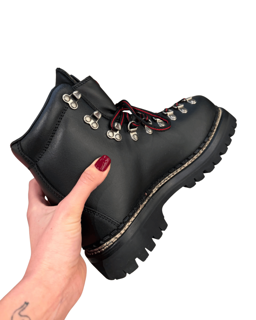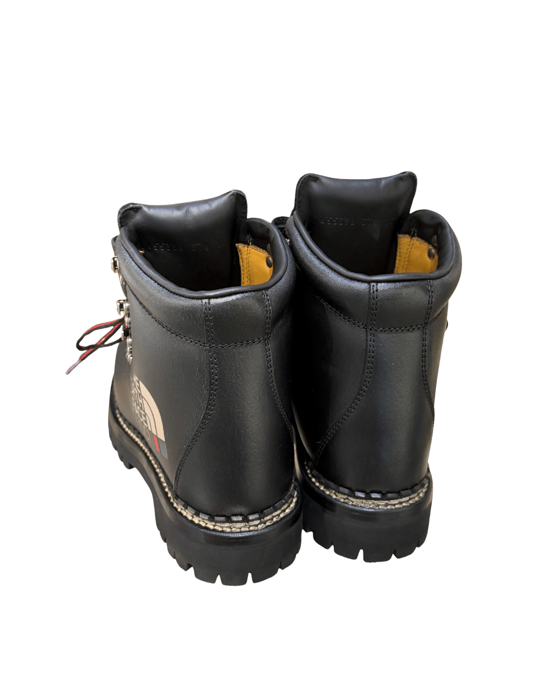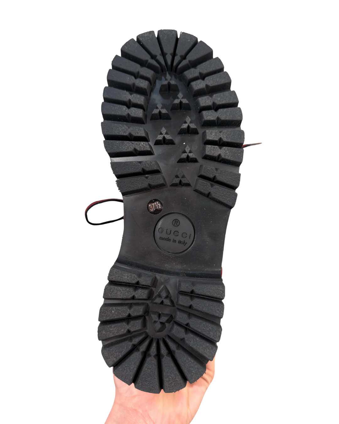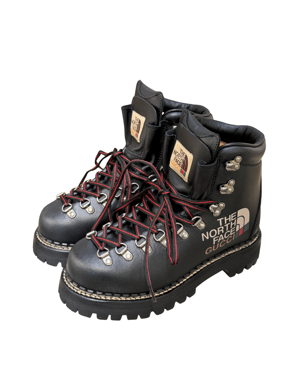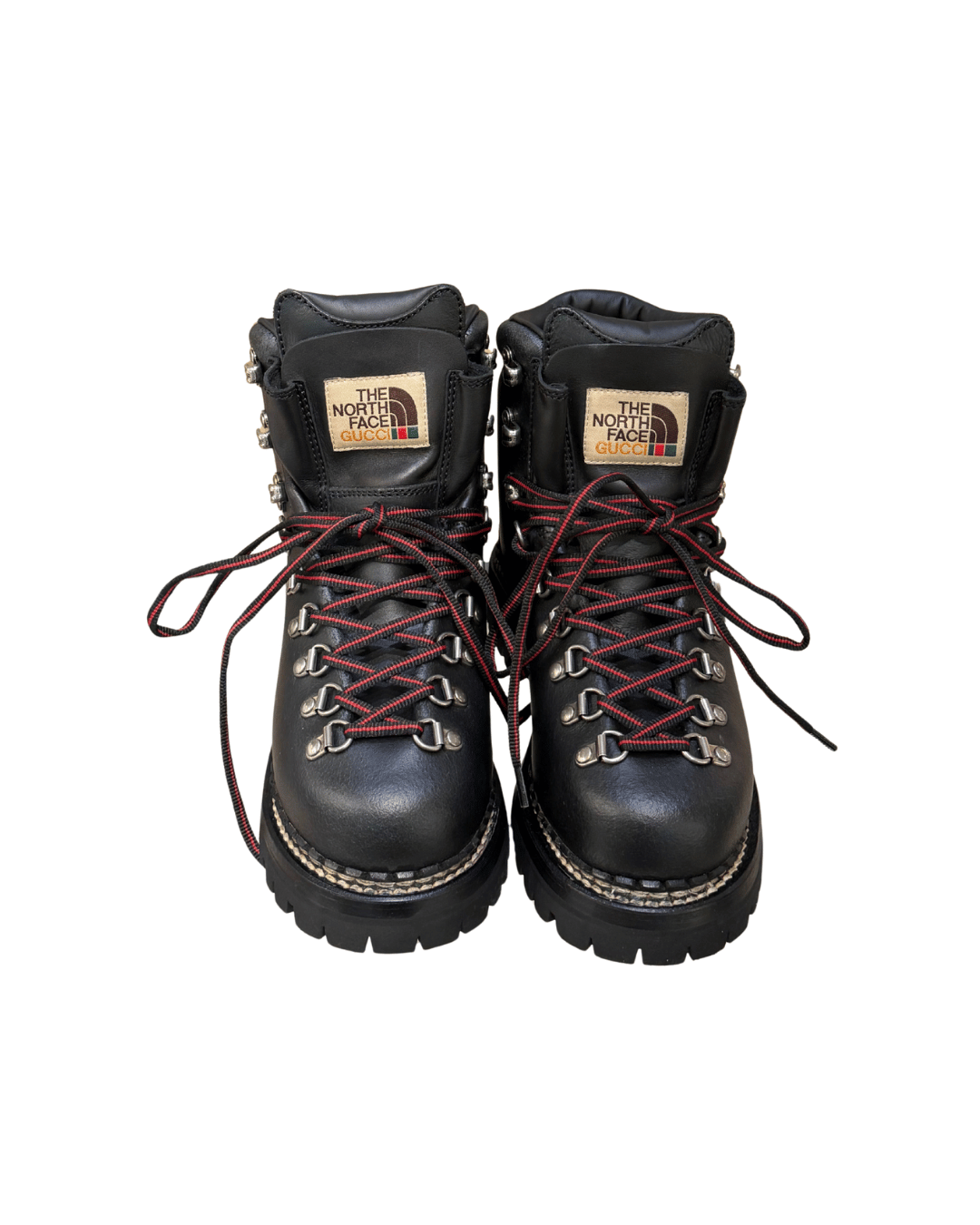 Stivaletti stringati Gucci x The North Face, nati dalla celebre collaborazione che fonde l’estetica luxury con il mondo outdoor. Realizzati in pelle nera liscia, presentano il logo The North Face Gucci stampato lateralmente, con richiami cromatici distintivi della collaborazione. La struttura è solida e avvolgente, pensata per garantire comfort e resistenza, con imbottitura alla caviglia e linguetta morbida. L’allacciatura con lacci tecnici neri e rossi e i ganci metallici rinforzati richiama i classici scarponcini da montagna reinterpretati in chiave fashion. La suola carrarmato in gomma, robusta e antiscivolo, è firmata Gucci . Interno in pelle, lavorazione artigianale Made in Italy.