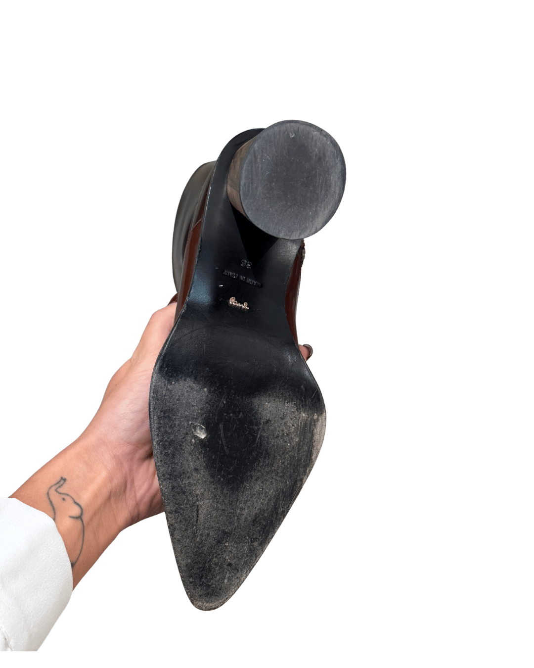 Un paio di stivaletti che non passano inosservati: realizzati in pelle lucida color bordeaux/ marrone degrado con punta affusolata, mixano linee grintose a dettagli sofisticati. Il tacco cilindrico in legno, alto e deciso, regala carattere e un tocco rétro, mentre la zip laterale dorata firmata Paul Smith aggiunge riconoscibilità e praticità. Un modello dallo stile deciso, perfetto per chi ama distinguersi senza rinunciare all’eleganza. Versatili da indossare sia con un denim dal taglio dritto sia con un abito midi, diventano il dettaglio protagonista di ogni look.