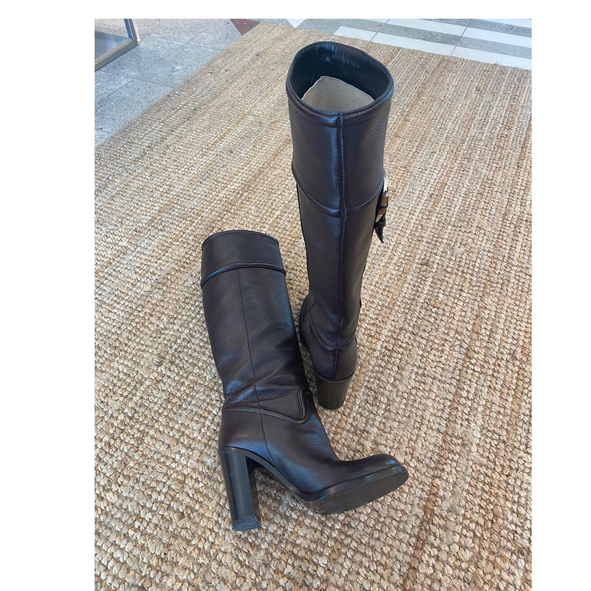 Stivali di Gucci in pelle martellata color cioccolato. Punta arrotondata, tacco grosso molto comodo di 10 cm.