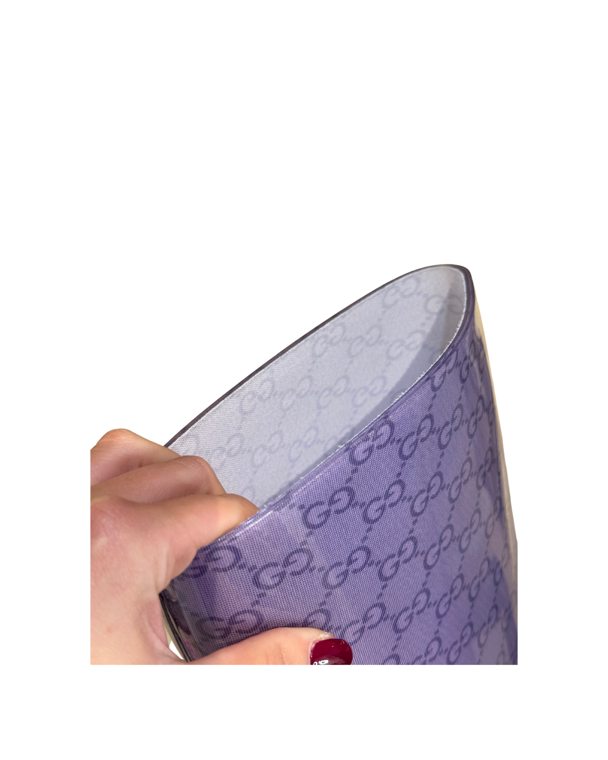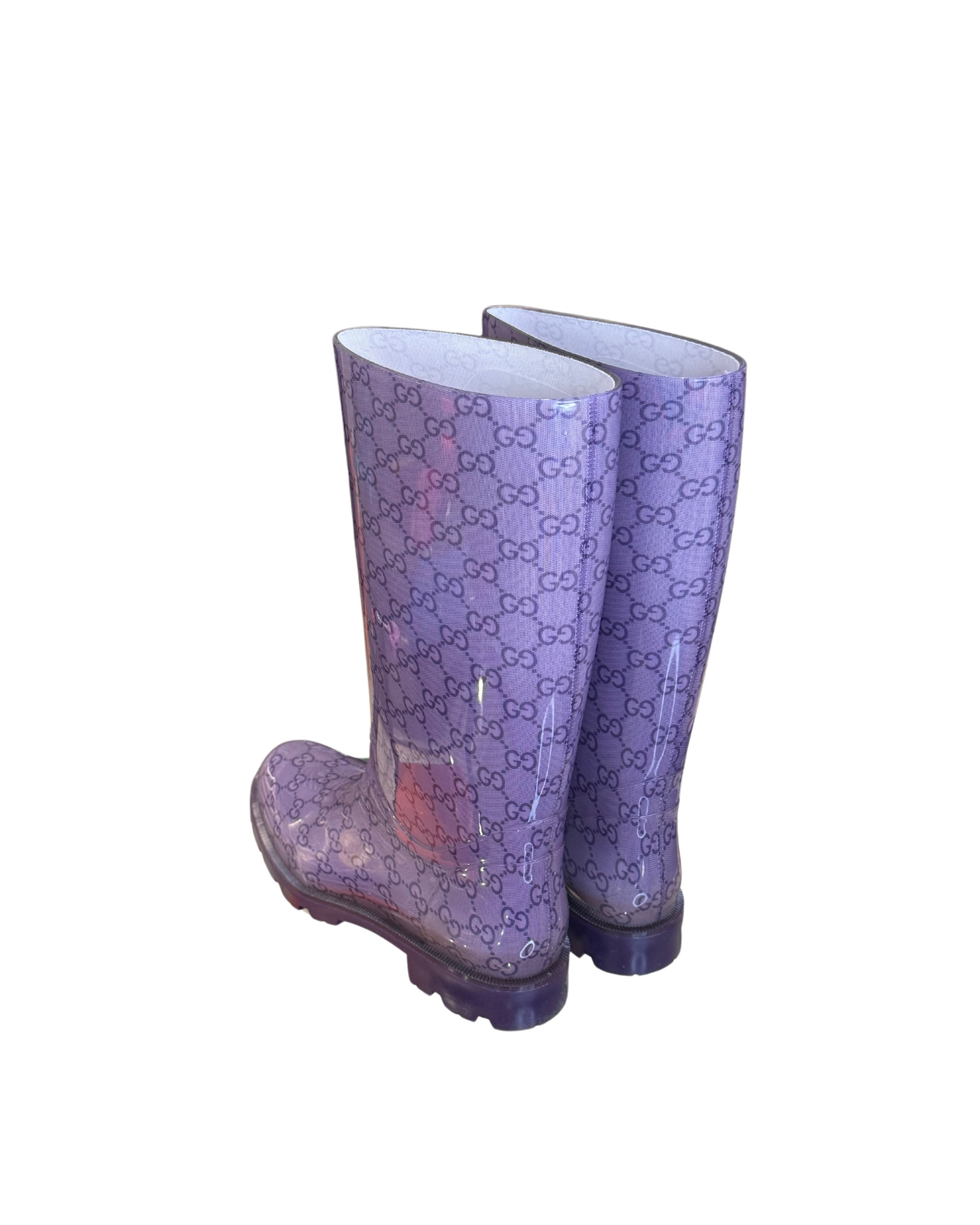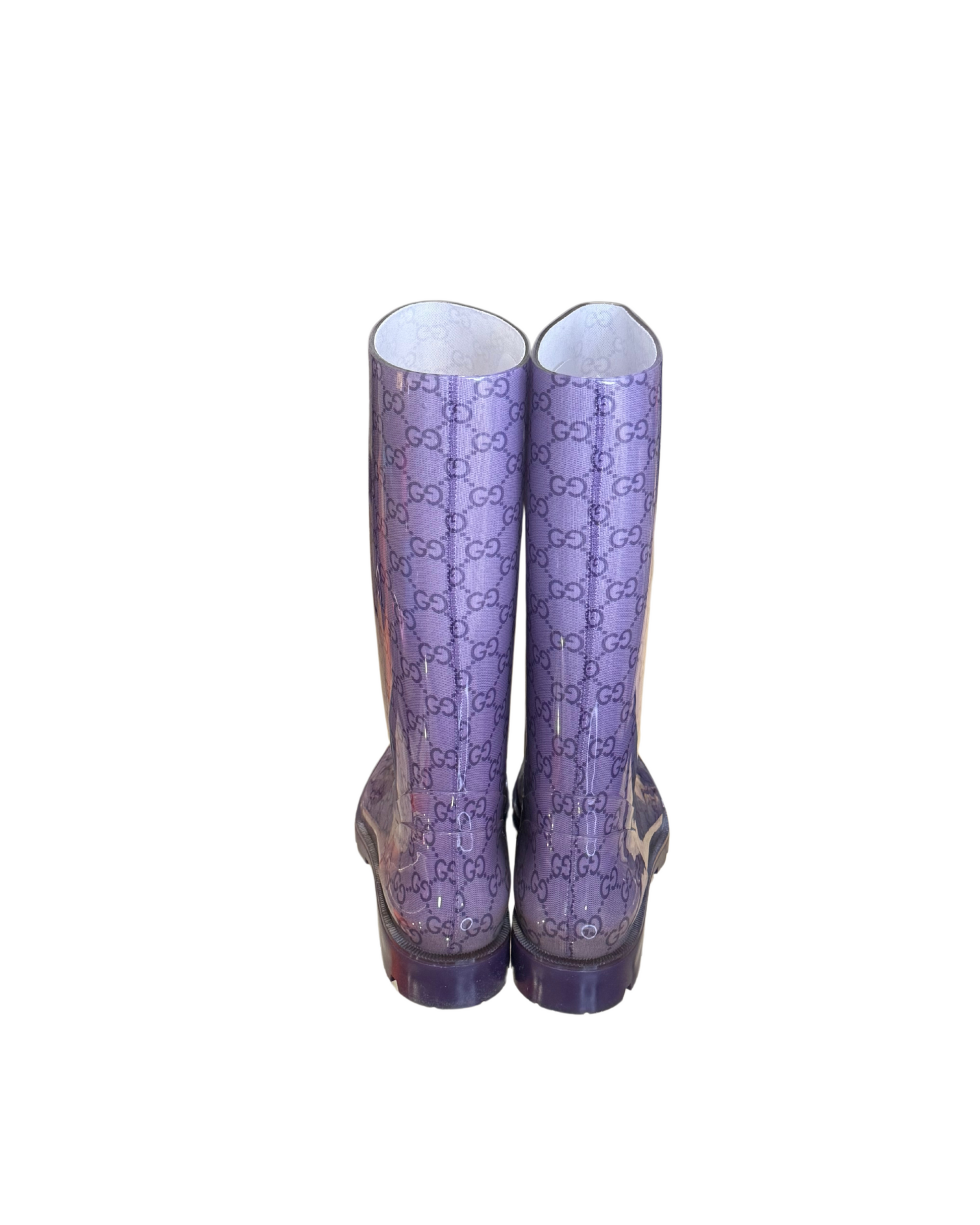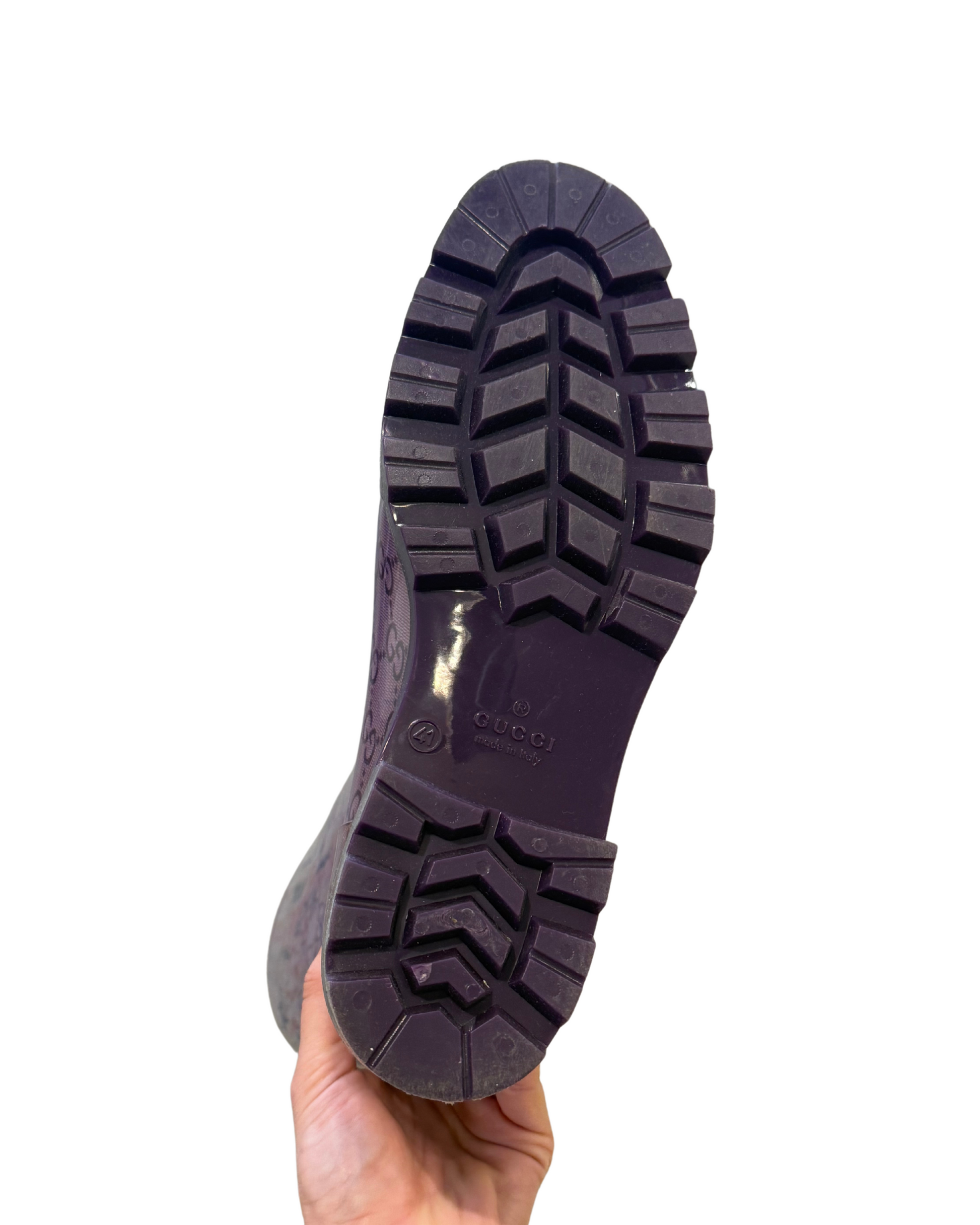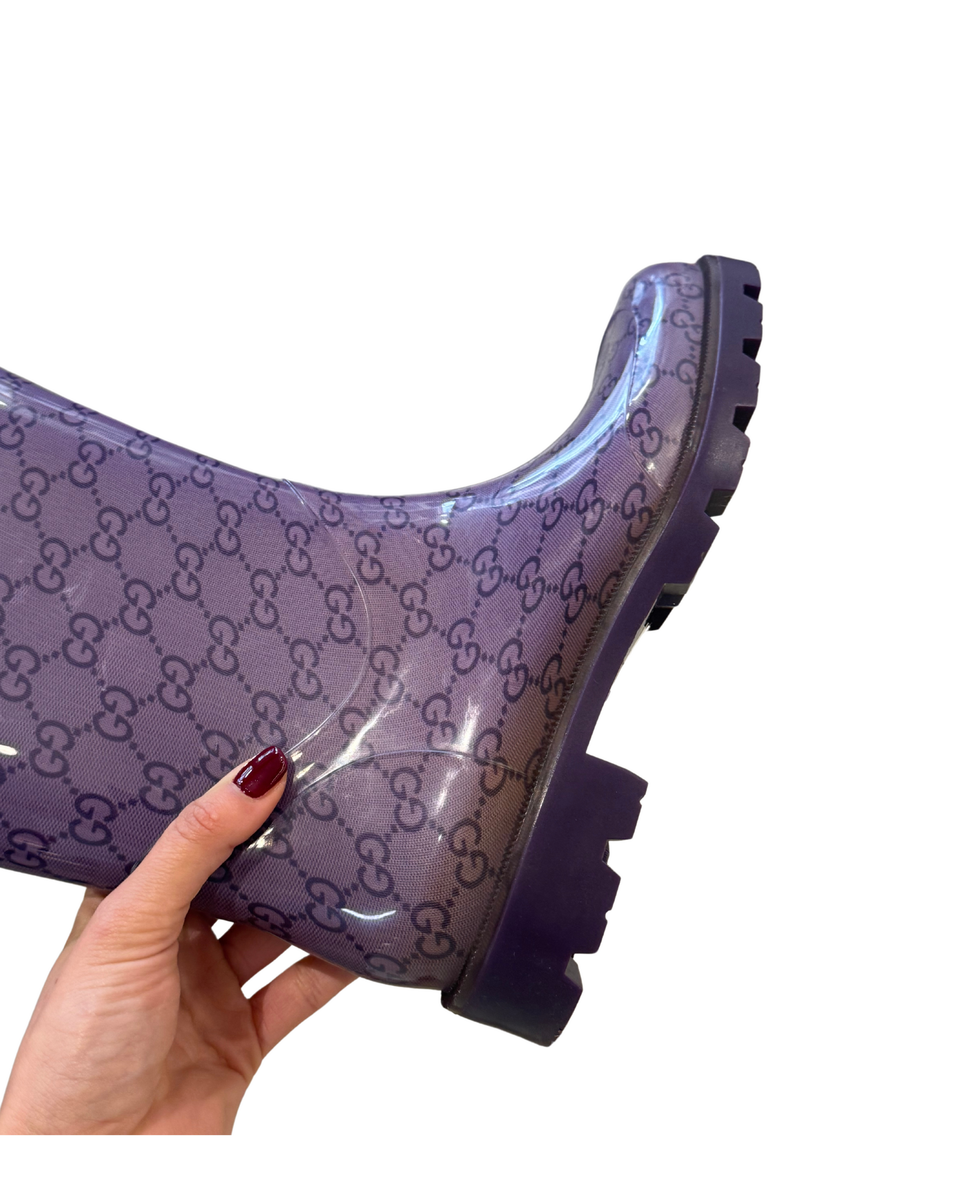 Stivali da pioggia di Gucci realizzati in resistente gomma trasparente lilla con stampa GG all-over in contrasto. Suola in gomma carrarmato. Interno fodera in tessuto.