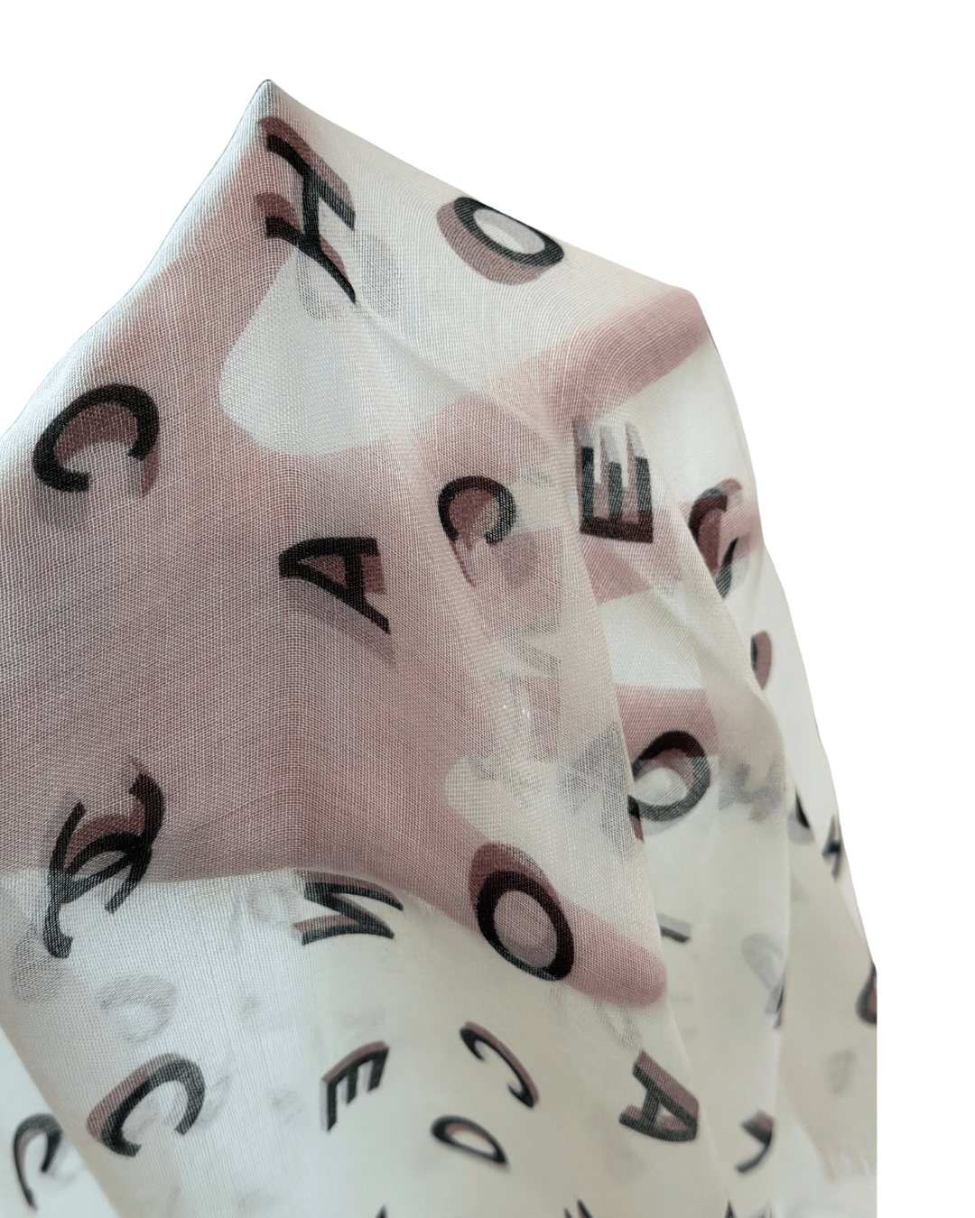Stola Chanel realizzata in leggero voile di misto cashmere (80%) e seta (20%), caratterizzata da una base color avorio delicata e luminosa. Il design è reso distintivo dalla stampa all-over con lettering Chanel e iconiche doppie C, distribuite in modo dinamico per un effetto moderno ma allo stesso tempo senza tempo.