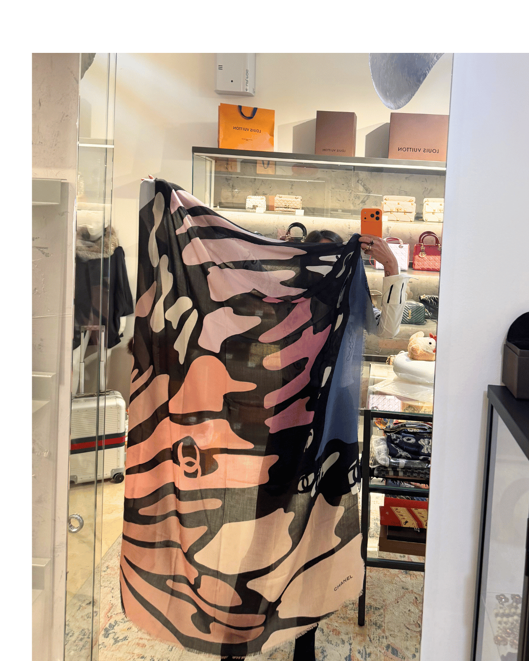 Meravigliosa stola Chanel realizzata in 100% cashmere Made in Italy, morbidissima e leggerissima sulla pelle. La fantasia camouflage reinterpretata in tonalità eleganti di nero, beige, rosa cipria e grigio rende questo accessorio moderno ma allo stesso tempo raffinato, perfetto per completare look casual chic o outfit più eleganti. Il logo Chanel discreto sul bordo aggiunge un tocco iconico senza essere eccessivo. Ideale da indossare sulle spalle, come sciarpa avvolgente