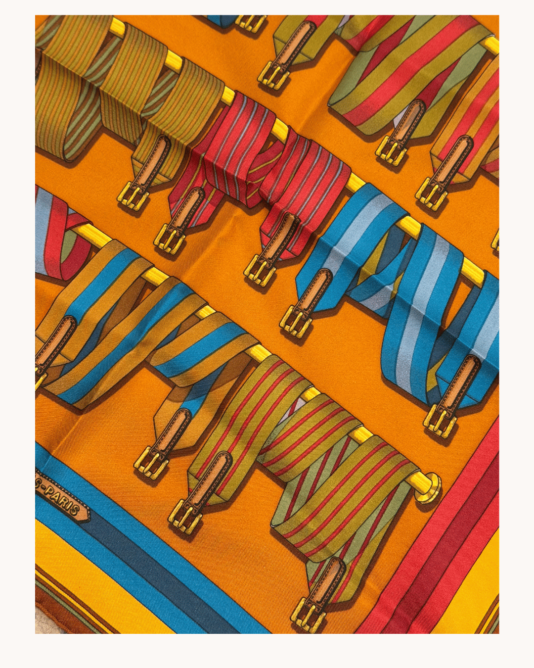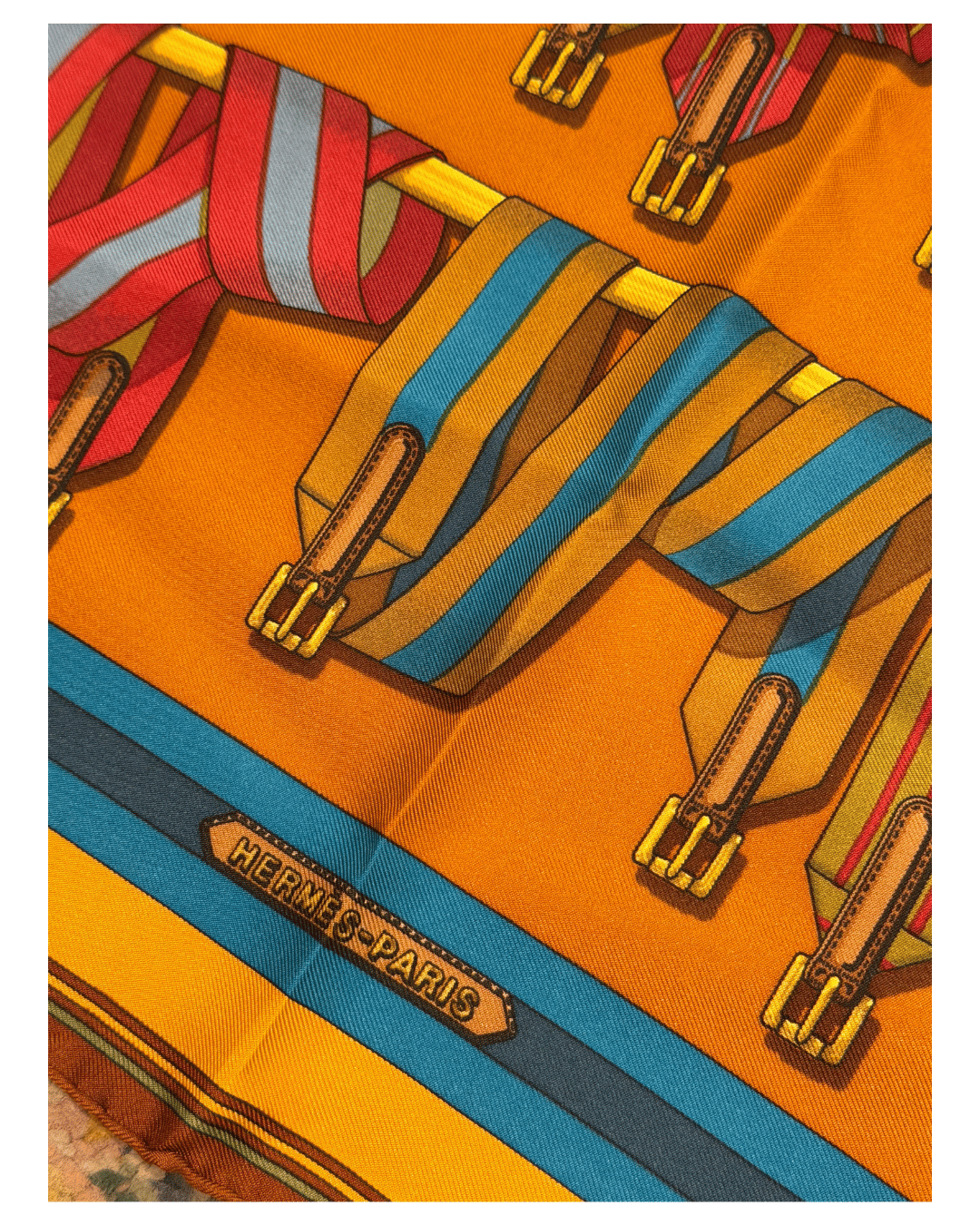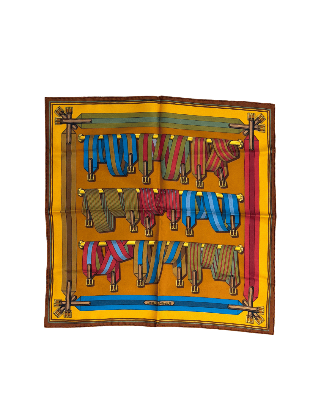 Carré Hermès realizzato in seta, caratterizzato da un raffinato motivo grafico ispirato al mondo equestre, con cinture e fibbie finemente illustrate, elemento iconico della maison. Il disegno si sviluppa su una base calda dai toni dell’ocra e del giallo, arricchita da dettagli multicolor che spaziano dal blu al verde, fino alle sfumature del rosso, creando un insieme vivace ma estremamente equilibrato. La seta presenta una mano liscia e luminosa, tipica della produzione Hermès, ideale da indossare al collo, tra i capelli, oppure come accessorio decorativo su borse e outfit.