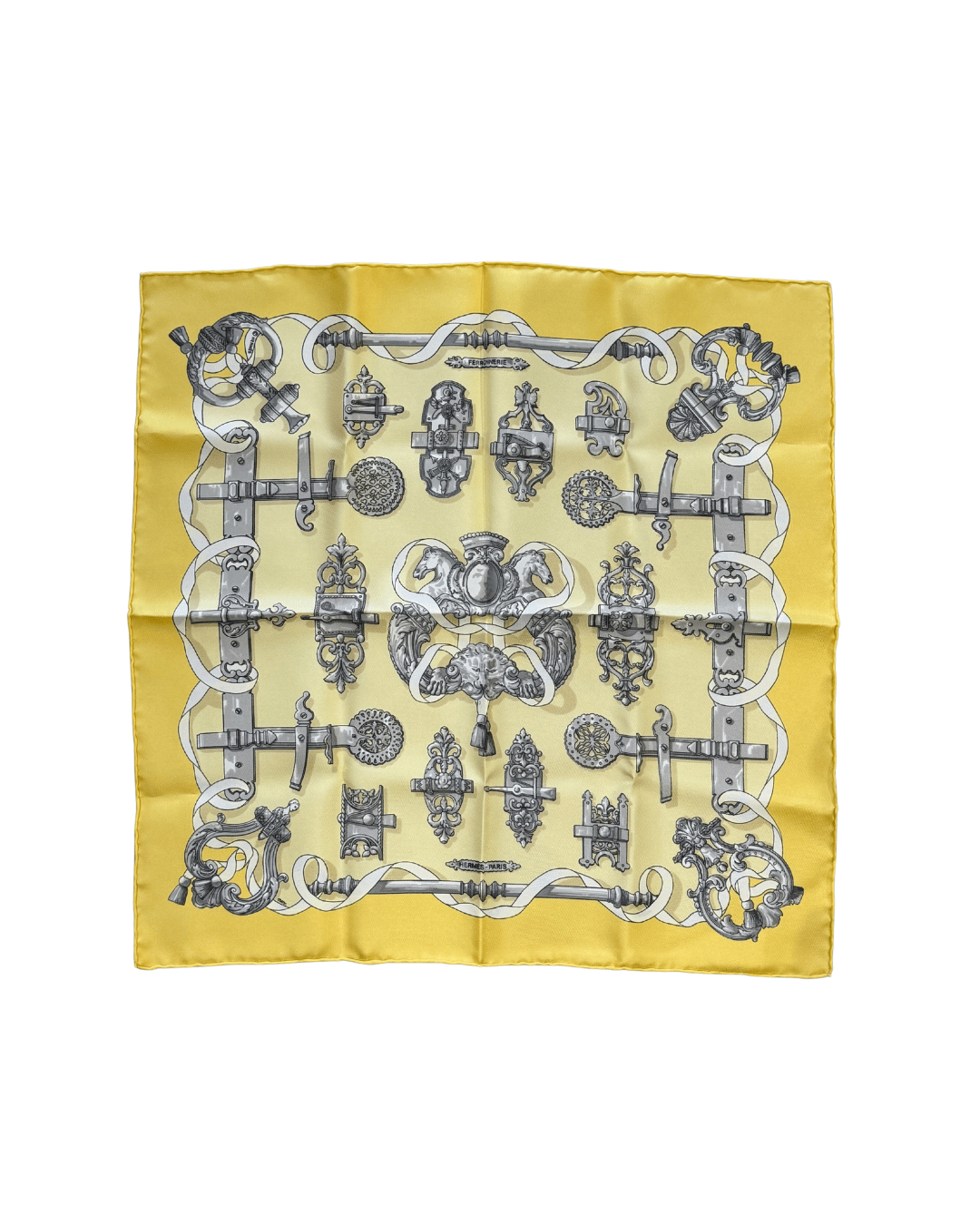 Carré Hermès Paris realizzato in seta 100% (fabriqué en France), caratterizzato da una raffinata stampa su fondo giallo con motivo decorativo ispirato al mondo dell’artigianato artistico e delle ferronnerie, tema ricorrente nella tradizione grafica della Maison. Il disegno, estremamente dettagliato, raffigura elementi ornamentali in stile classico – serrature, chiavistelli e decori metallici – intrecciati da nastri chiari che incorniciano la composizione centrale. La palette cromatica gioca sui toni del grigio e avorio creando un elegante contrasto con il fondo luminoso. Perfetto da indossare al collo, tra i capelli o come dettaglio su borse e capispalla.
