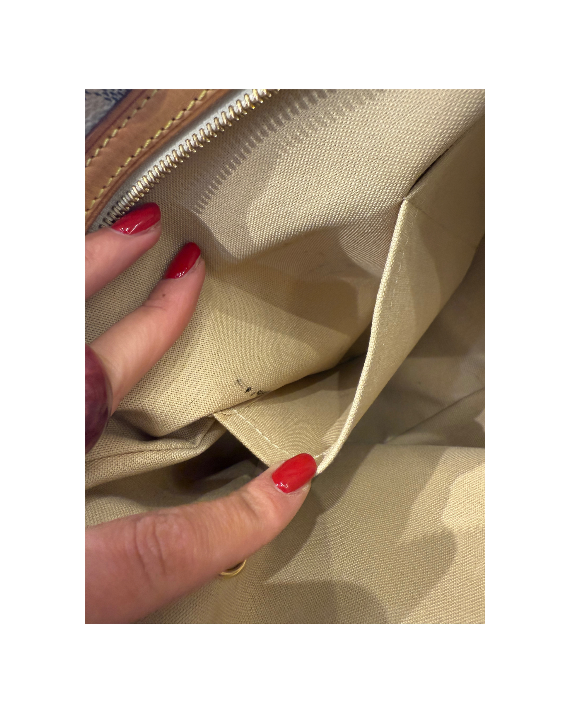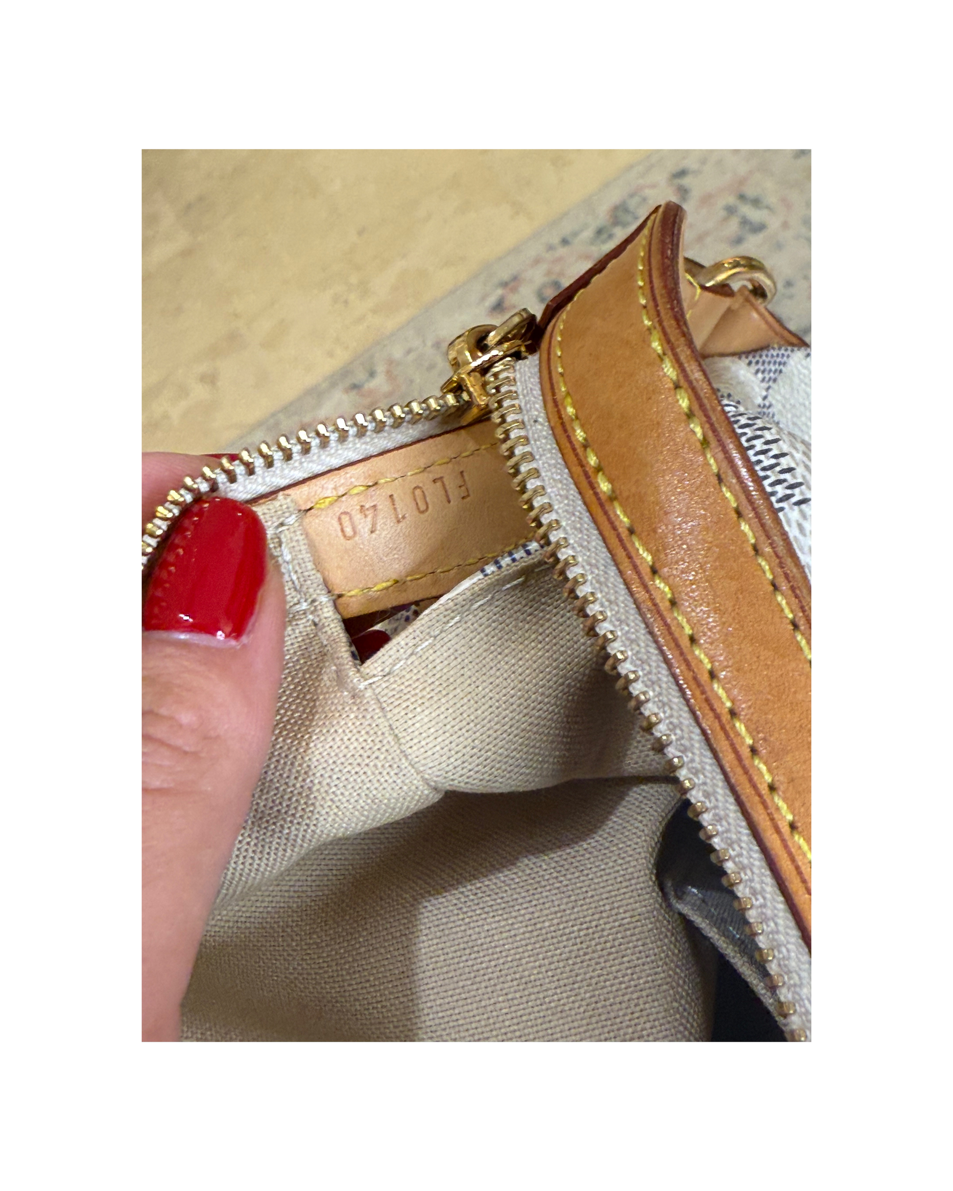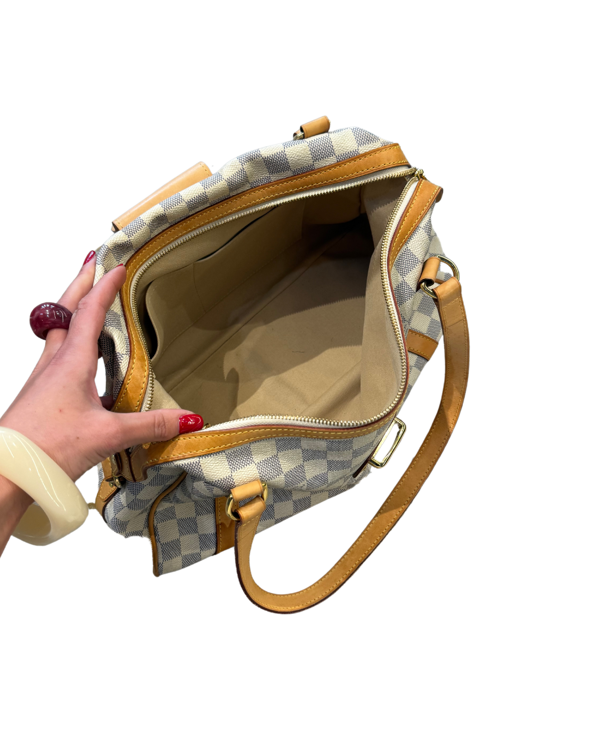 Stresa Louis Vuitton, corpo in tela Damier Azur, rifiniture in vacchetta naturale. Patta in pelle con Apertura a pressione e cerniera. Dettagli in metallo dorato. Sulla base sono presenti quattro piedini. Manici lunghi che permettono di portarla comodamente a spalla o a mano. Interno in tessuto beige, due tasche piatte. (CODICE: FL0140)
