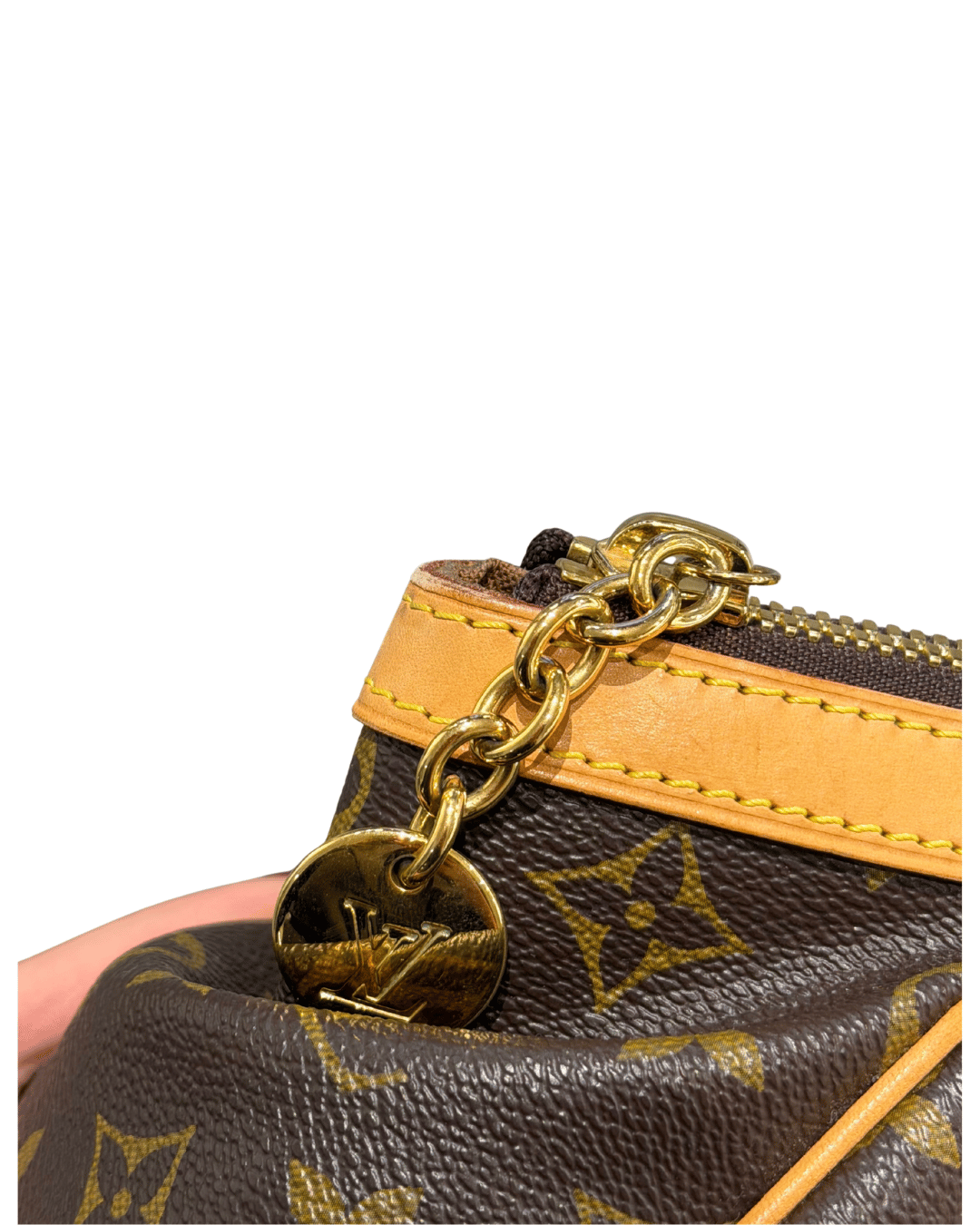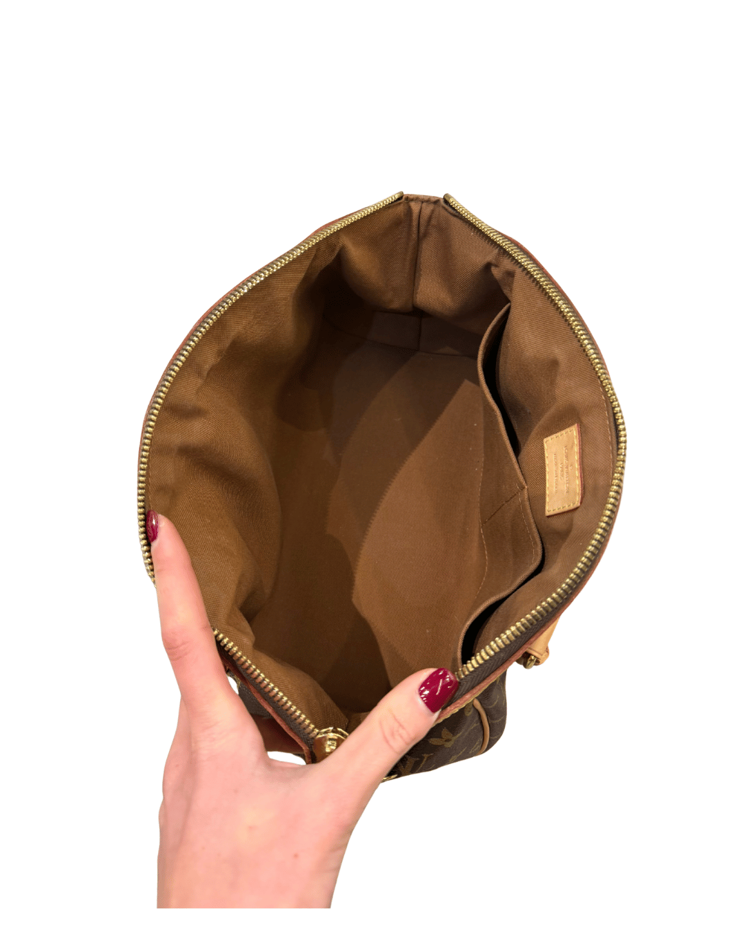 Tivoli PM Louis Vuitton, corpo in tela monogram e finiture in vacchetta naturale. Manici arrotolati in pelle. Apertura superiore con cerniera, dettagli metallo dorato. Interno in tessuto marrone, tasche piatte. Cinque piedini d'appoggio. (CODICE: AH2182)