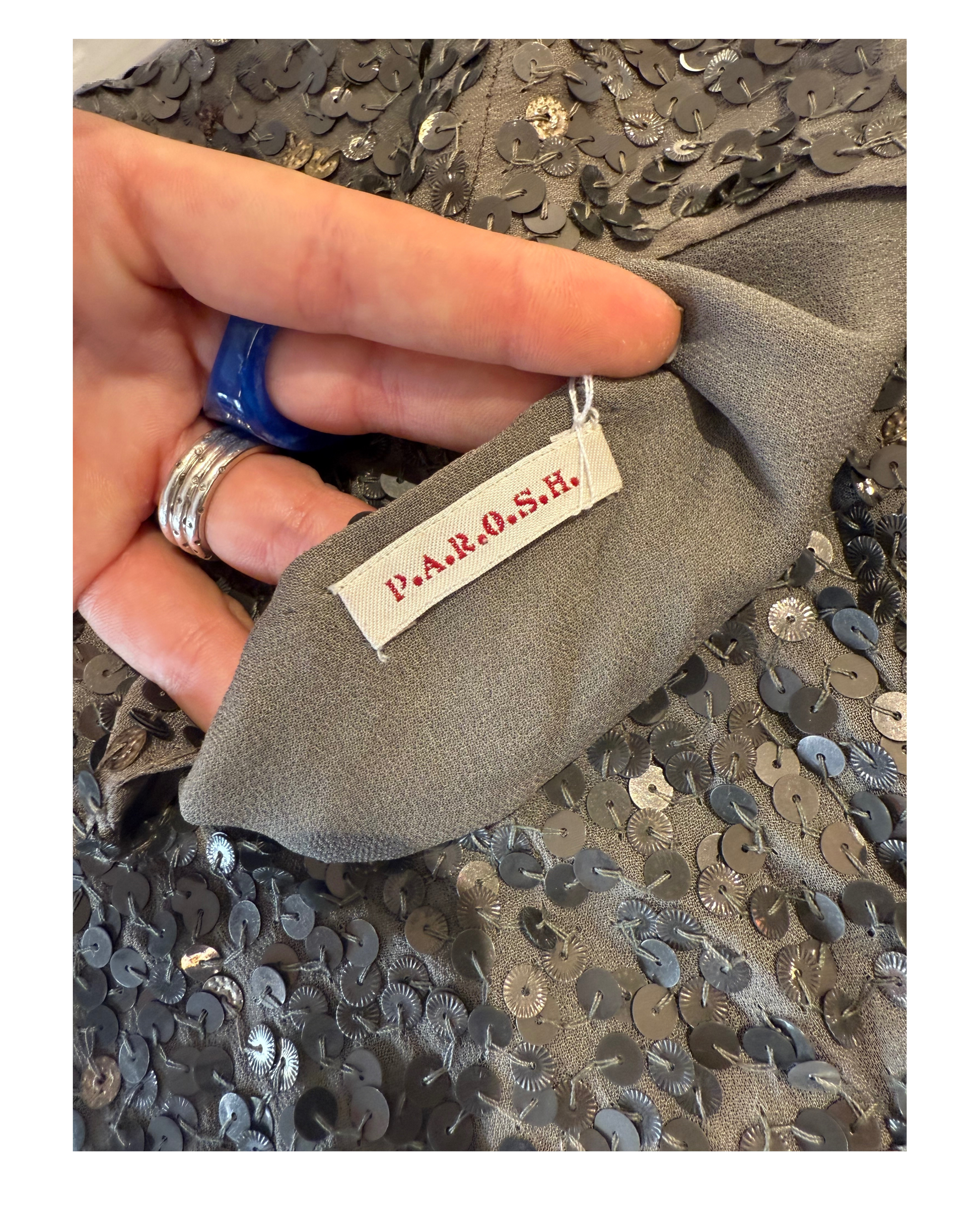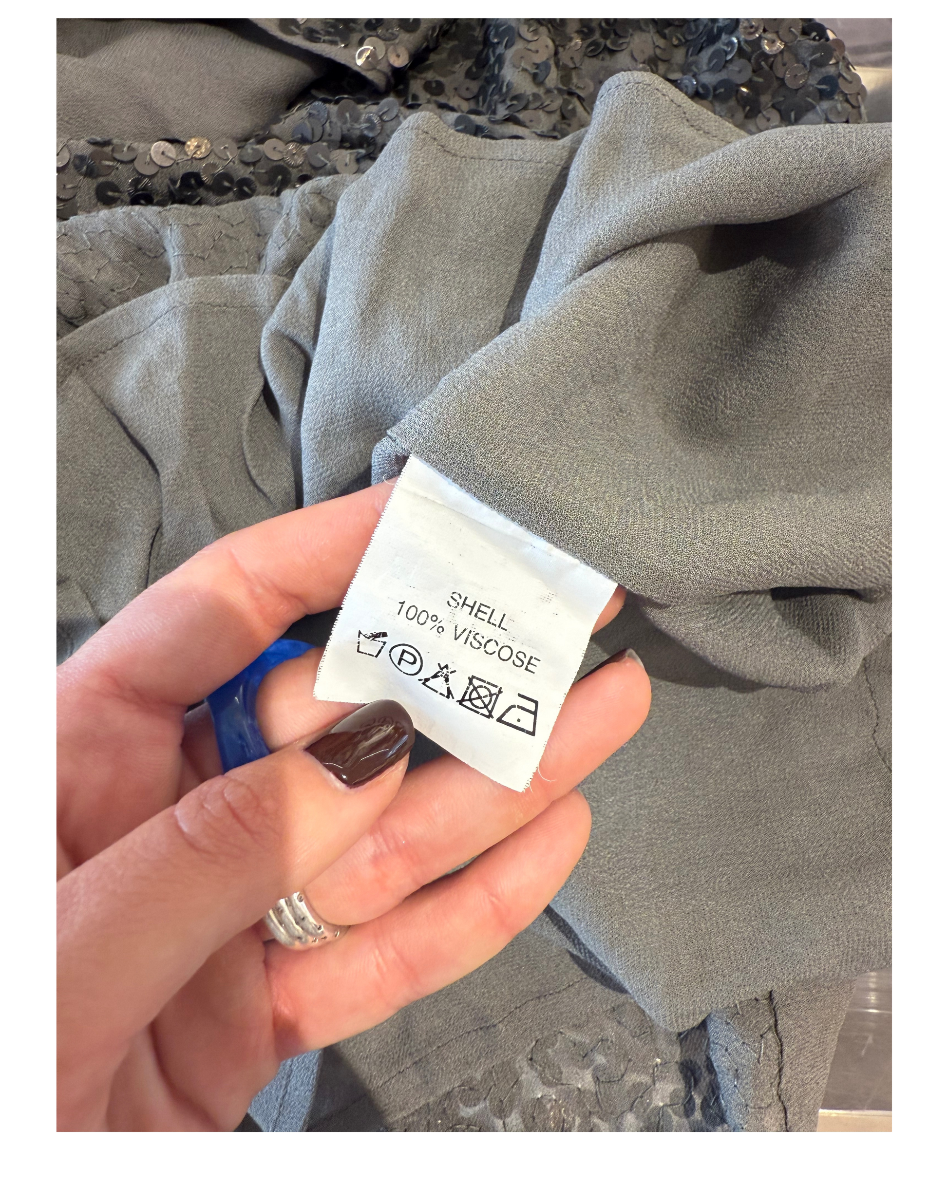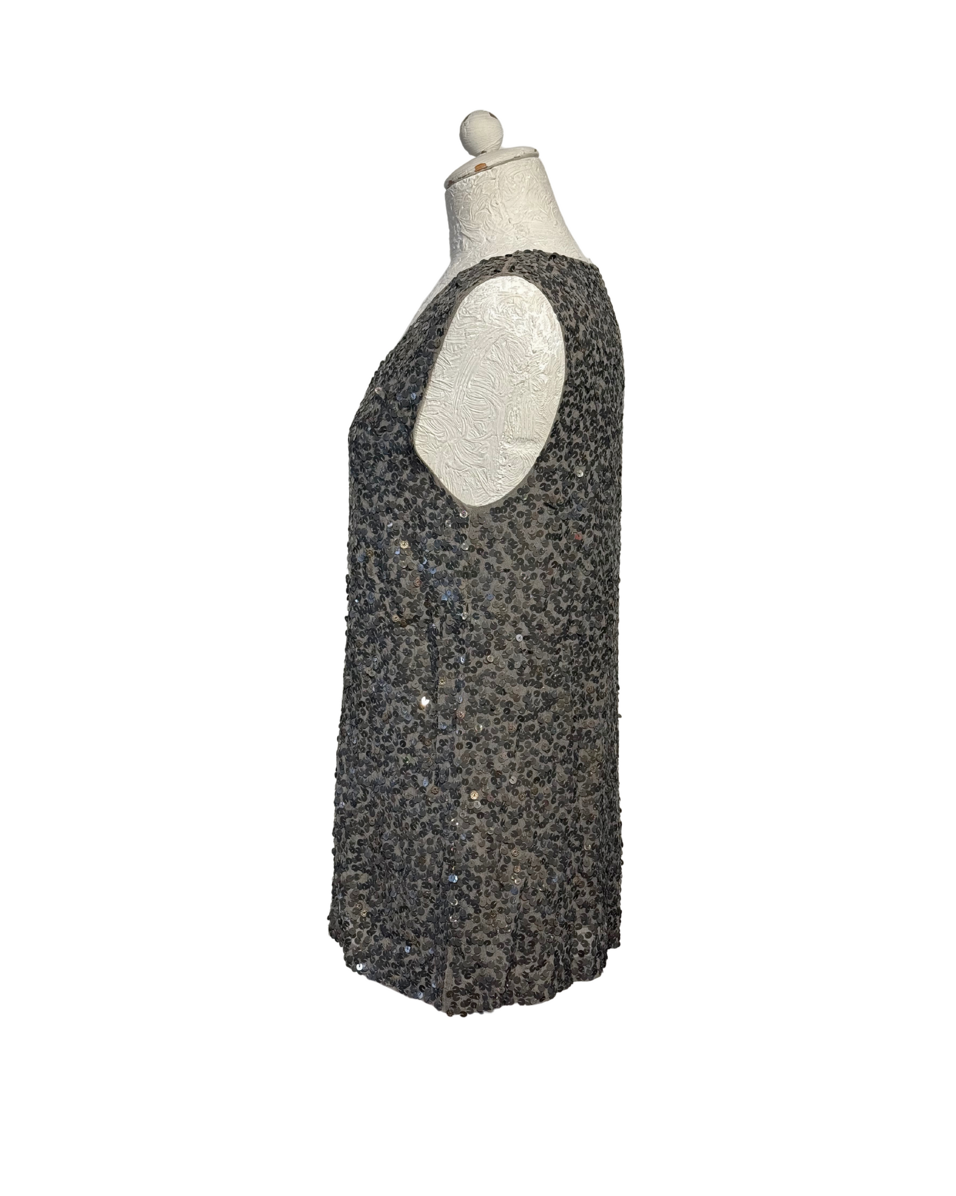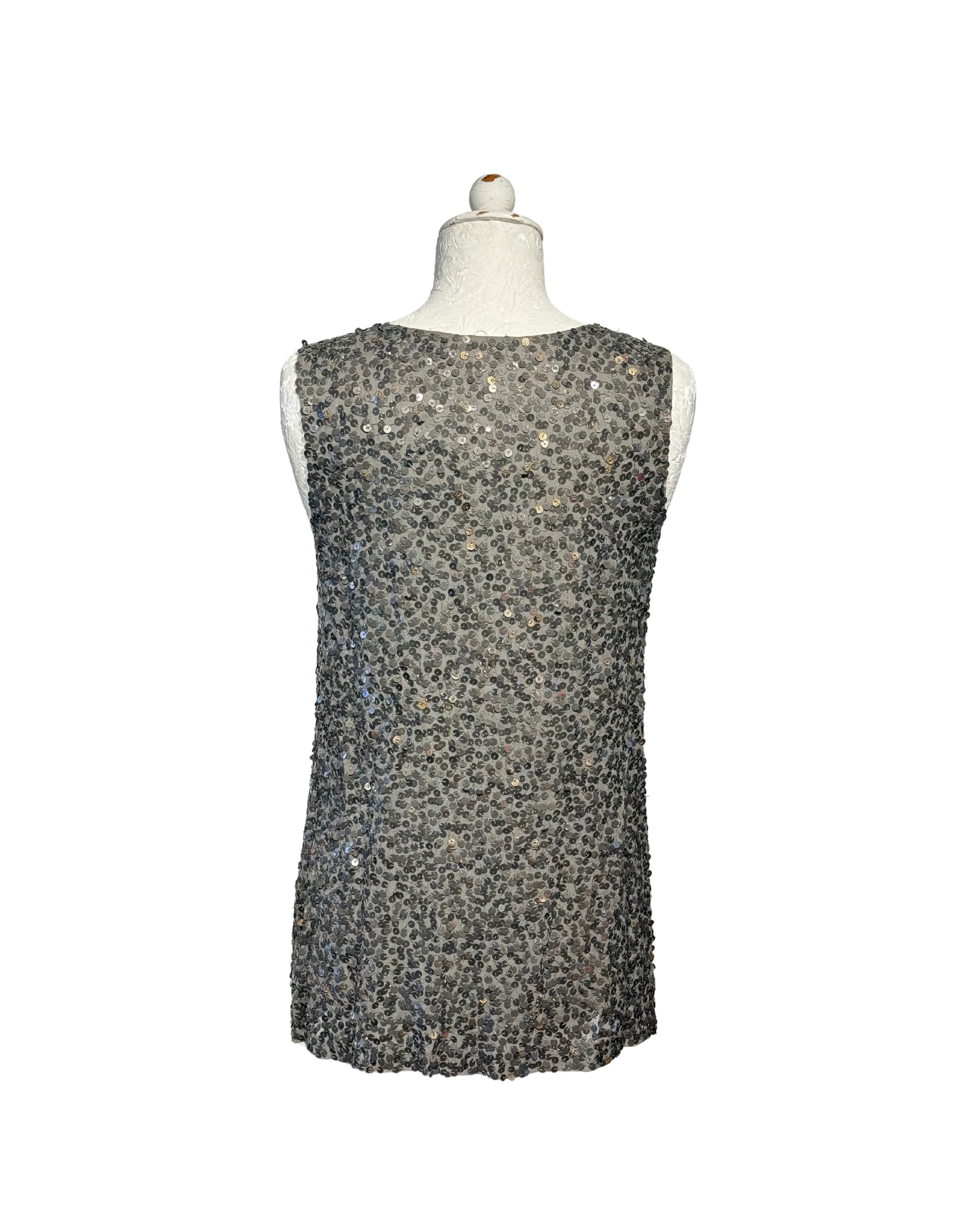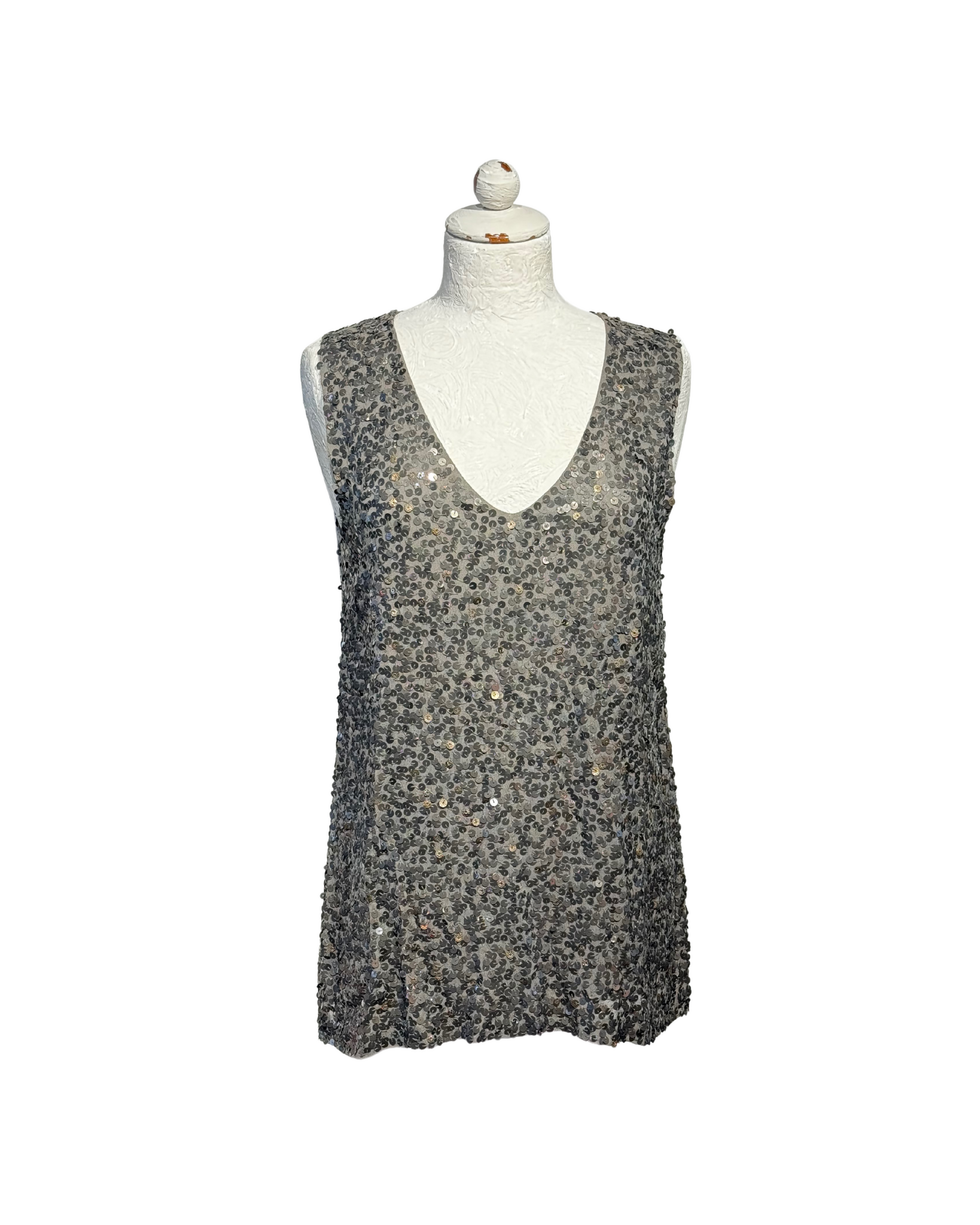 Brilla con eleganza: questo top smanicato con paillettes tono su tono che riflettono la luce con discrezione. Il taglio dritto e il profondo scollo a V sul davanti lo rendono un capo sofisticato e versatile, perfetto per una serata chic . 100% viscosa.Fodera interna in seta e rayon.