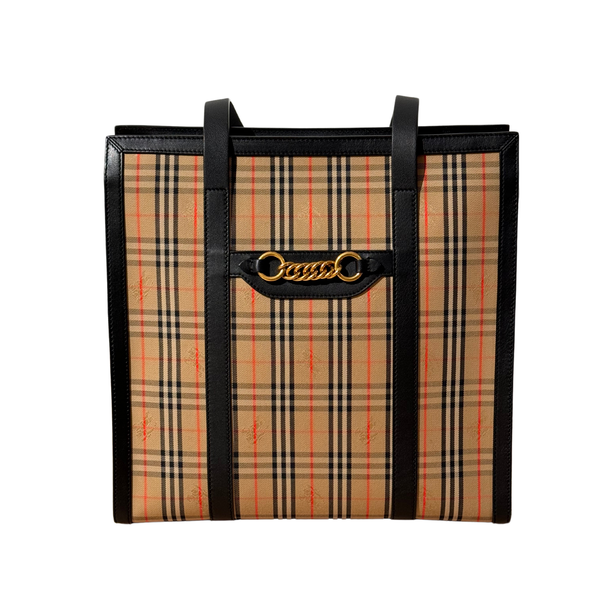 Borsa Tote Bah di Burberry , classico tartan e rifiniture in pelle di vitello liscia nera. Dettaglio dorato frontale. Apertura superiore con cerniera dorata. Interno in tessuto nero, tasca con cerniera. Doppi manici lunghi in pelle nera che consentono di indossarla comodamente a spalla.