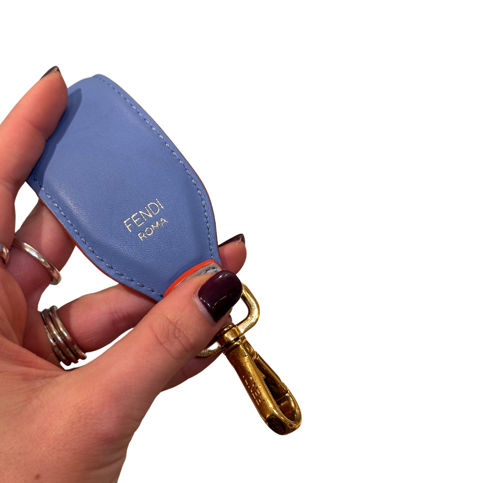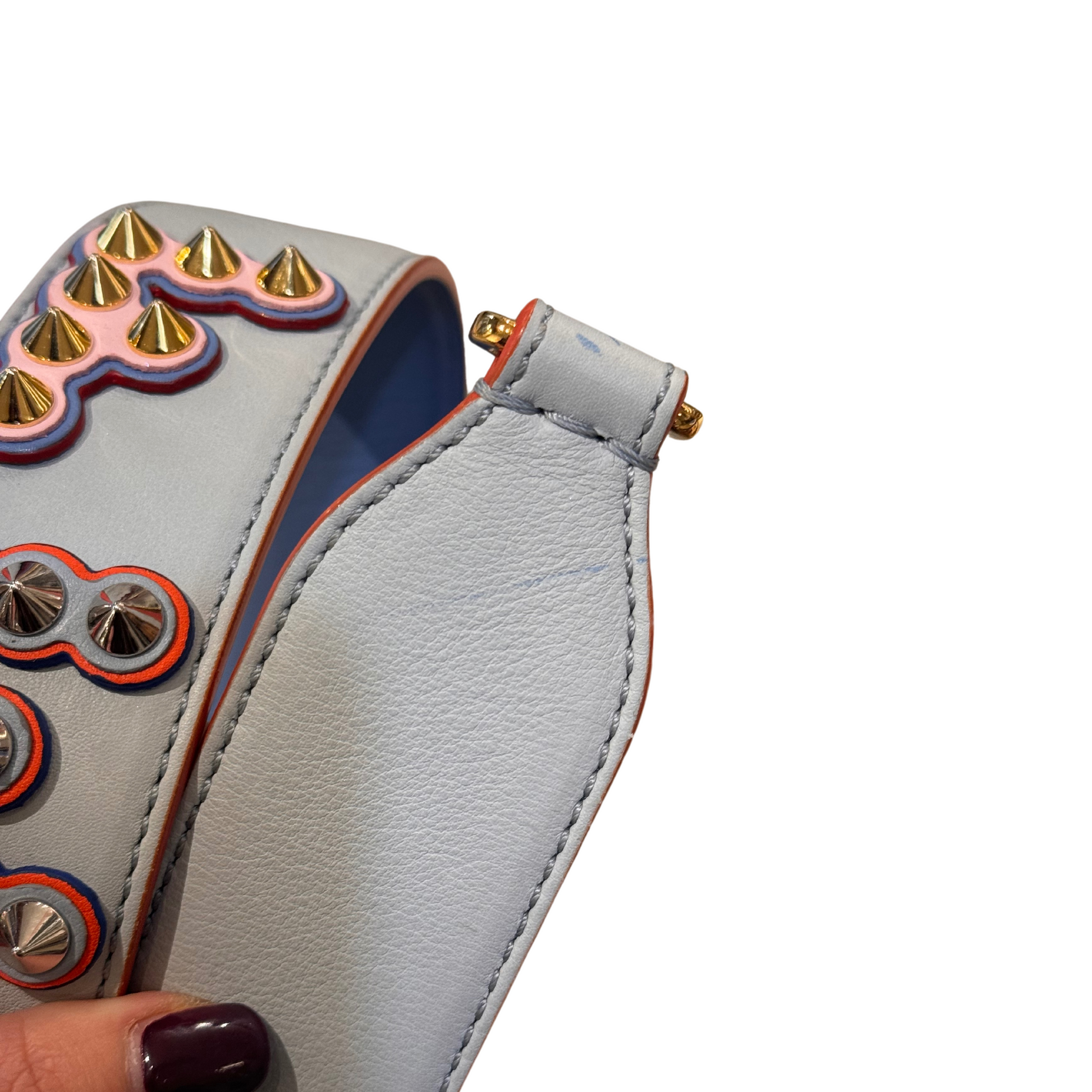 Tracolla in pelle di vitello liscia azzurra con scritta FENDI colorata impreziosita da borchie argentate. Parte interna tonalità più scura. Moschettoni dorati.