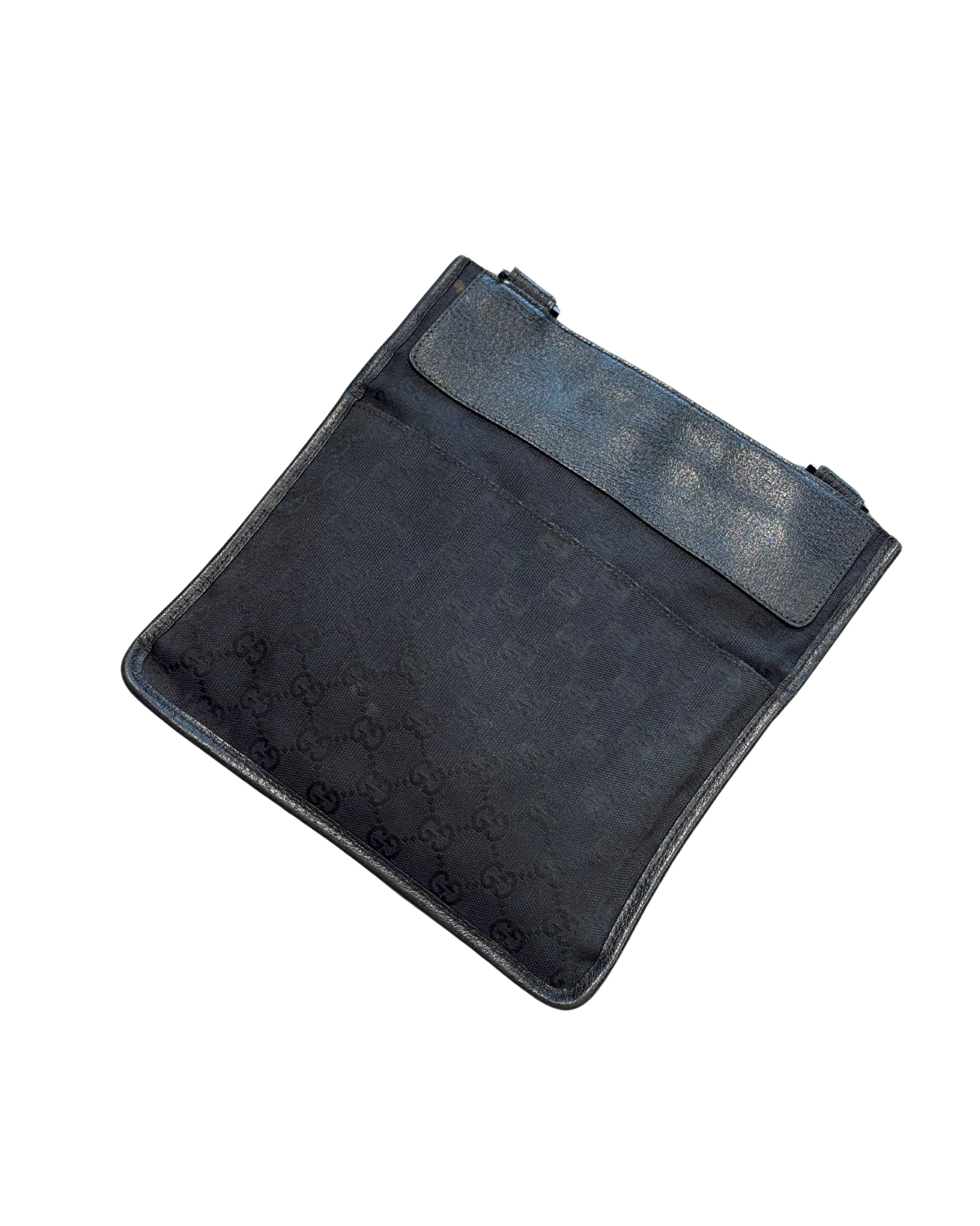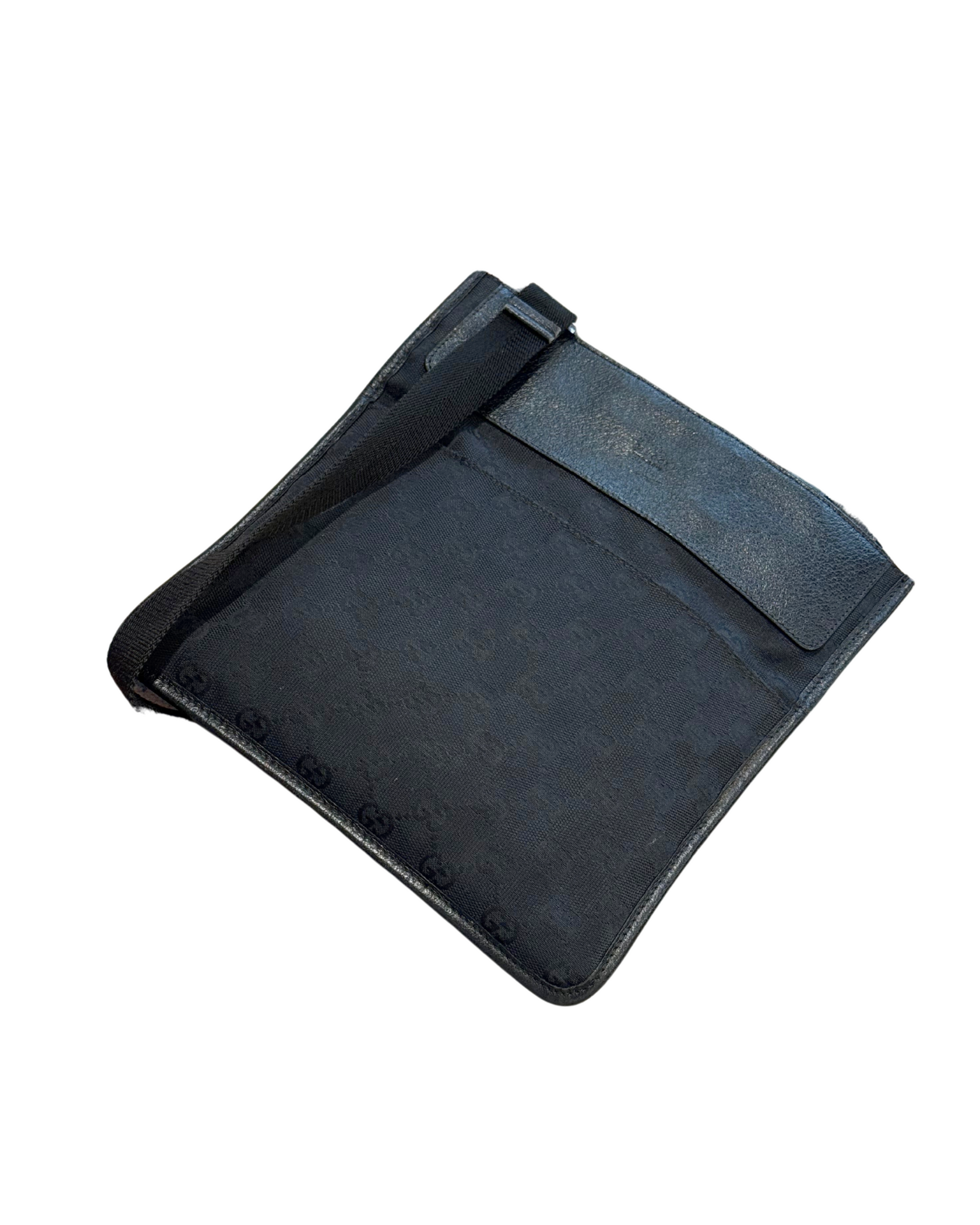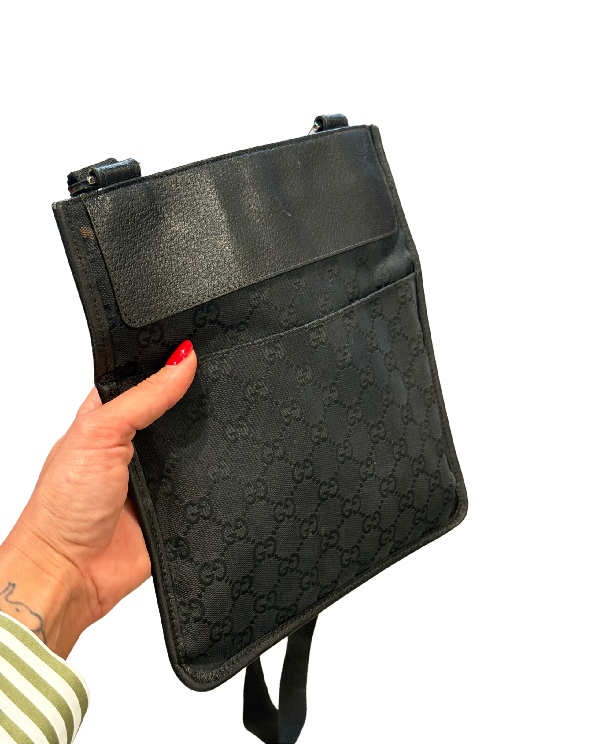 Tracolla di Gucci realizzata in tela nera con monogram tono su sono. Tracolla in tessuto regolabile nera. Tasca piatta esterna frontale. Apertura superiore con velcro. Interno in tessuto nero, tasca interna con cerniera. (codice: 27639 200047)