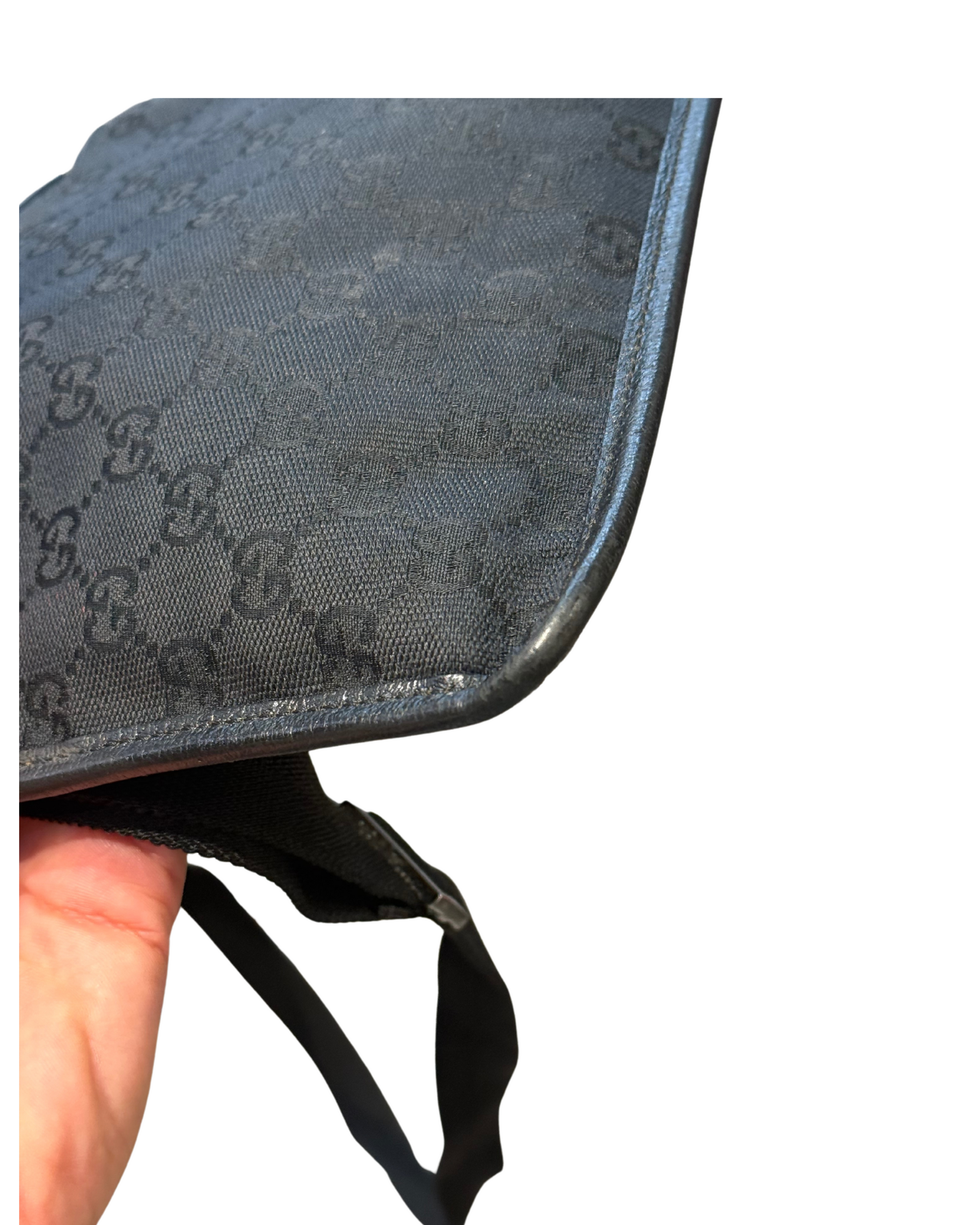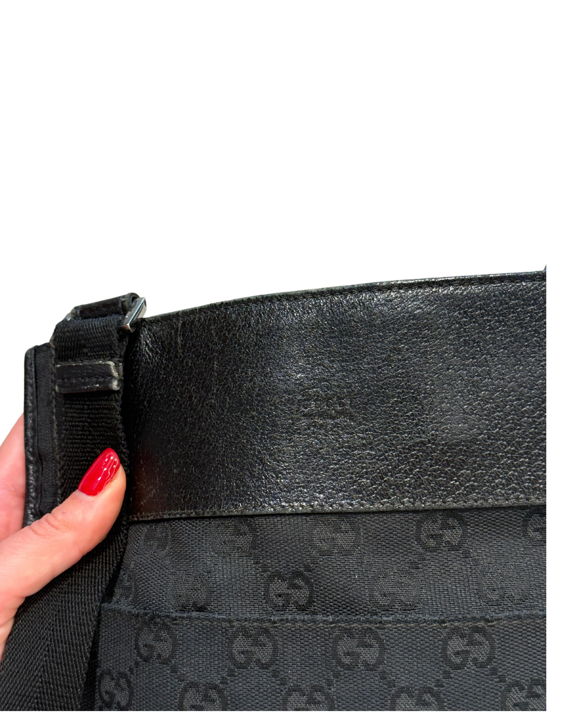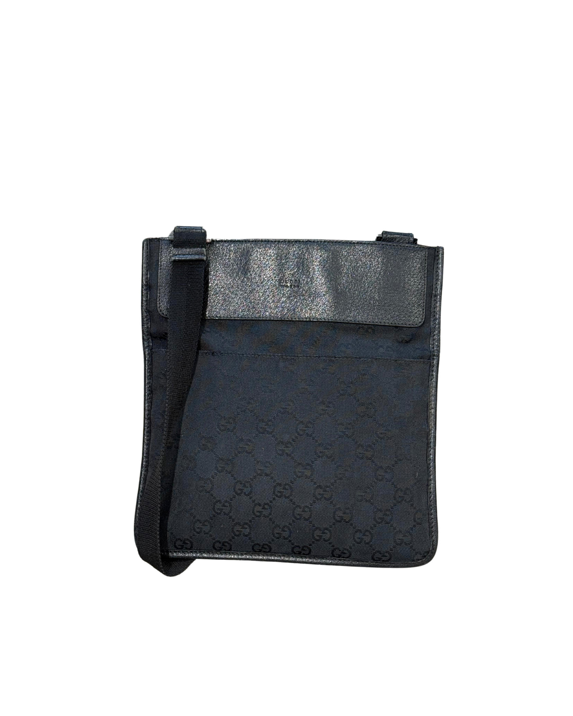 Tracolla di Gucci realizzata in tela nera con monogram tono su sono. Tracolla in tessuto regolabile nera. Tasca piatta esterna frontale. Apertura superiore con velcro. Interno in tessuto nero, tasca interna con cerniera. (codice: 27639 200047)