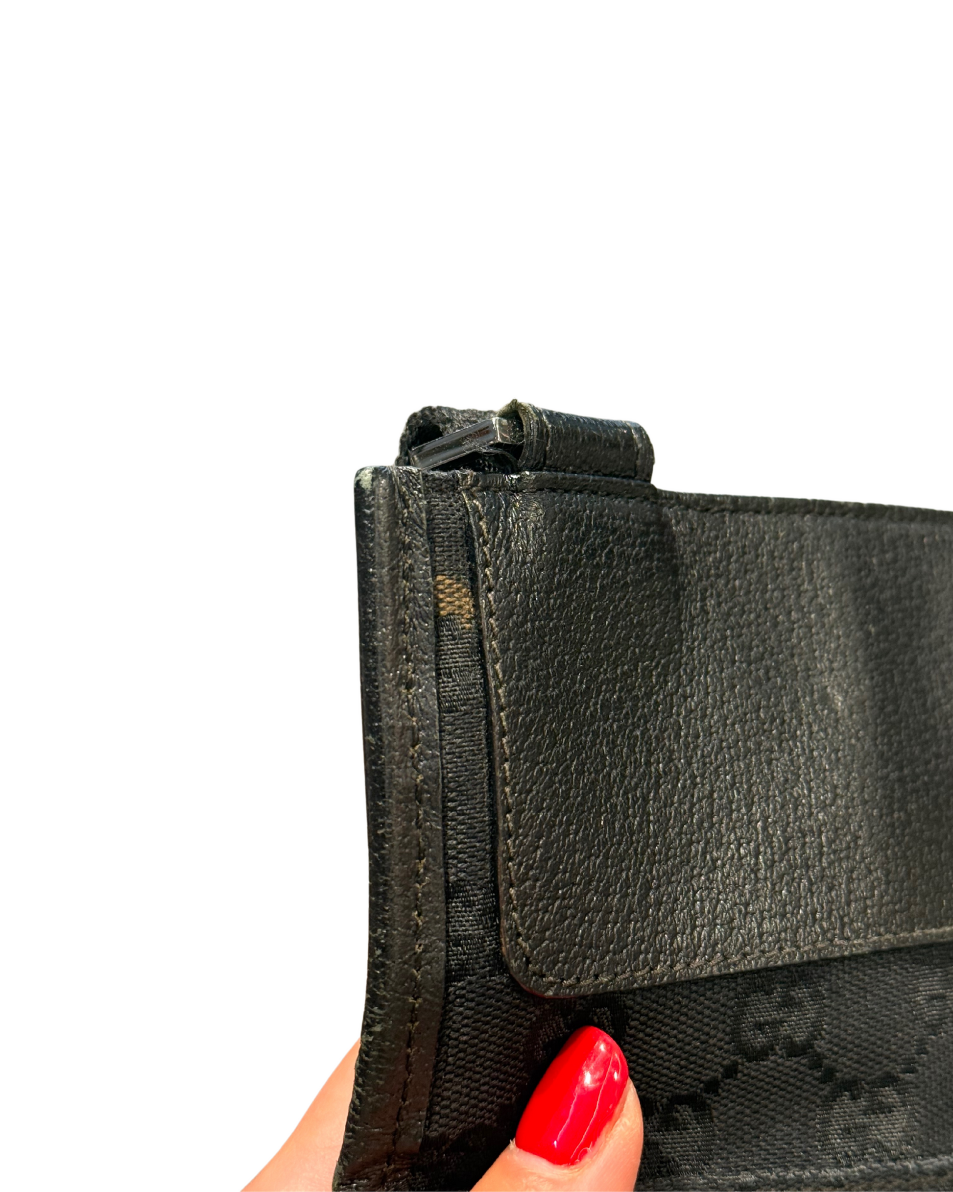 Condizioni: segni in corrispondenza delle rifiniture in pelle e nel canvas come da foto. Velcro interno leggermente rovinato.