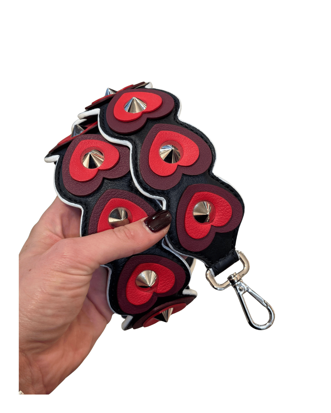 Questo modello si distingue per il suo design scenografico con cuori tridimensionali in rilievo, realizzati in pelle e sovrapposti in diverse tonalità di rosso, bordeaux e nero.