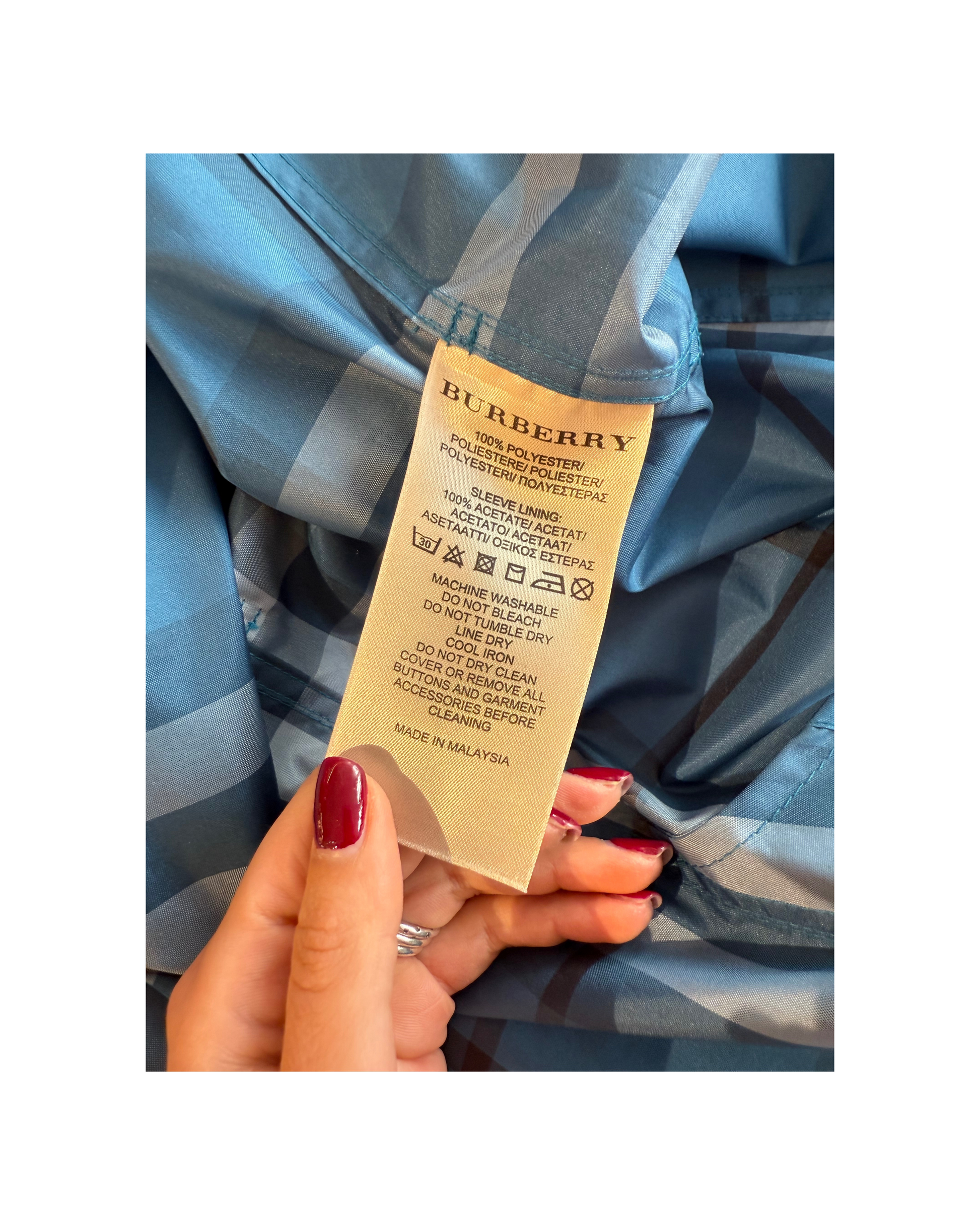 Trench corto doppiopetto di Burberry con cintura in vita per valorizzare la silhouette. Presenta le tipiche spalline militari. Motivo check tartan in diverse tonalità di blu , un design iconico rivisitato in una variante cromatica originale. Bottoni argentati con incisione maison.