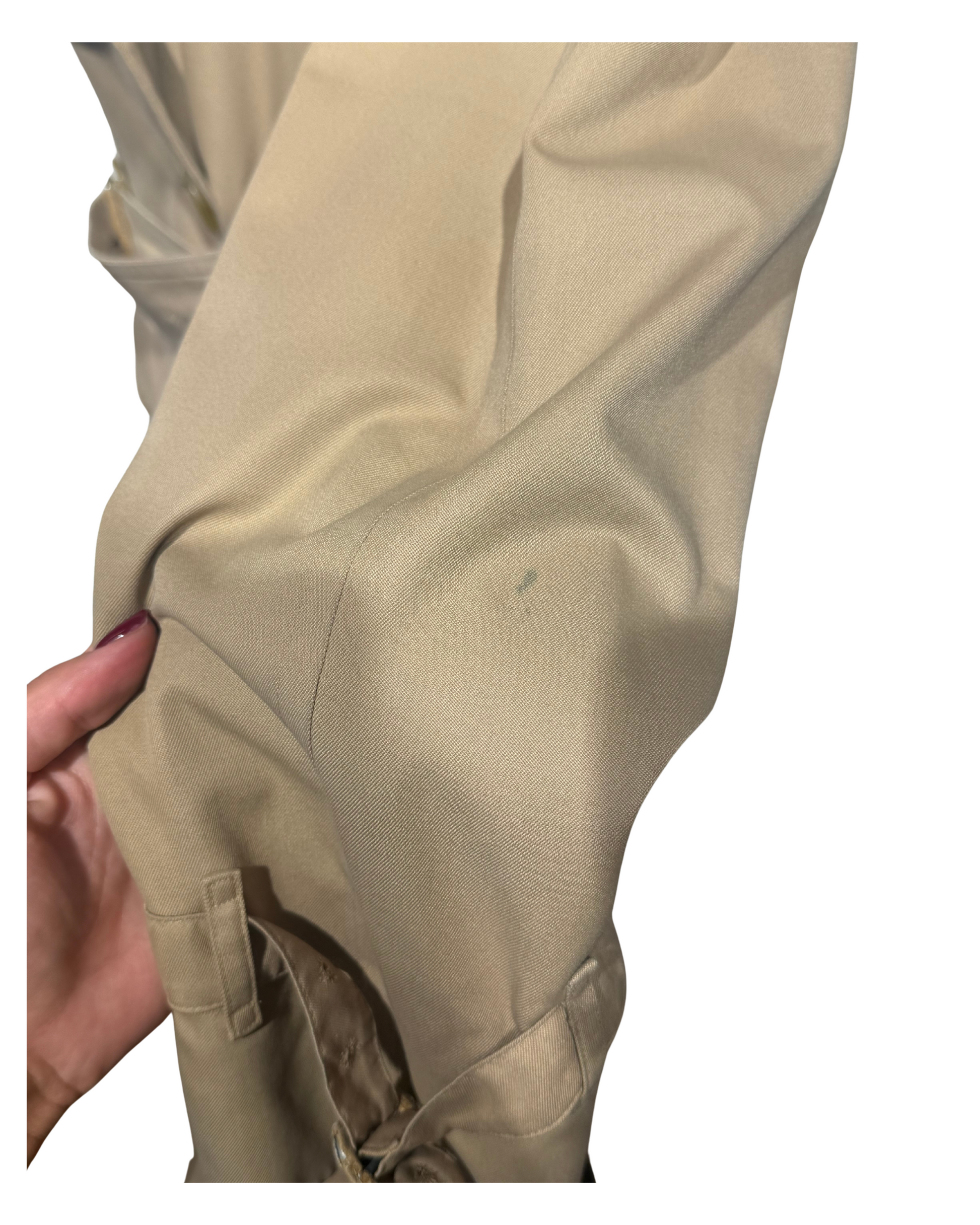 Confezionato in cotone misto poliestere, presenta l’inconfondibile fodera interna a check Burberry, cintura coordinata e dettagli classici come spalline, patta antipioggia e chiusura doppiopetto. All’interno non è presente la scritta della taglia, ma la vestibilità lo rende un capo unisex, ideale per una M da uomo o una L da donna.