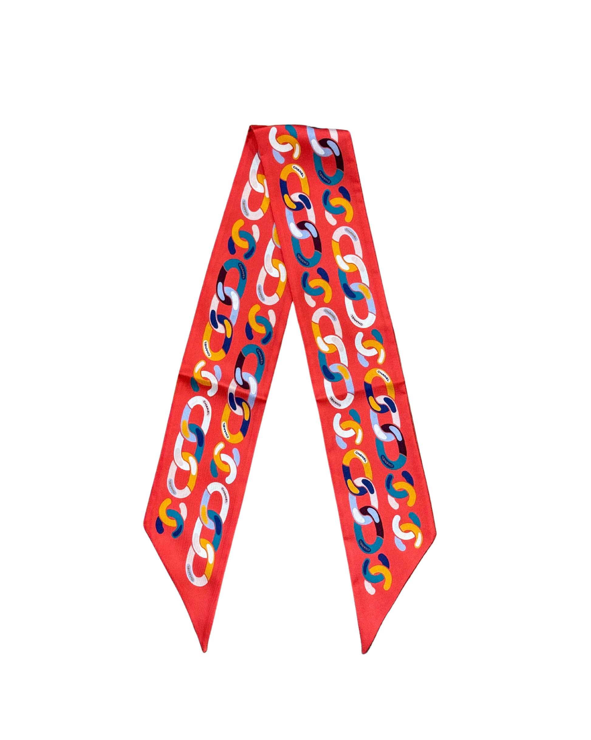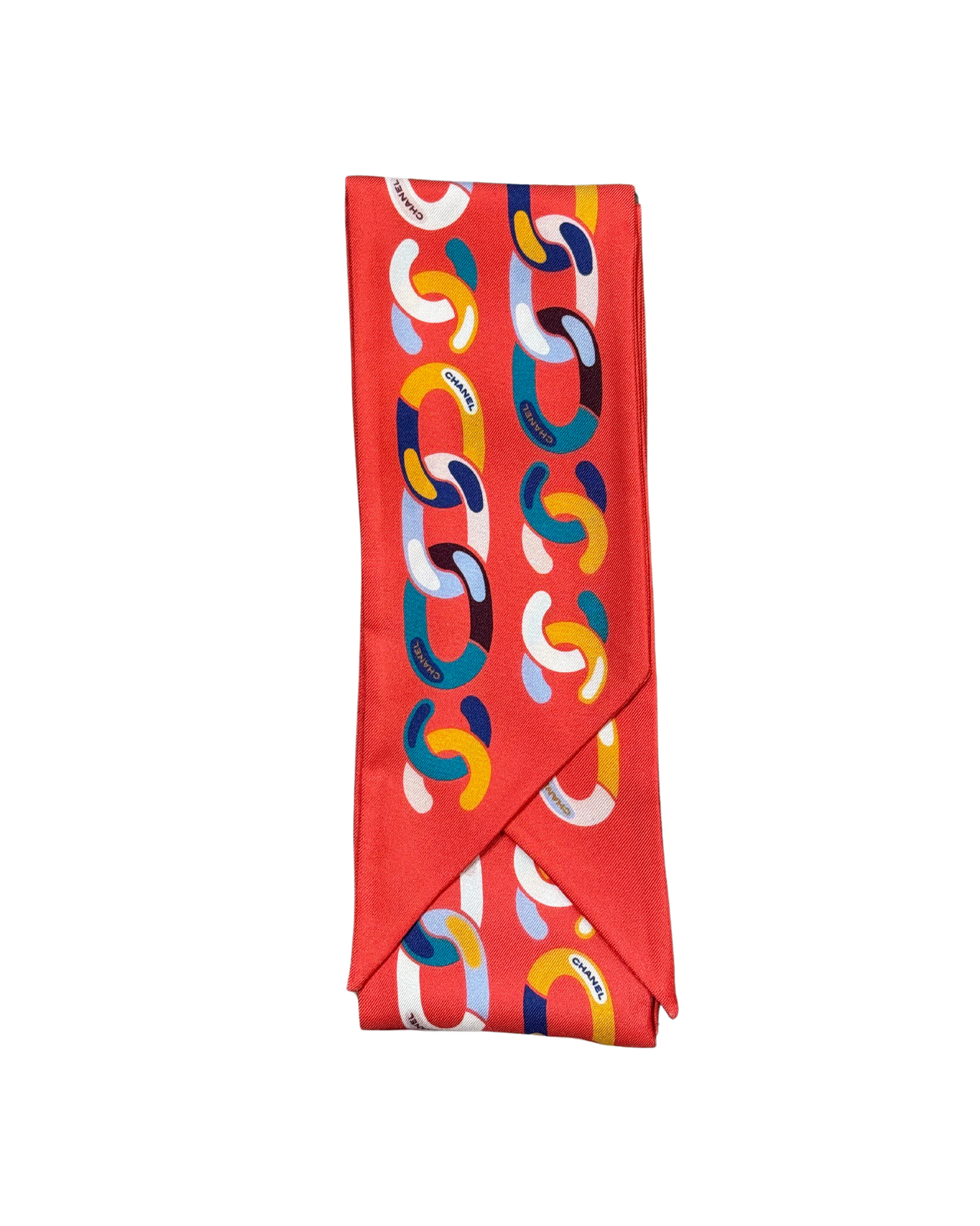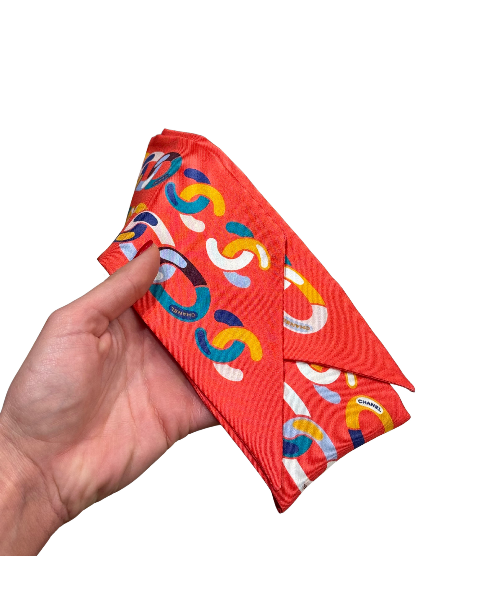 Twilly di Chanel che si può utilizzare sia attaccato alla borsa, al collo o come fascia per i capelli. La palette cromatica include toni accesi di rosso, giallo, blu, arancione e bianco. Logo Chanel integrato nel pattern. 100% Seta