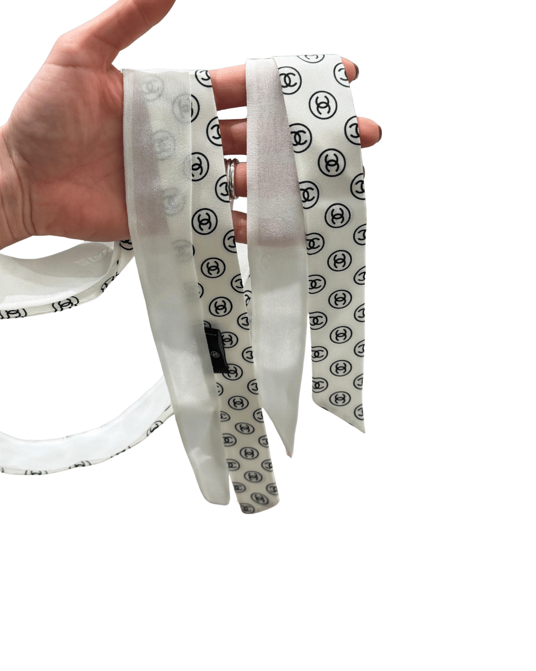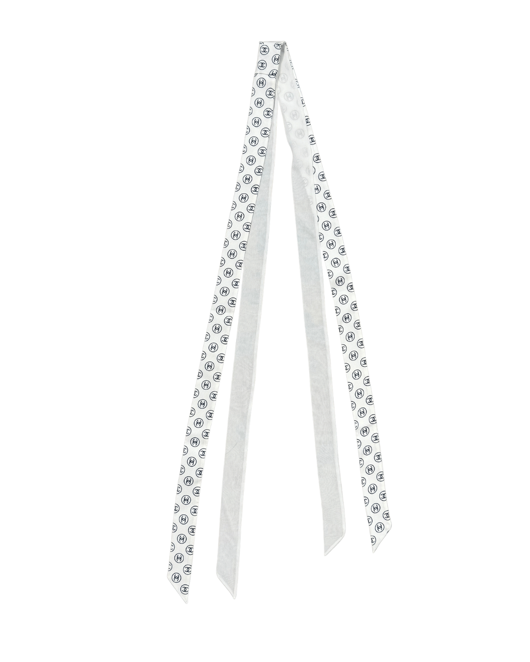 Un Twilly Chanel particolare e ricercato: un unico accessorio lungo, composto da due strisce di seta cucite insieme, ognuna con doppia finitura. Da un lato la seta bianca semitrasparente, leggerissima e luminosa; dall’altro la stampa iconica Chanel con cerchi e doppia C nera.
