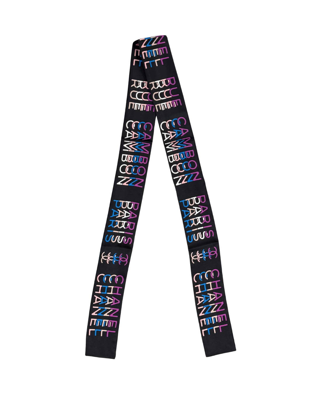 Questo twilly Chanel in seta 100%, realizzato in Italia, è un accessorio iconico e super contemporaneo. La base nera fa da sfondo a una stampa grafica multicolor con il logo Chanel ripetuto in tonalità vibranti di rosa, azzurro, lilla e bianco, per un effetto moderno e deciso. Può essere indossato al collo, tra i capelli, come bracciale oppure annodato al manico della borsa per personalizzare anche il look più essenziale.