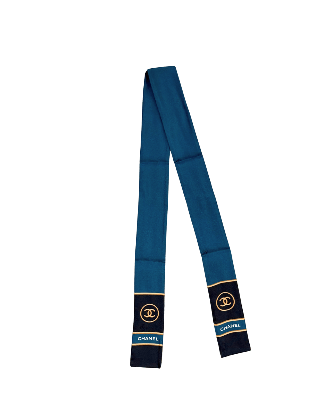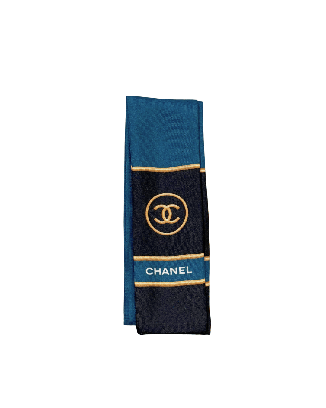 Elegante twill Chanel realizzato in 100% seta, proposta in una raffinata tonalità di blu petrolio con inserti neri e dettagli dorati. Il design essenziale è impreziosito dall’iconico logo CC e dalla firma Chanel, per un accessorio riconoscibile ma estremamente sofisticato. Perfetto al collo, annodata come cintura, tra i capelli o come dettaglio chic su borse e manici.