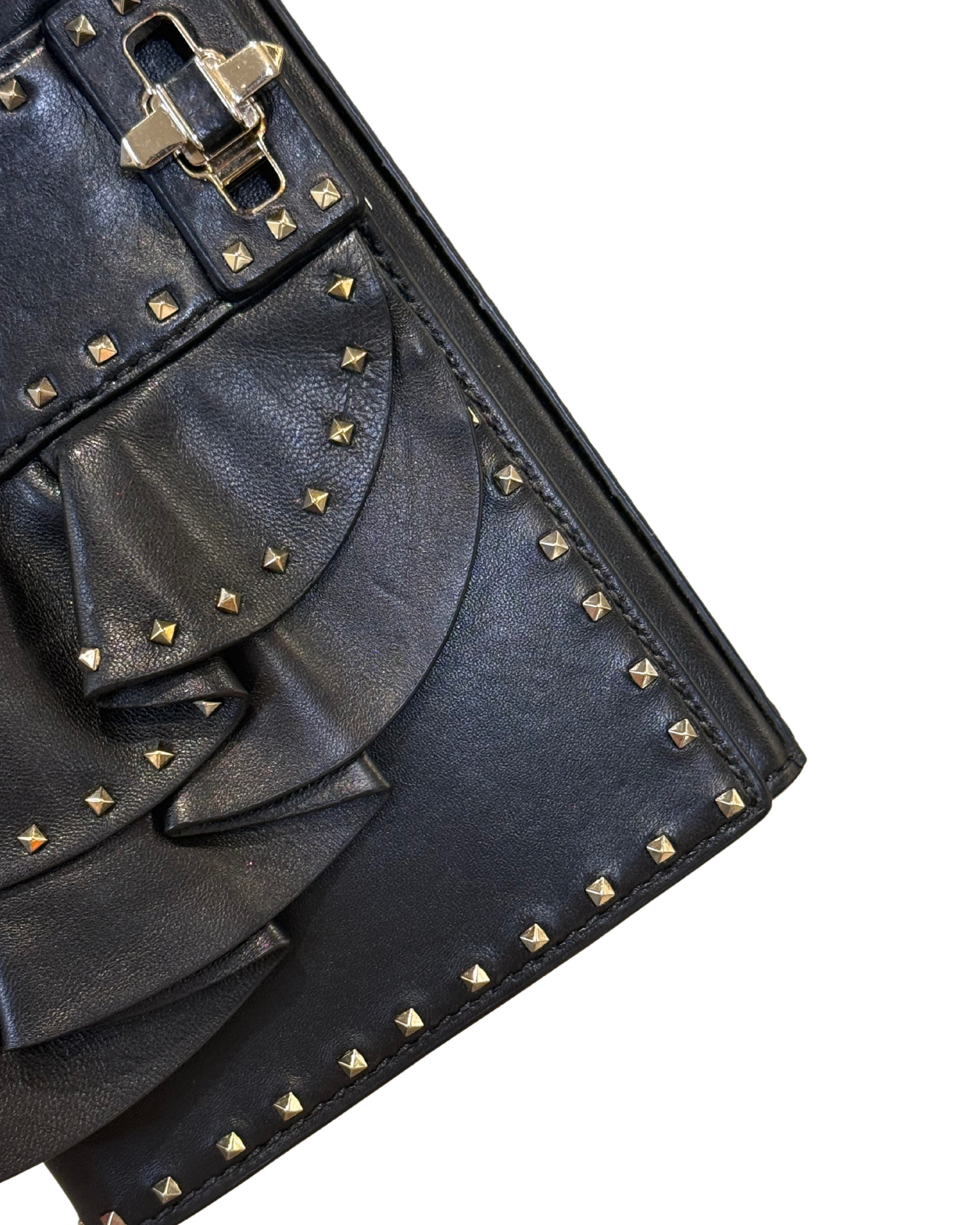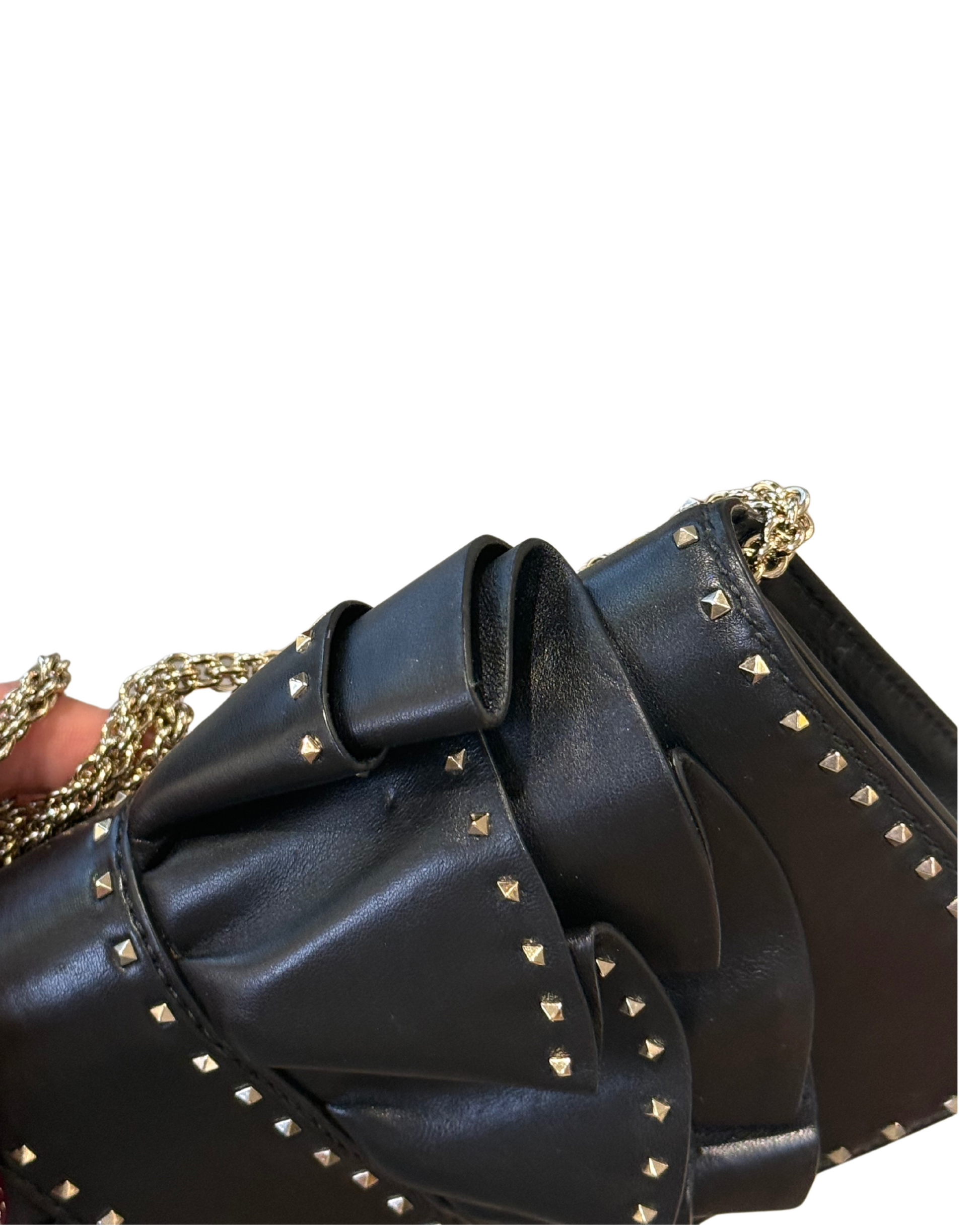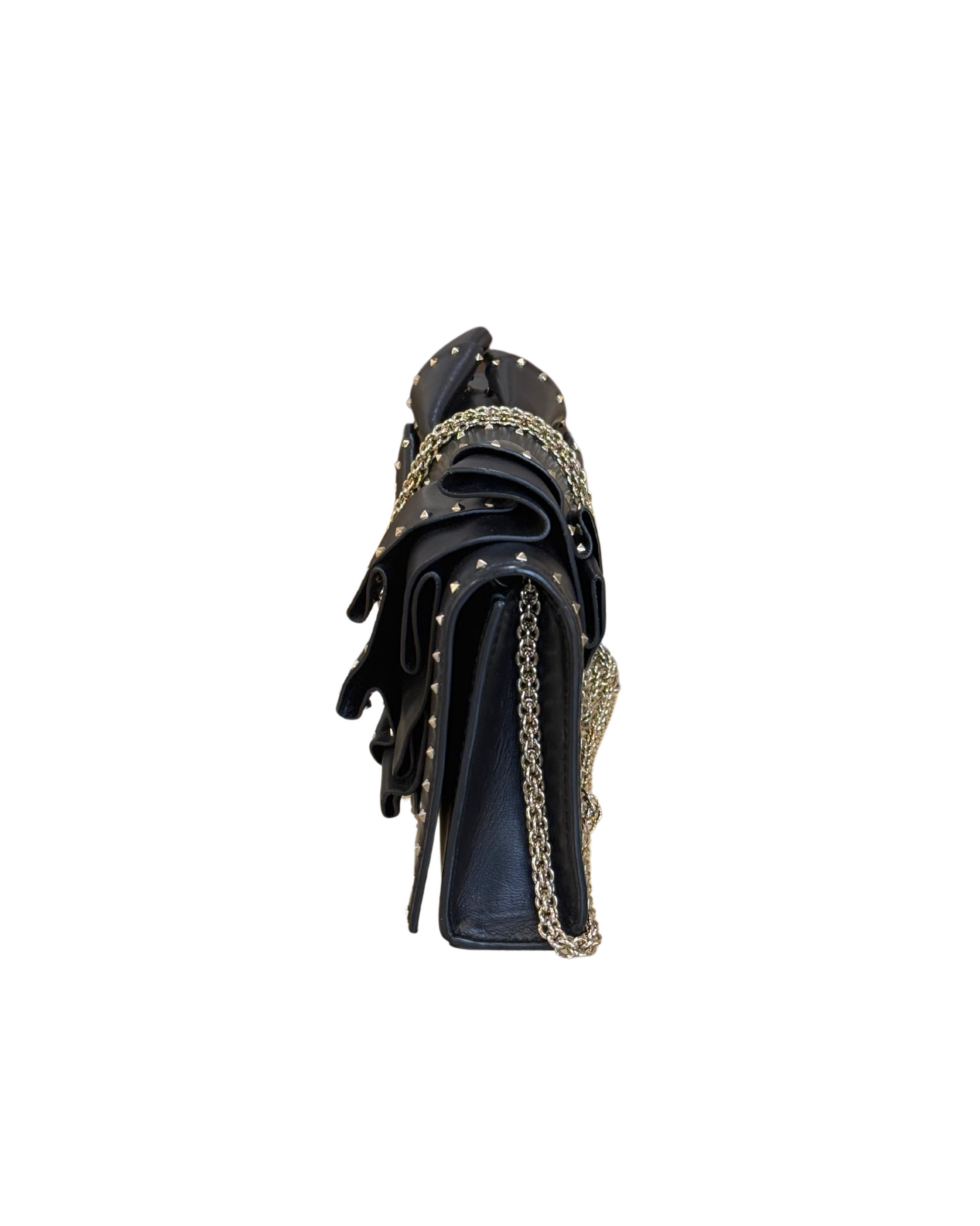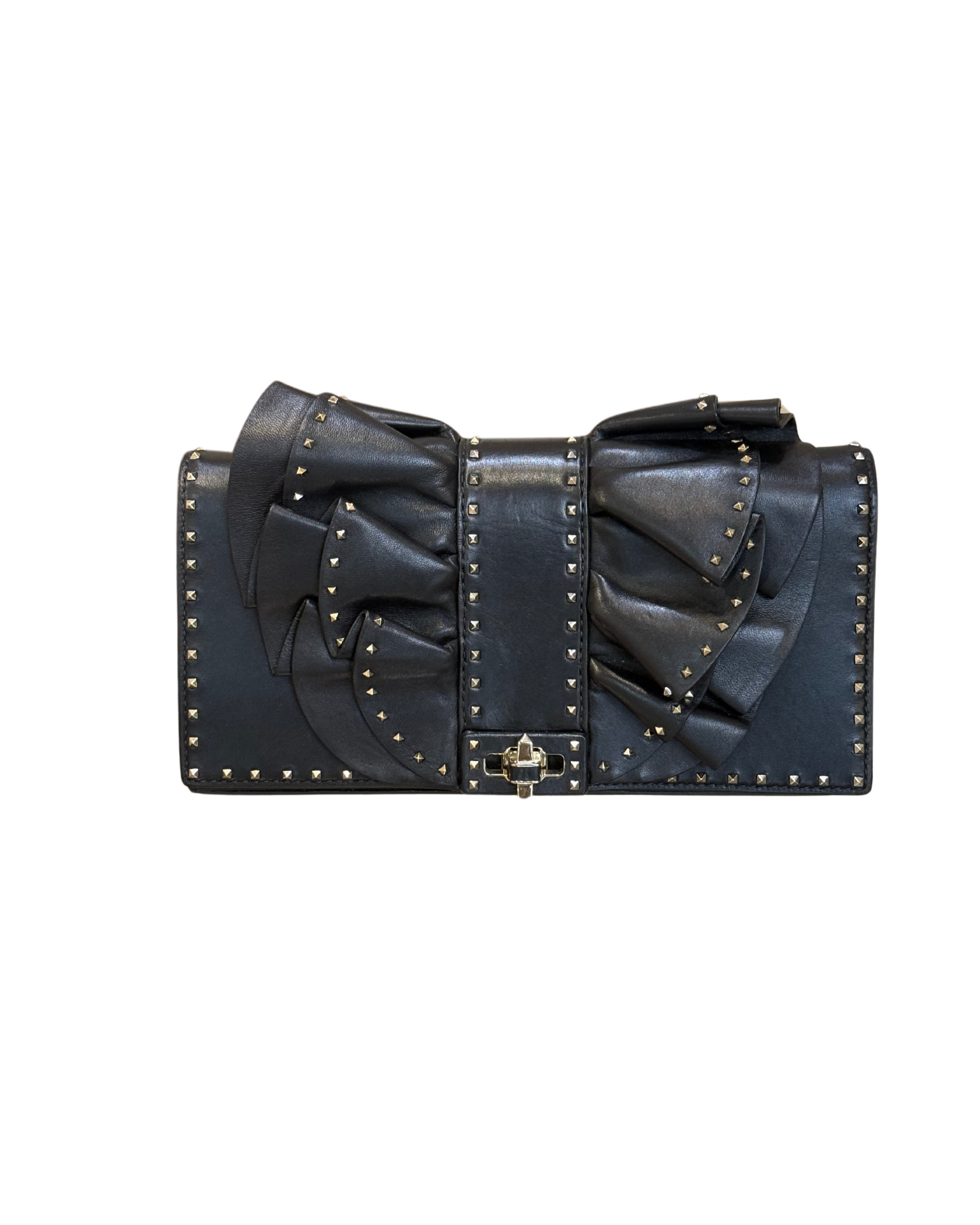 La Very V ruffle di Valentino è realizzata in pelle nera liscia, impreziosita da maxi fiocchi a effetto ruffle decorati con le iconiche borchie Rockstud. Un modello strutturato e sofisticato, completato da una tracolla a catena che consente di indossarla sia a spalla sia a tracolla ma anche a mano.