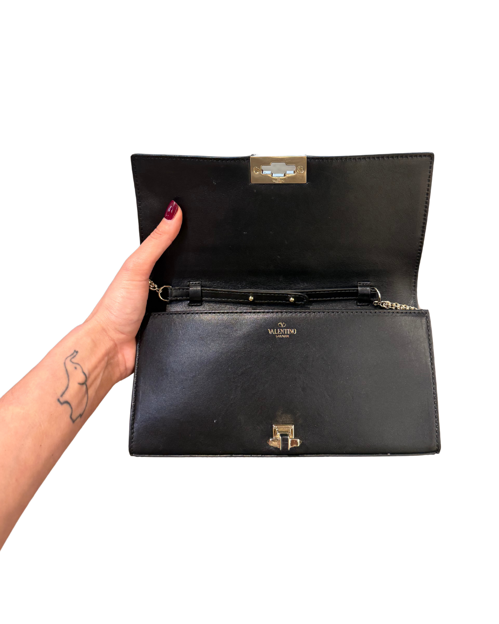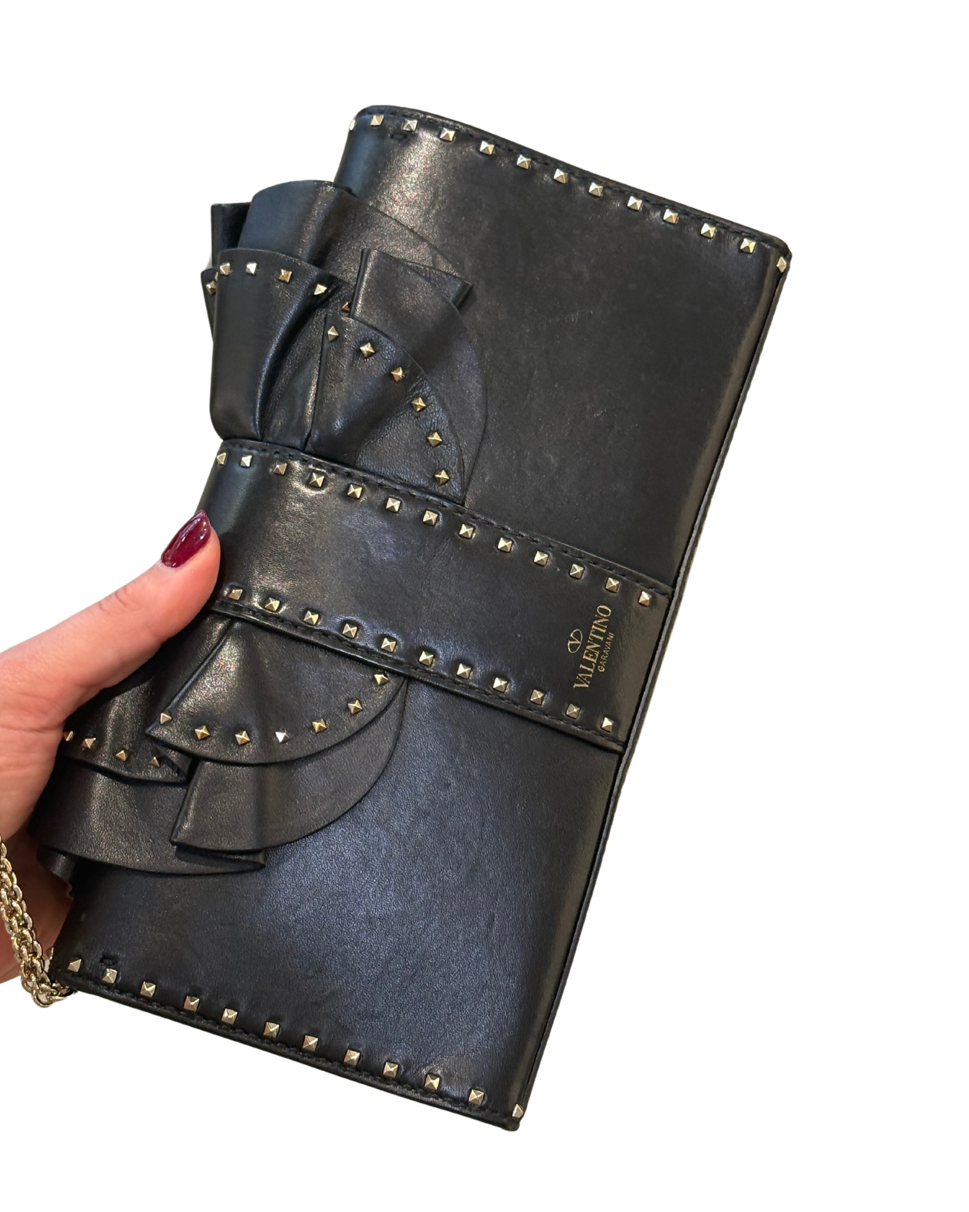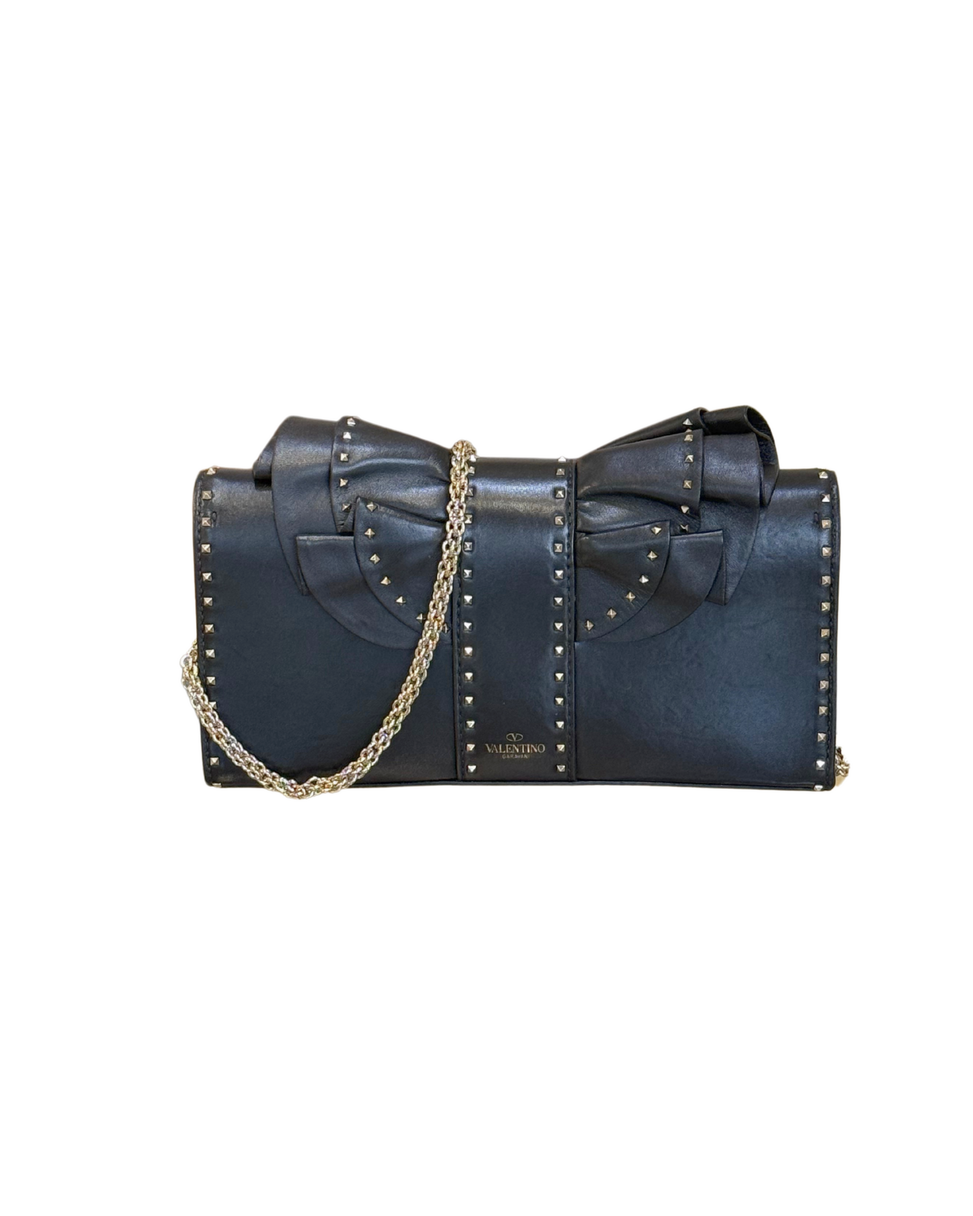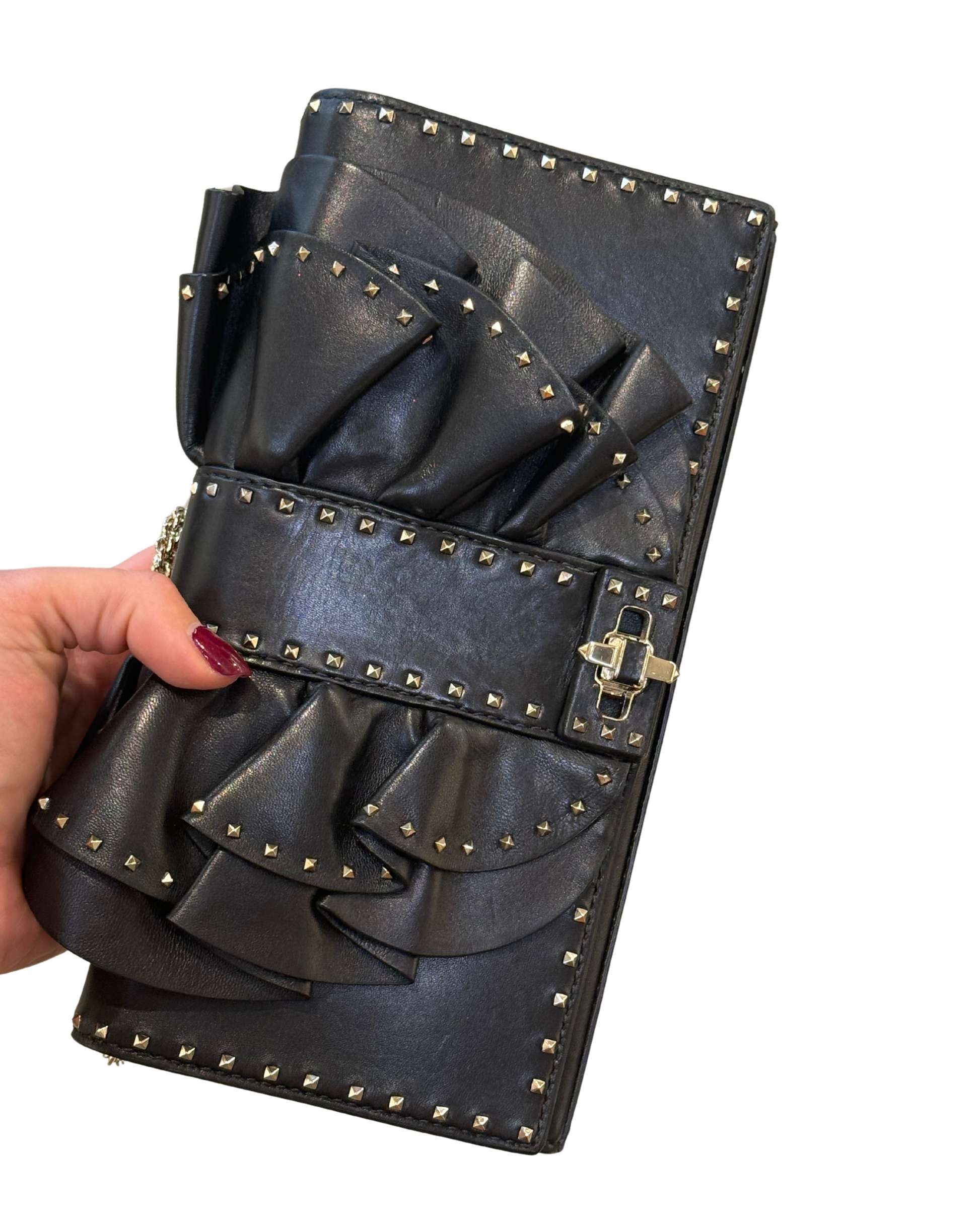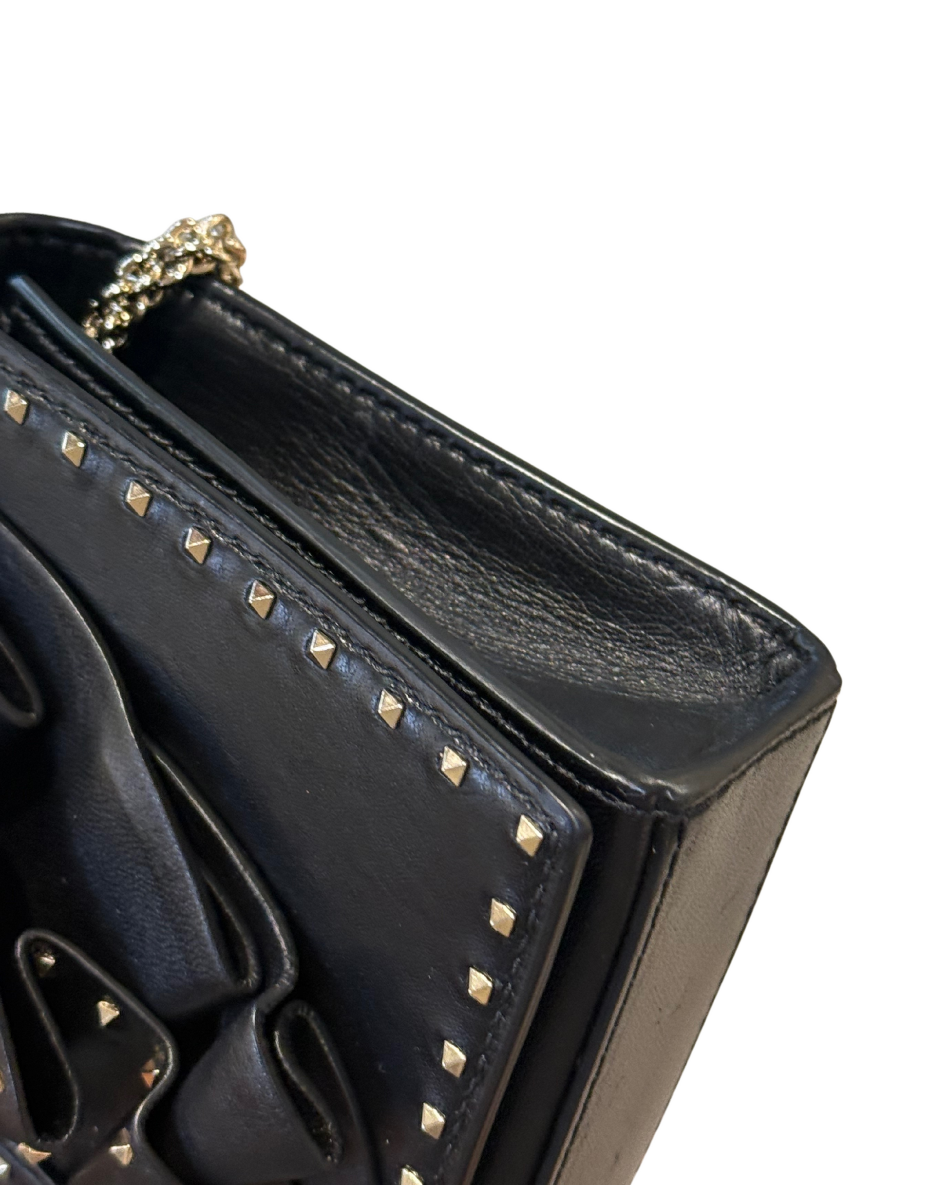 La Very V ruffle di Valentino è realizzata in pelle nera liscia, impreziosita da maxi fiocchi a effetto ruffle decorati con le iconiche borchie Rockstud. Un modello strutturato e sofisticato, completato da una tracolla a catena che consente di indossarla sia a spalla sia a tracolla ma anche a mano.