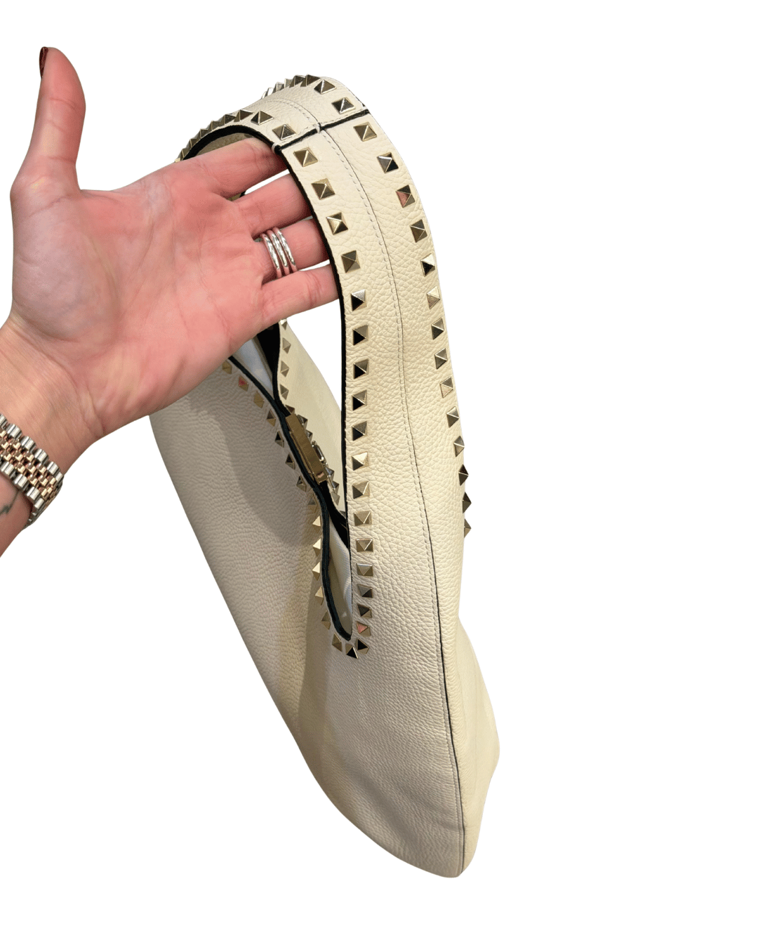 Borsa Valentino Garavani modello Hobo, realizzata in morbida pelle martellata color crema, una tonalità luminosa e sofisticata perfetta in ogni stagione. La silhouette morbida e capiente la rende ideale per l’uso quotidiano, mantenendo sempre un’eleganza estremamente chic. Il design è impreziosito dalle iconiche borchie Rockstud lungo il profilo e sul manico, dettaglio distintivo della Maison, abbinate a finiture metalliche e chiusura frontale con gancio elegante e raffinato. Interno foderato in tessuto scuro con tasca con zip e label Valentino Garavani.