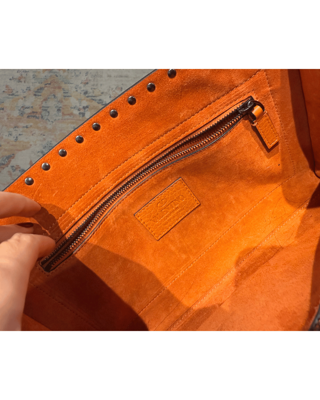 Iconica e decisa, questa tote Valentino Garavani in pelle martellata arancione racchiude tutta l’eleganza grintosa della Maison. Il profilo è decorato dalle inconfondibili borchie Rockstud in metallo brunito, che definiscono la silhouette con carattere e personalità. Dotata di doppio manico rigido e tracolla regolabile e removibile, si adatta perfettamente sia all’uso quotidiano che alle occasioni più raffinate. L’interno, foderato in pelle scamosciata tono su tono, è suddiviso in due scomparti da una tasca con cerniera.
