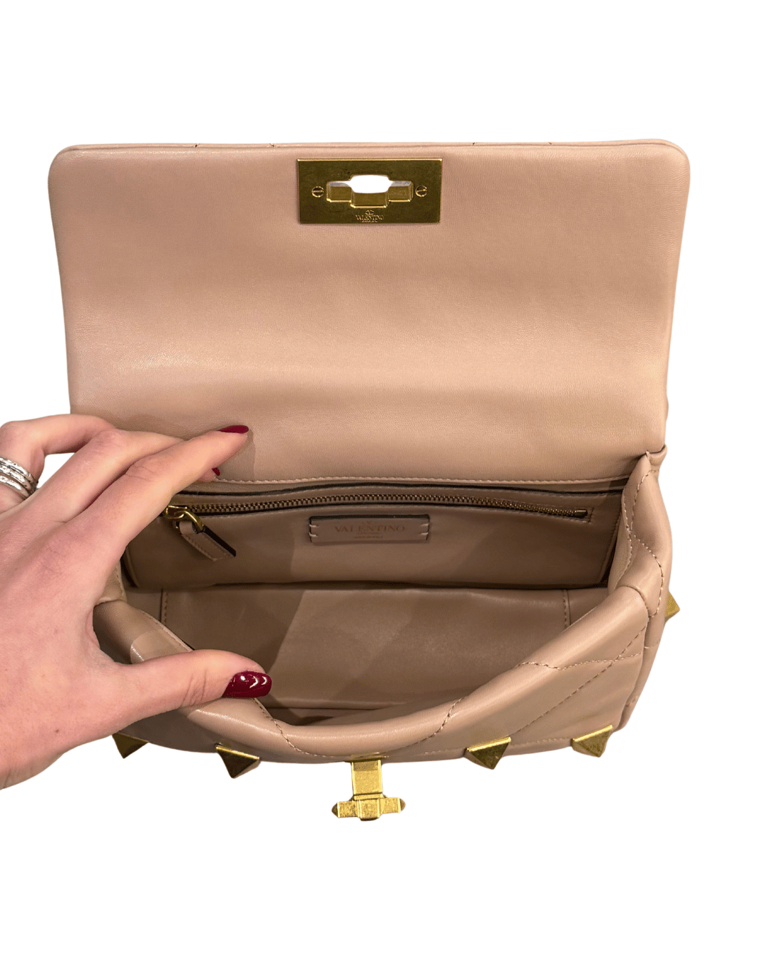 Borsa Valentino Garavani modello Roman Stud in pelle rosa cipria, misura media, un’icona contemporanea della Maison che unisce eleganza senza tempo e carattere deciso. La silhouette strutturata è impreziosita dalla lavorazione trapuntata e dalle maxi borchie signature in finitura dorata anticata, dettaglio distintivo e immediatamente riconoscibile. La chiusura frontale con girello dorato dona un tocco raffinato e rende il design ancora più prezioso. La catena in metallo dorato permette di indossarla comodamente a spalla o crossbody, perfetta sia di giorno che nelle occasioni più speciali. Il manico in pelle consente di indossarla a mano. Interno in pelle tono su tono, tasca piatta.